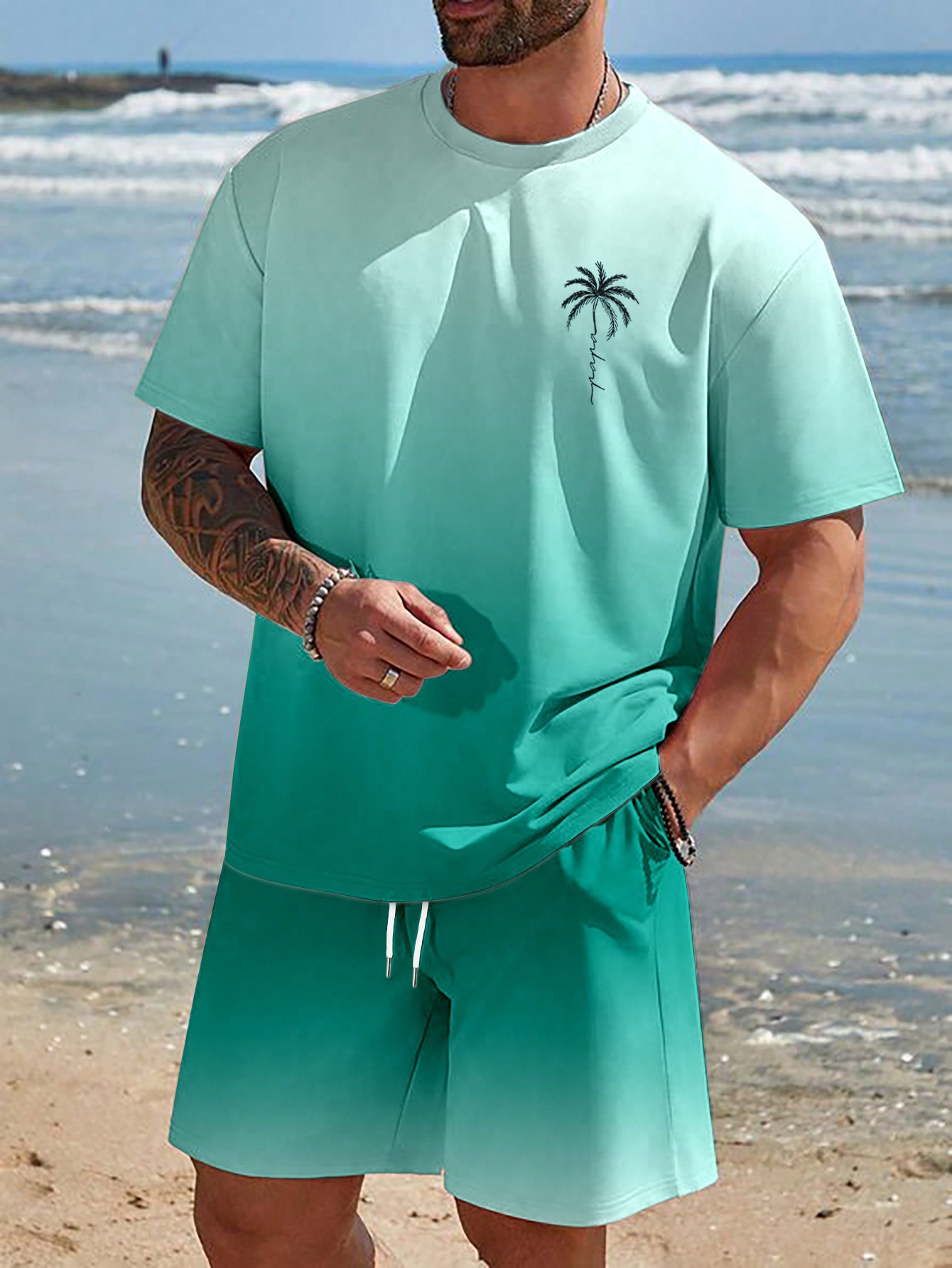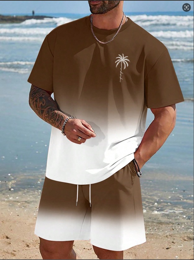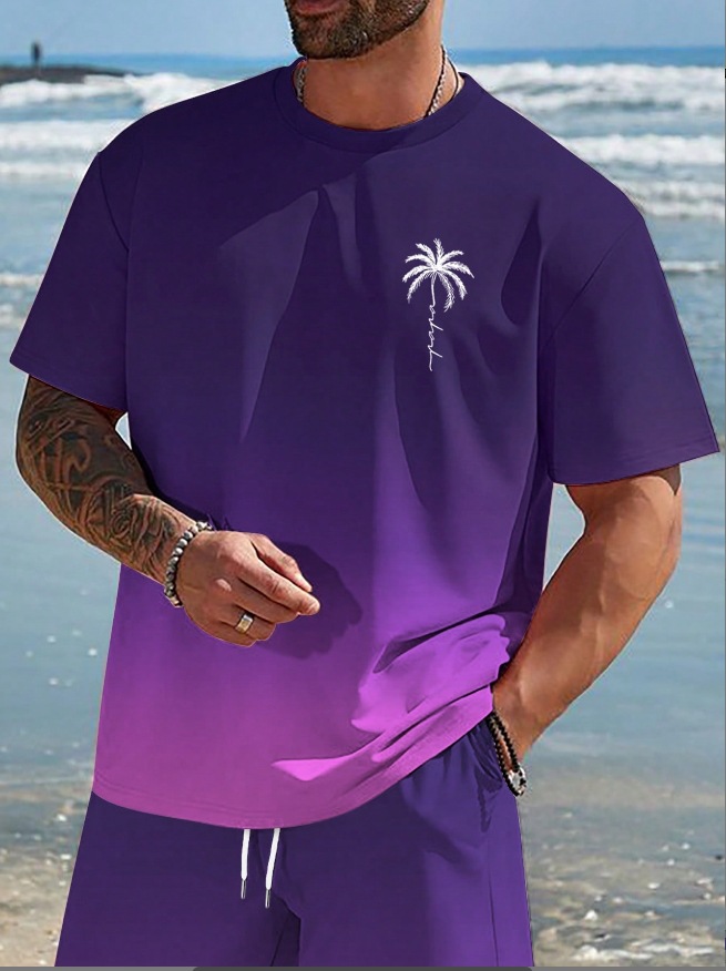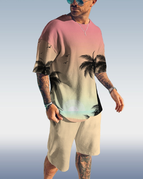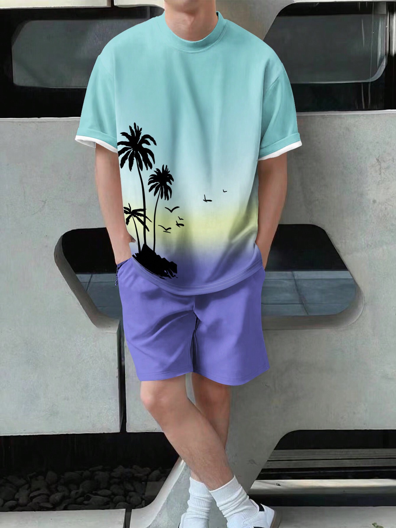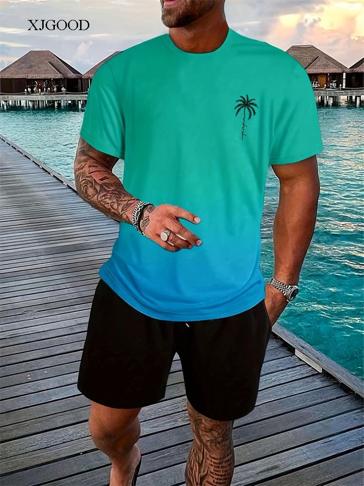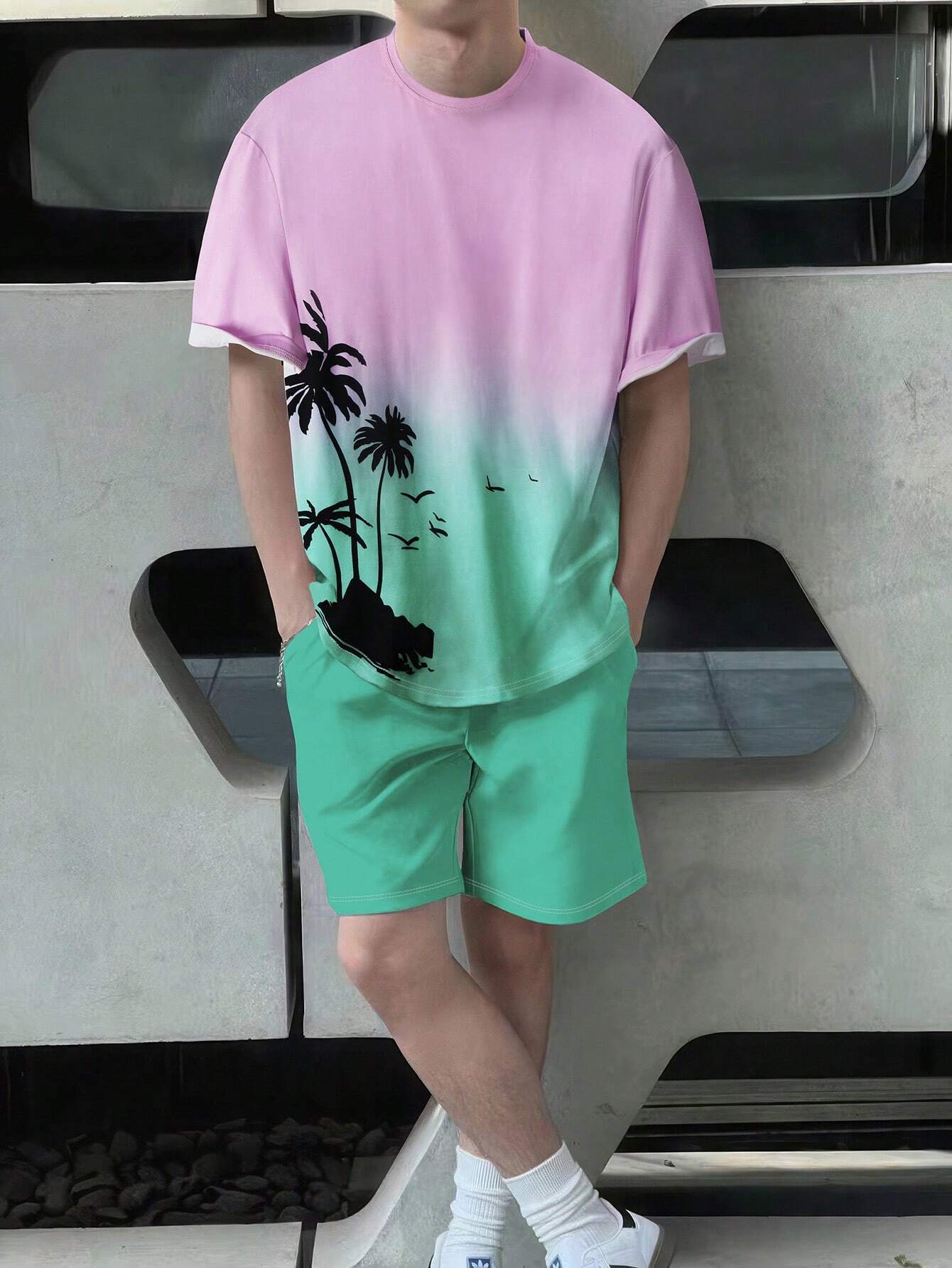 TEMU 여름 3D 프린트 티셔츠 반바지 2 피스 세트 남성 그라디언트 코코넛 트리 패턴 캐주얼 트렌드