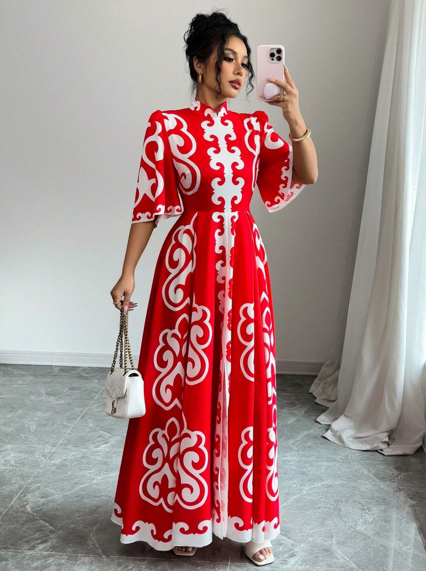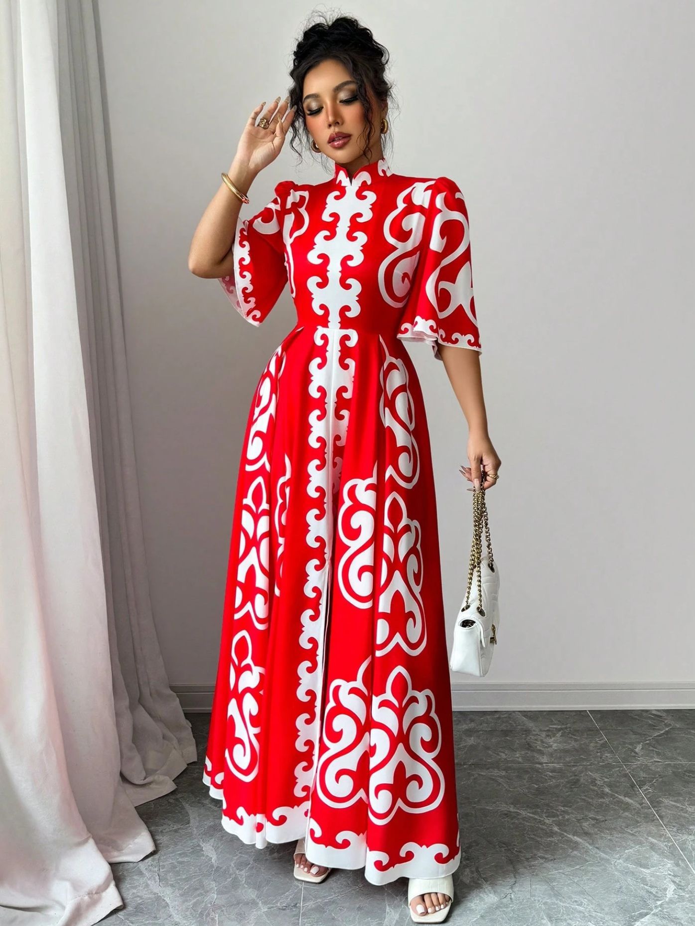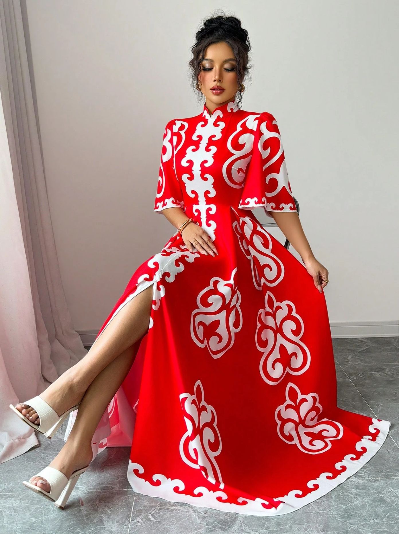 아마존 붉은 cheongsam 칼라 느슨한 큰 꽃 원피스