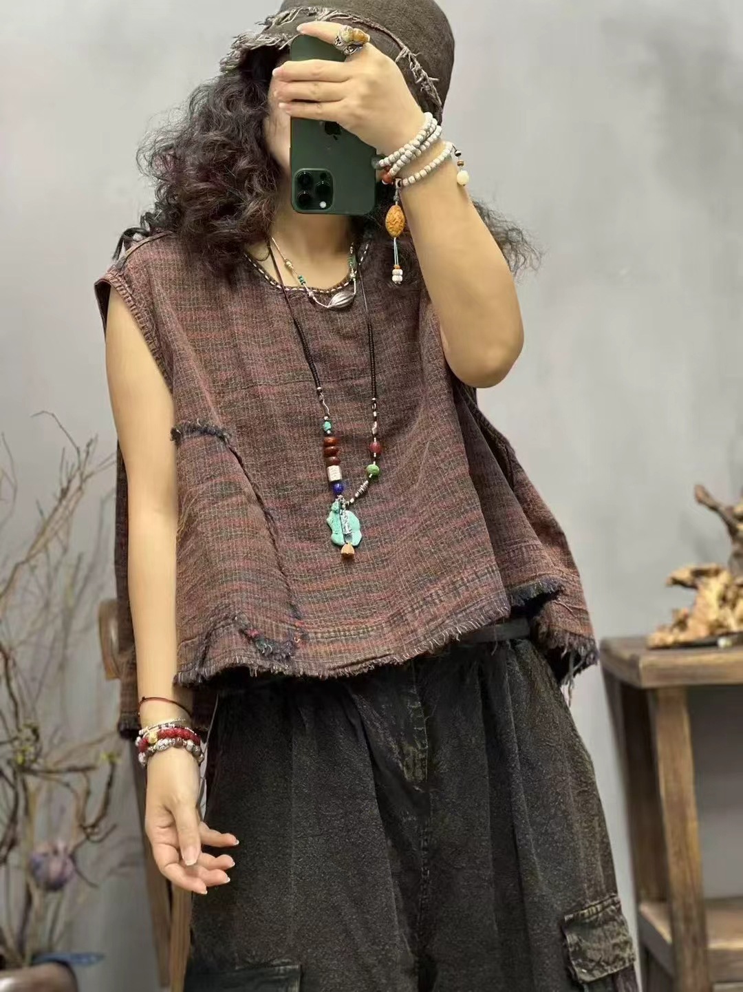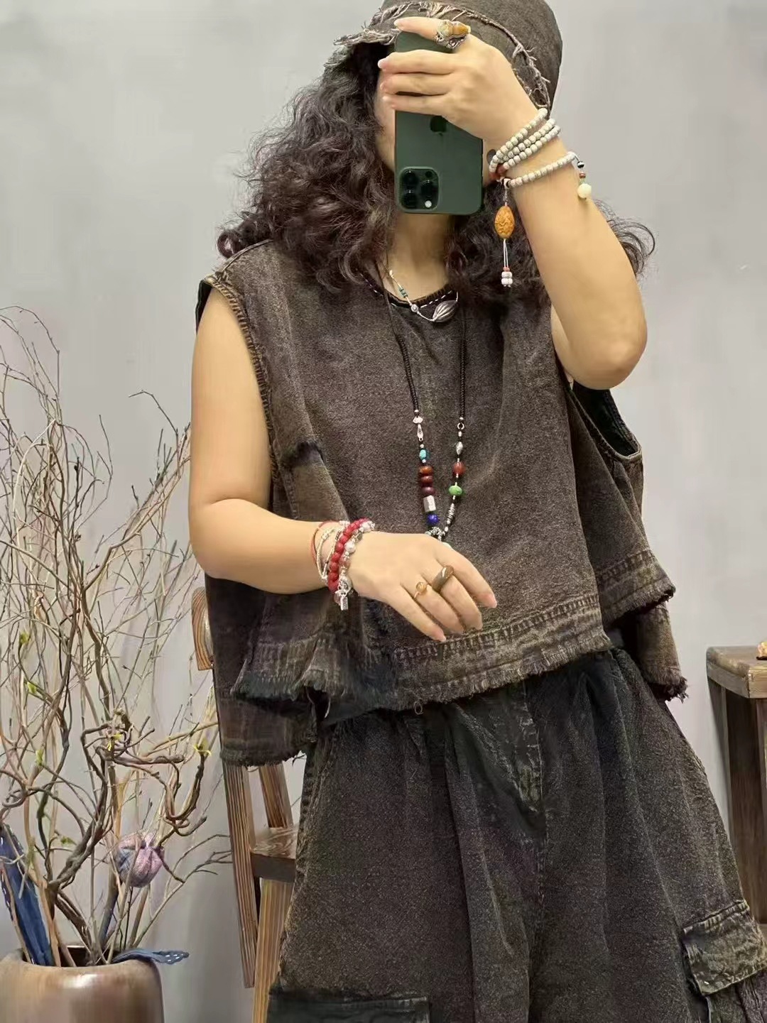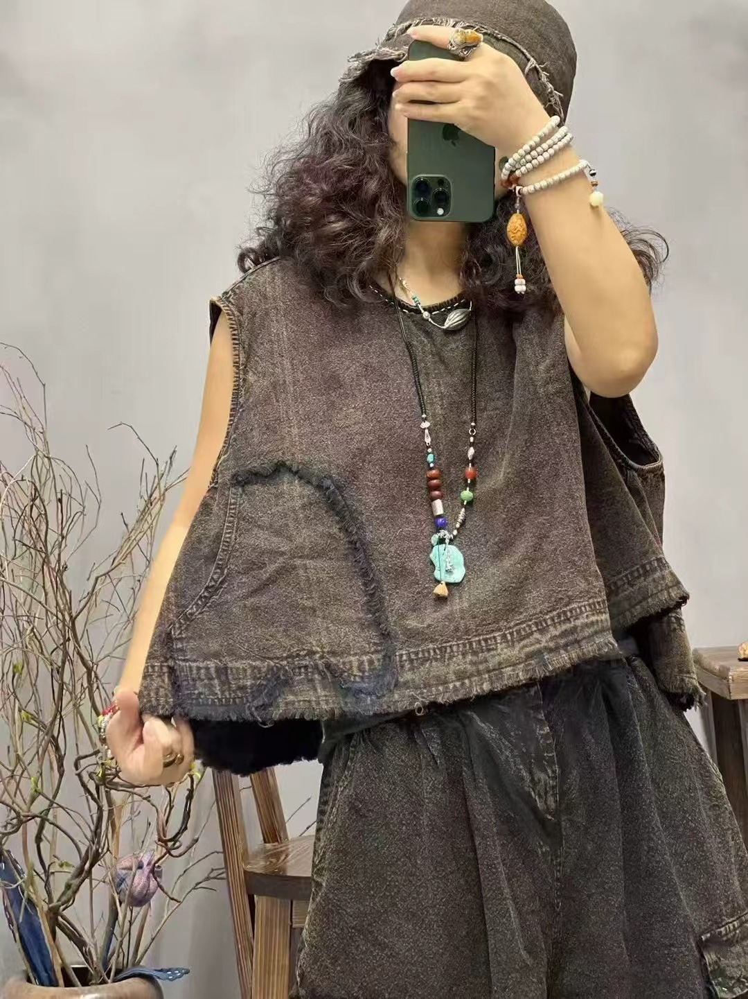 빈티지 올드 천 조끼 여성 포켓 독특한 짧은 여름 새로운 느슨한 올매치 캐주얼 패션 슬림 핏 웨어 7255