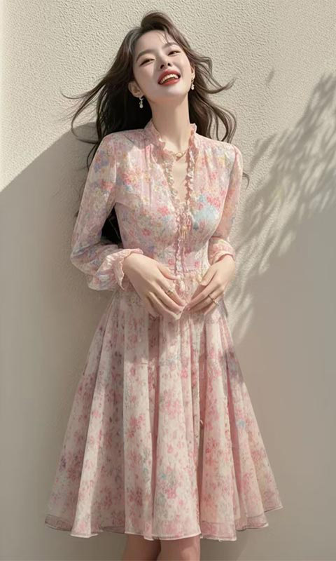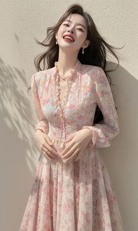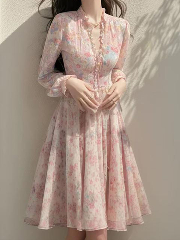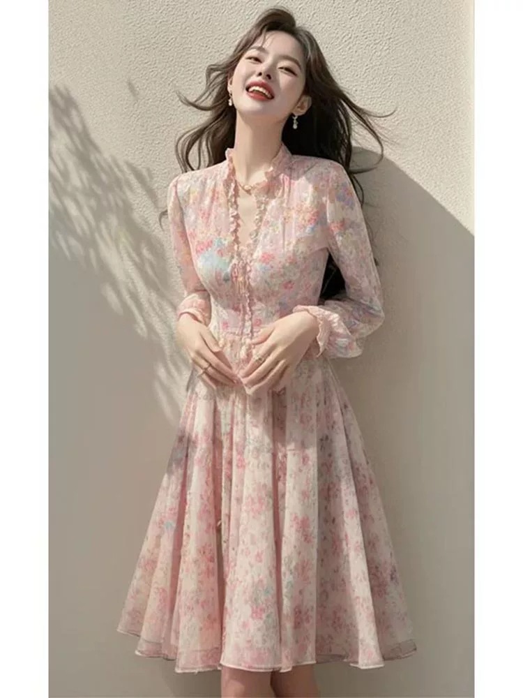 봄 도파민 원피스 정제 된 빛 고급 고급 고급 더러운 분위기 부드러운 스타일 핑크 꽃 원피스