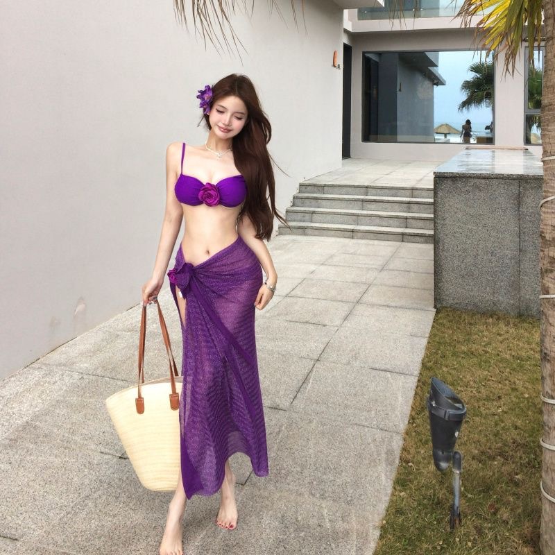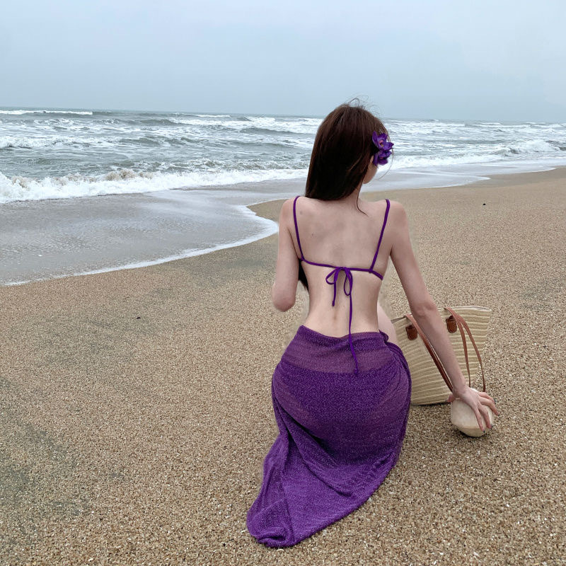 비키니 세트 퓨어 퍼플 브라 슬링 여성용 여름 스플릿 수영복 투피스 세트 스트랩 스커트 오버 드레스