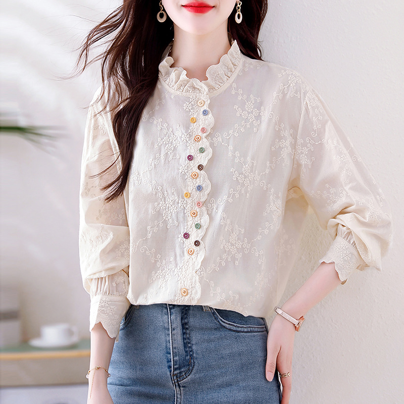 봄 2025 년 틈새 패션 디자인과 자수 요정 스타일 칼라 셔츠베이스 모든 경기 자수 긴 소매스토어 가기