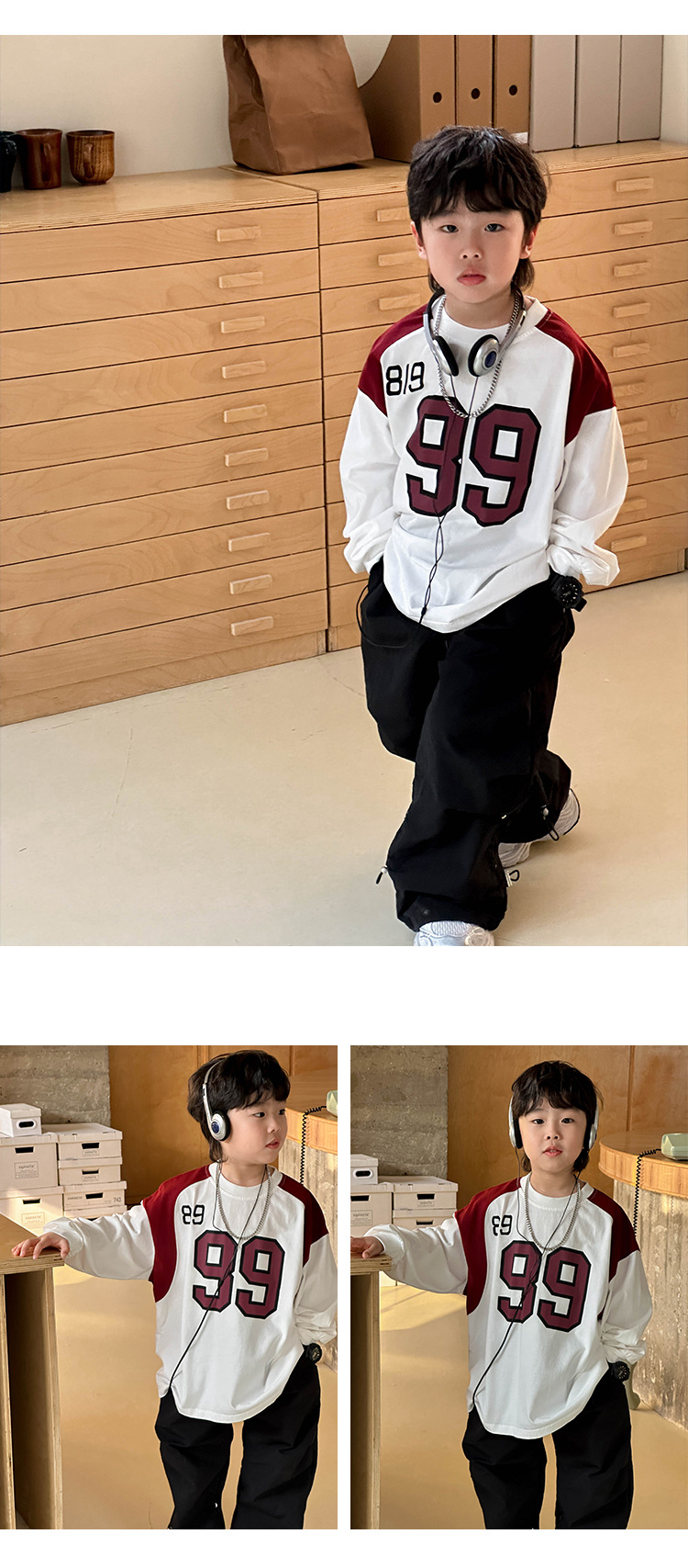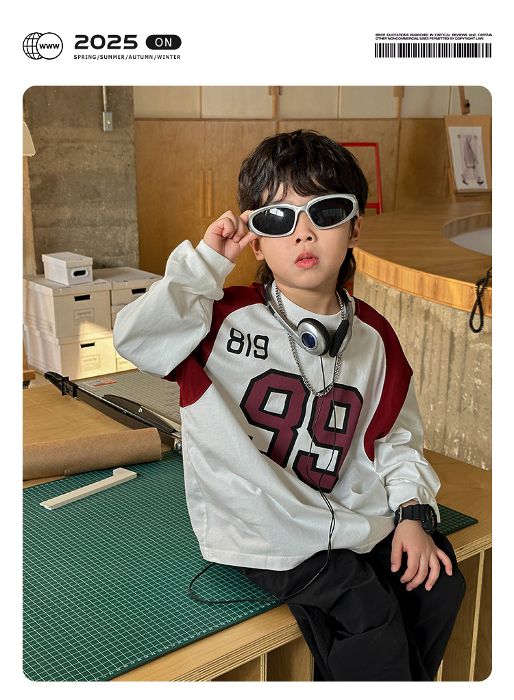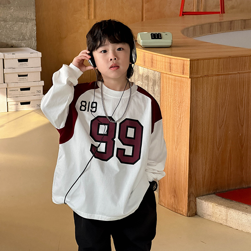 소년 패션 티셔츠 2025 가을 새로운 어린이 한국 스타일 느슨한 라운드 넥 탑 중소 어린이를위한 다목적 가을 의류 트렌드