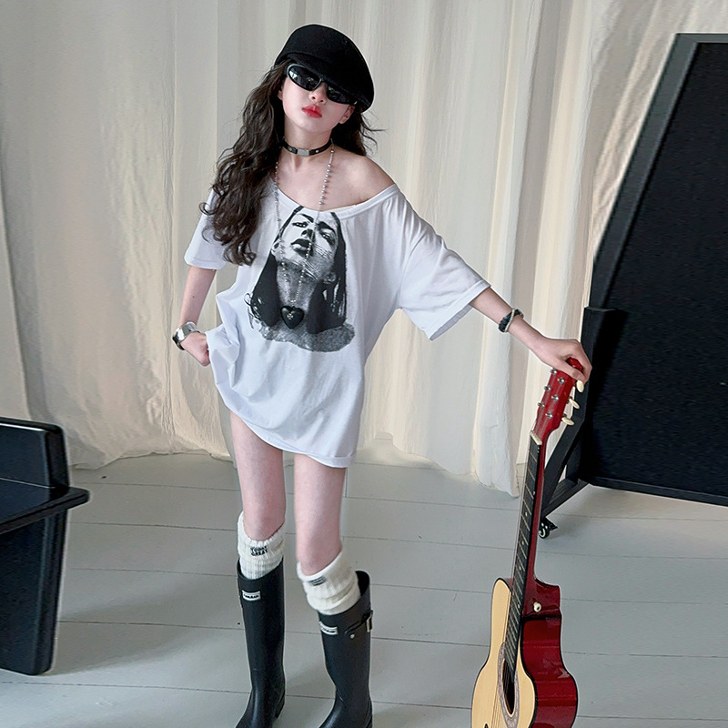여자 여름 세트 2025 새 어린이 느슨한 패셔너블 오프 숄더 티셔츠 올매치 한국식 데님 반바지 2 개