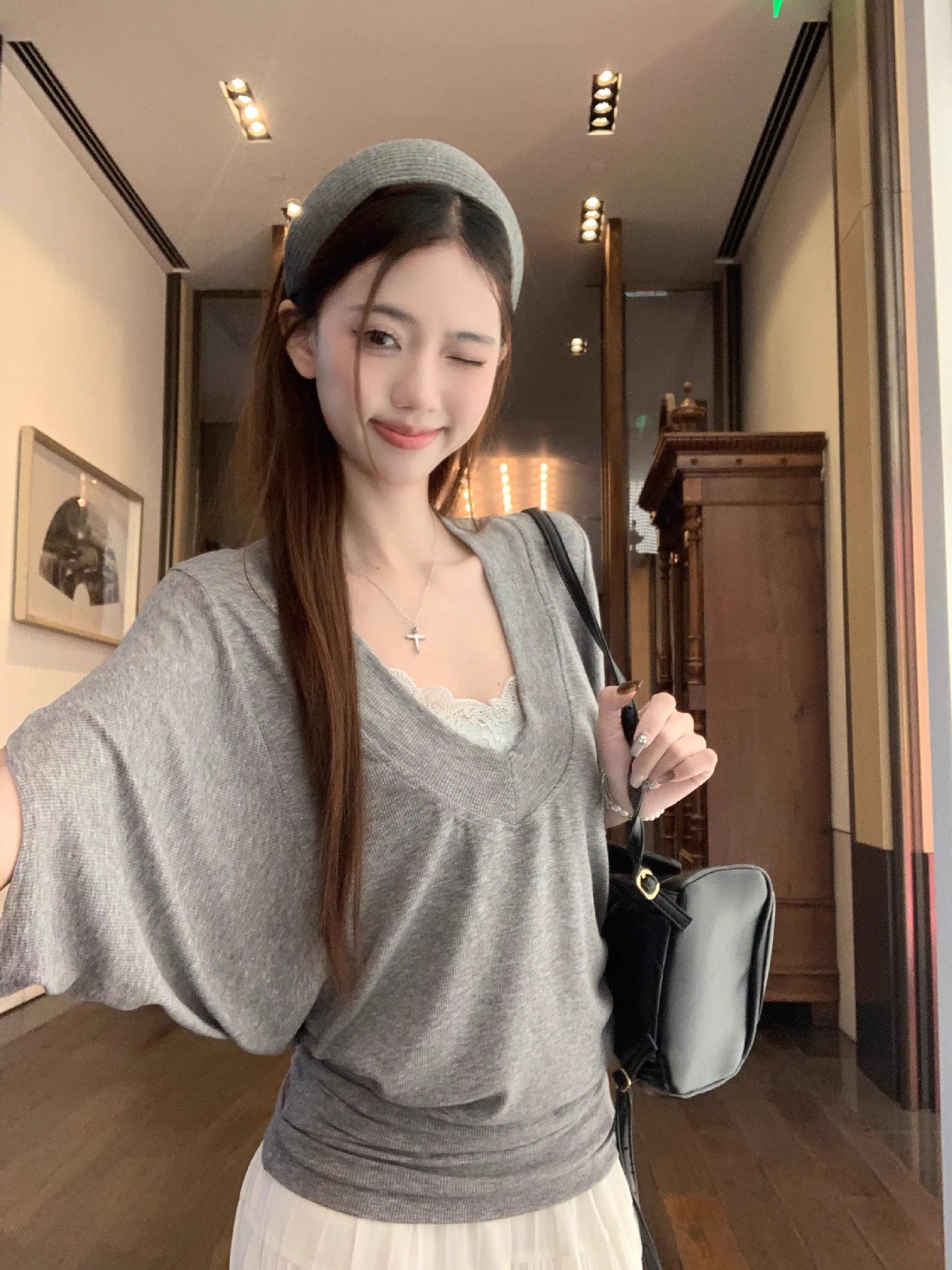 게으른 스타일 느슨한 슬리밍 V 넥 반팔 티셔츠 여성 여름 한국 스타일 스파이스 소녀 슬리밍 한국 스타일 캐주얼 디자인 티셔츠