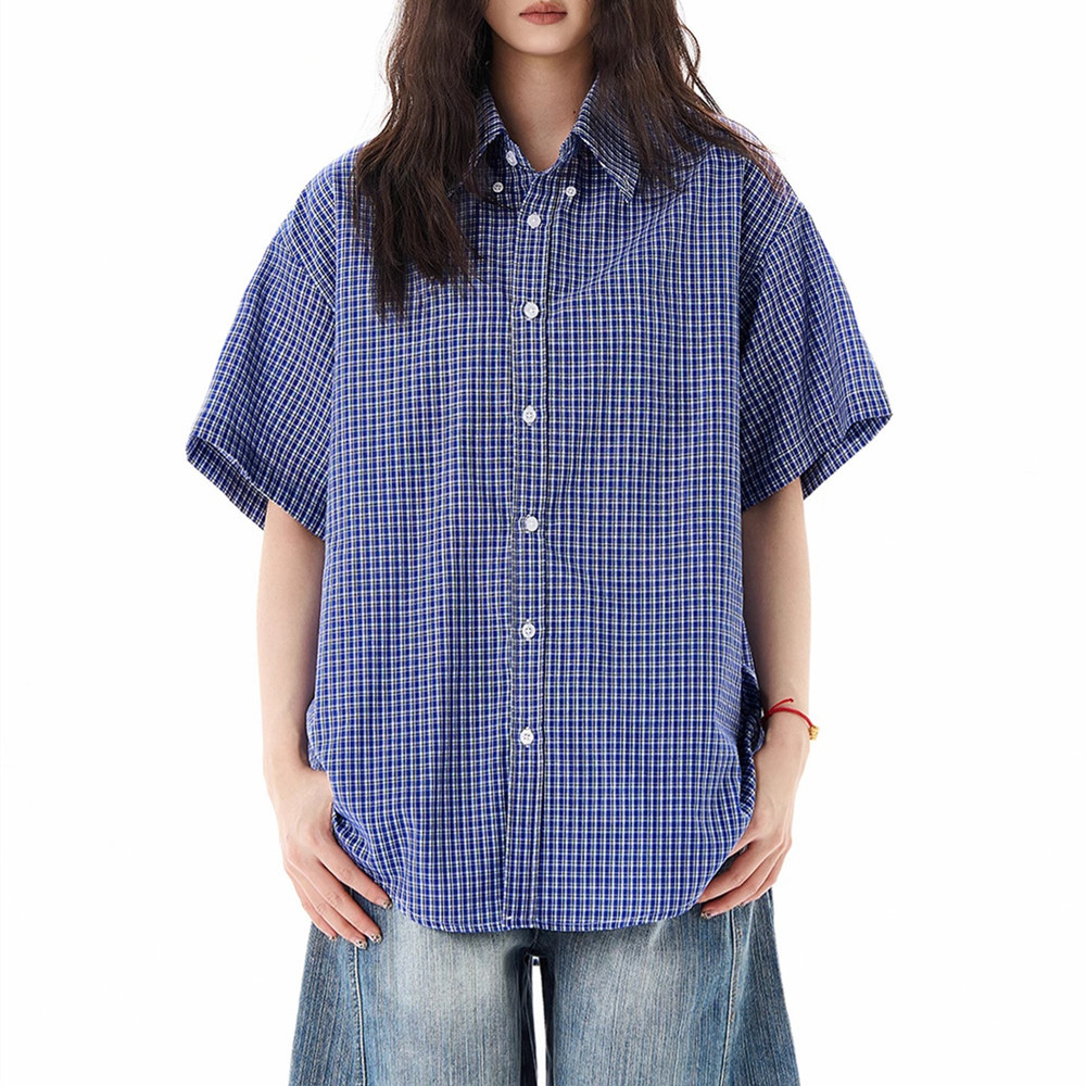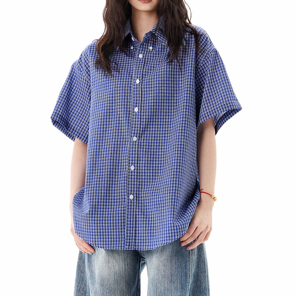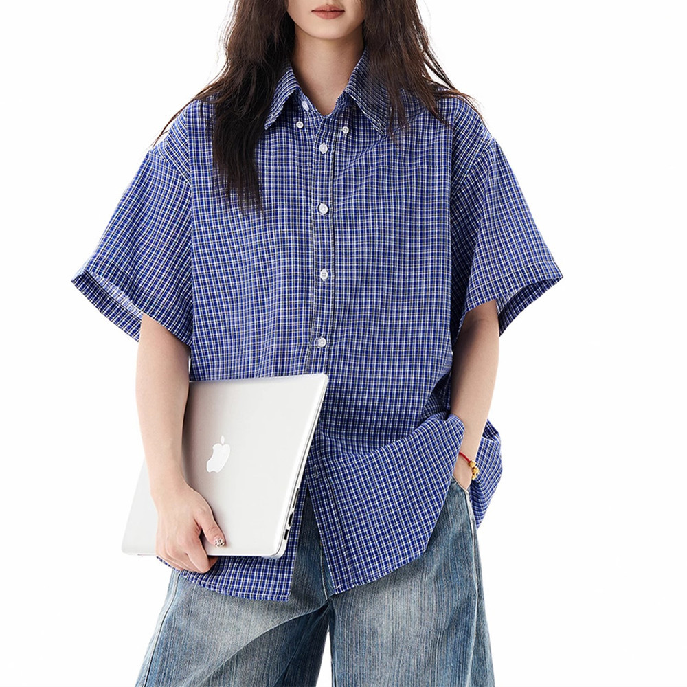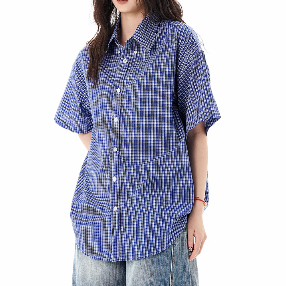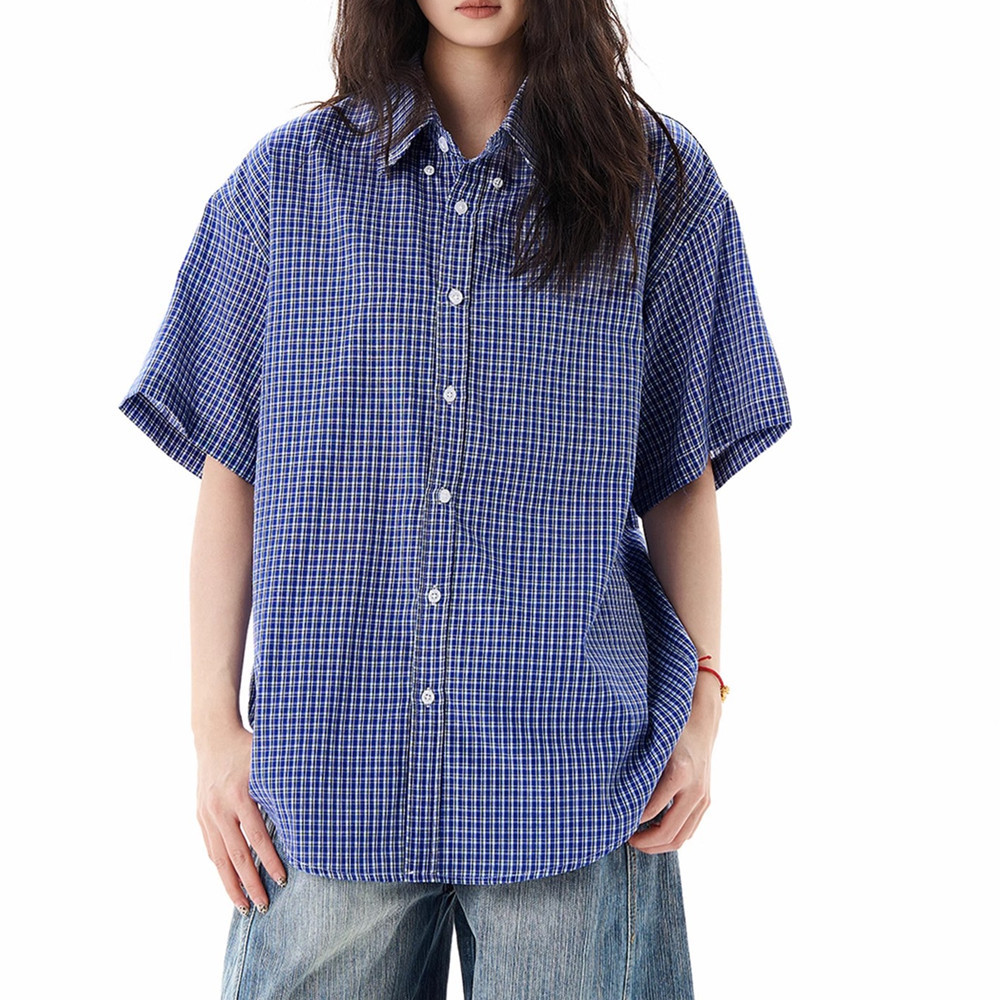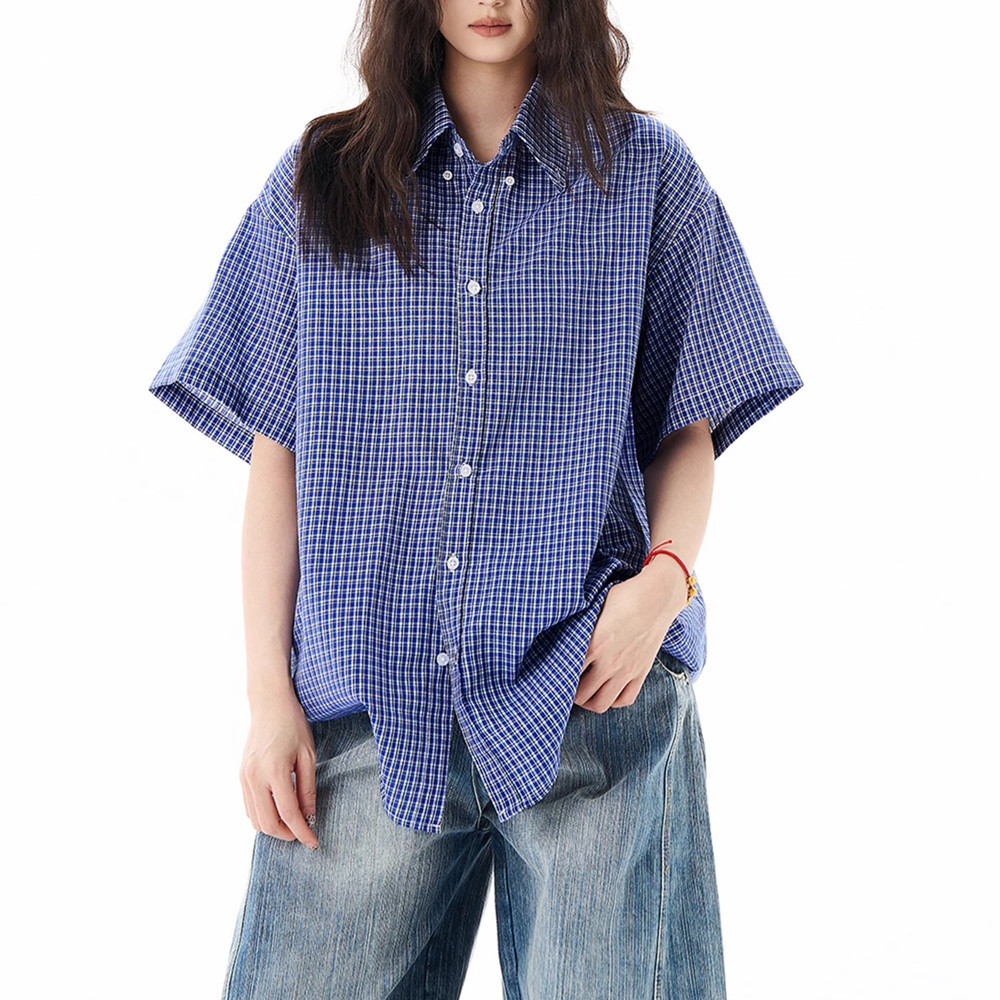 미국 스타일 레트로 블루 체크 짧은 소매 셔츠 남성과 여성을위한 새로운 높은 감각 캐주얼 느슨한 커플 셔츠 트렌디스토어 가기