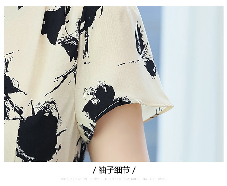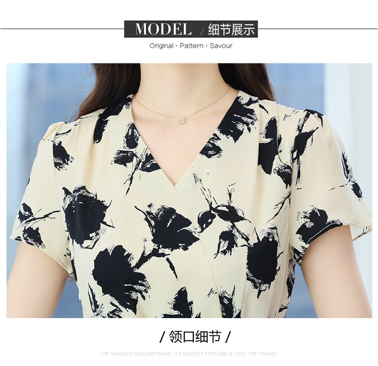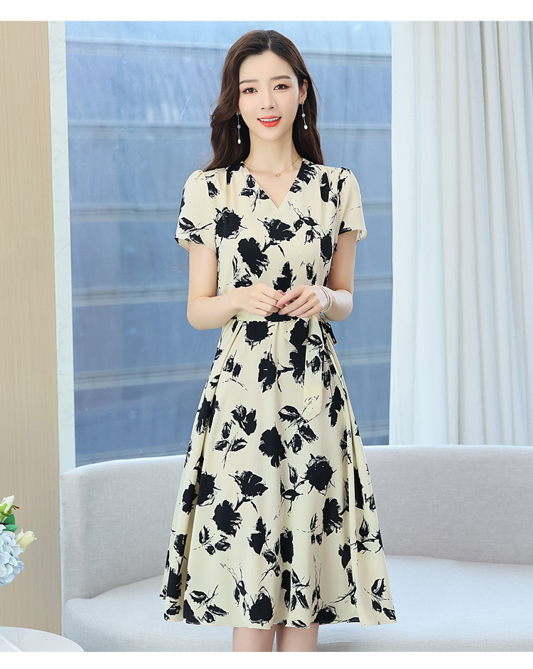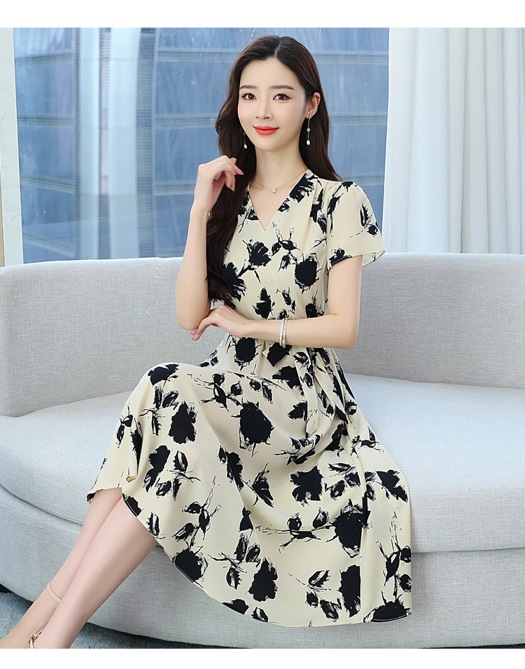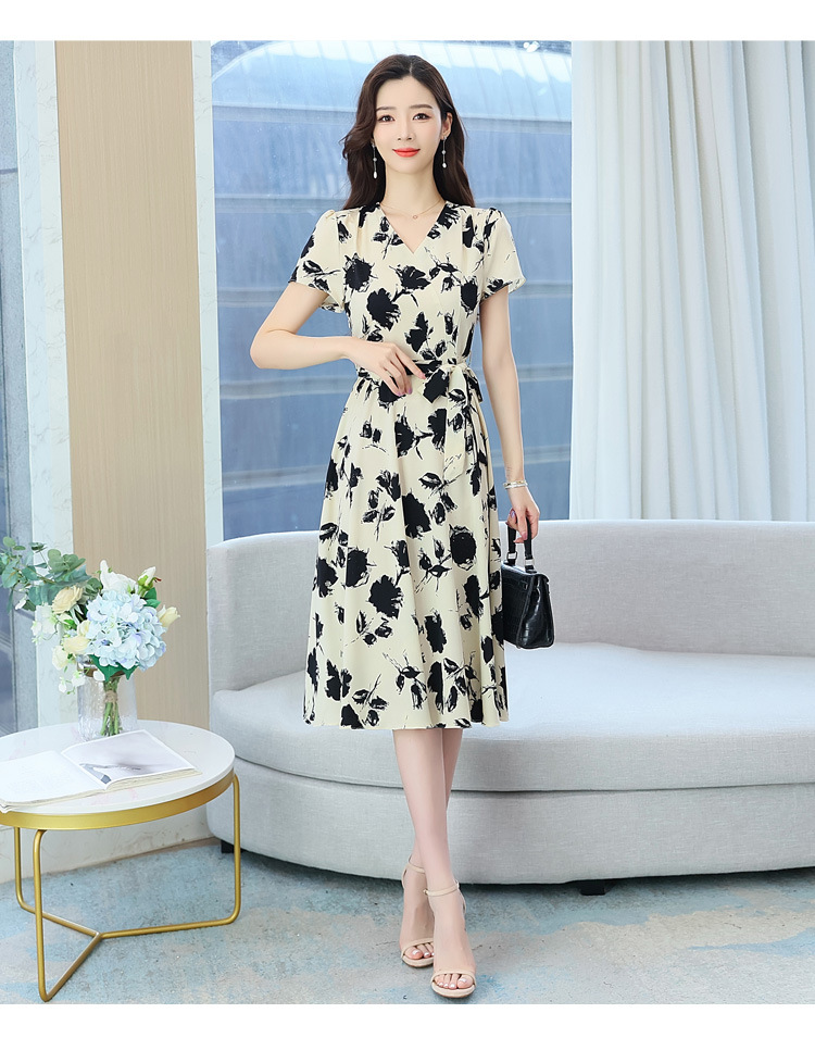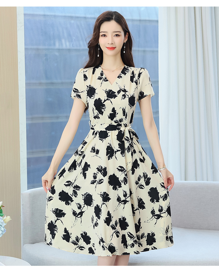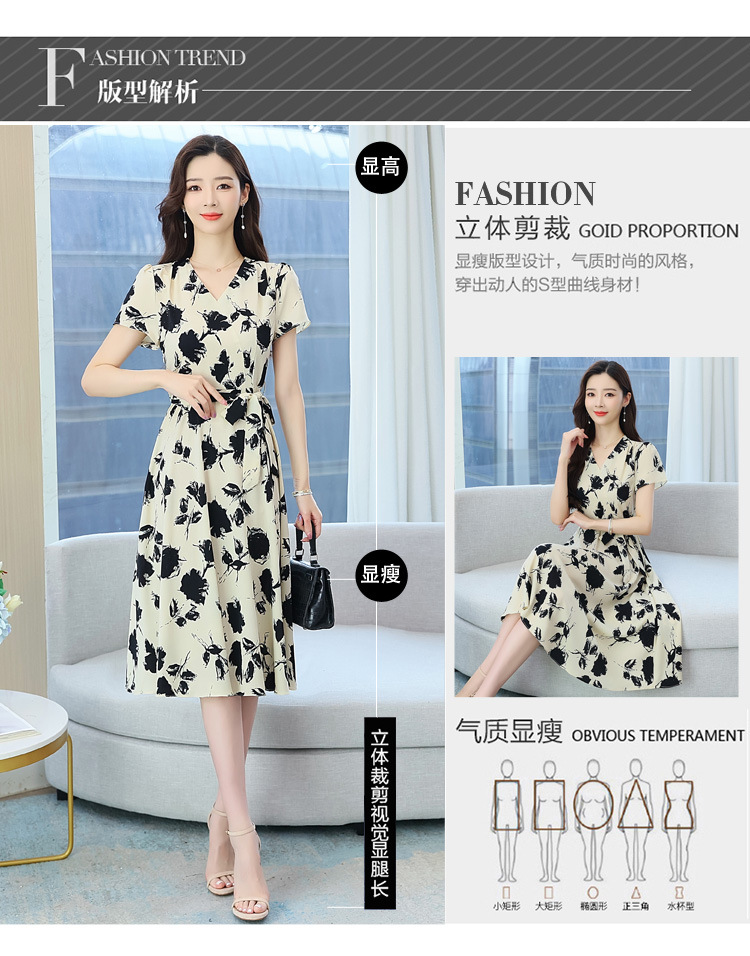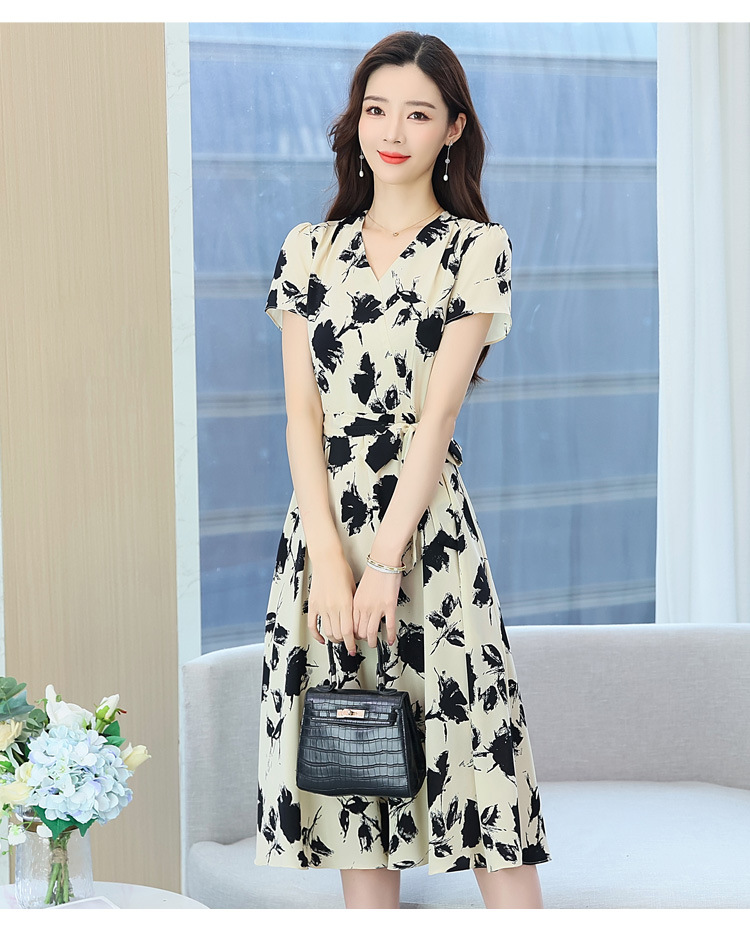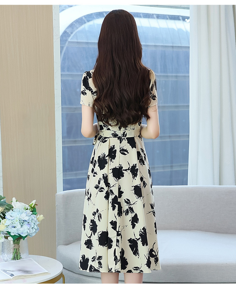 가벼운 성숙한 스타일 스커트 새로운 여름 원피스 여성 레트로 우아한 중간 길이 웨이스트 슬림 핏 반팔 인쇄 원피스