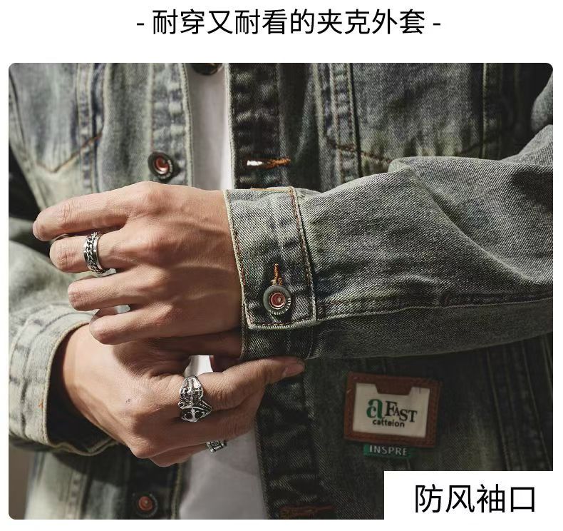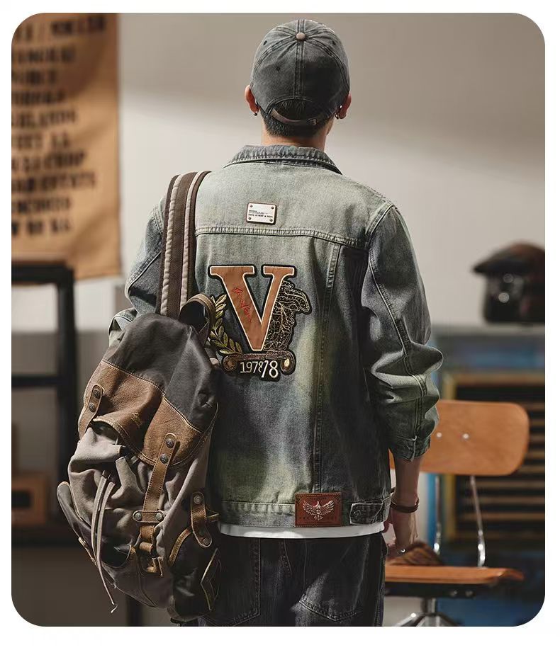 아메리칸 스타일 빈티지 V-넥 자수 데님 재킷 남성 봄과 가을 새로운 패션 브랜드 스타일 유행 기관차 클립스토어 가기