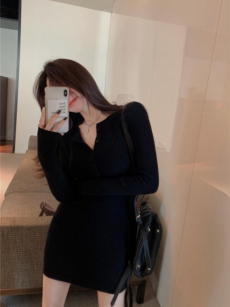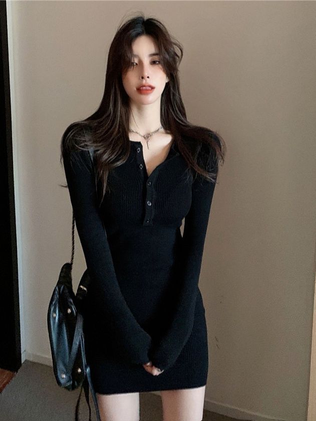 2024 새로운 블랙 긴팔 원피스 여성용 가을과 겨울 스파이스 걸스 슬림핏 슬리밍 내베이스 엉덩이 짧은 치마스토어 가기