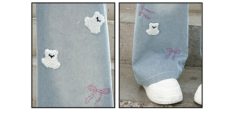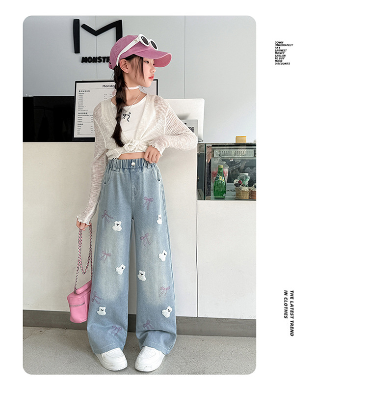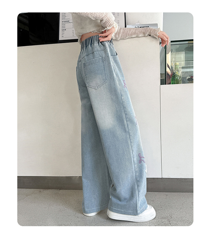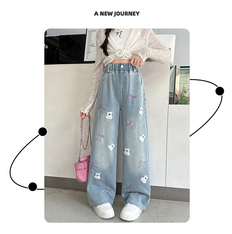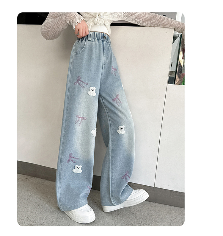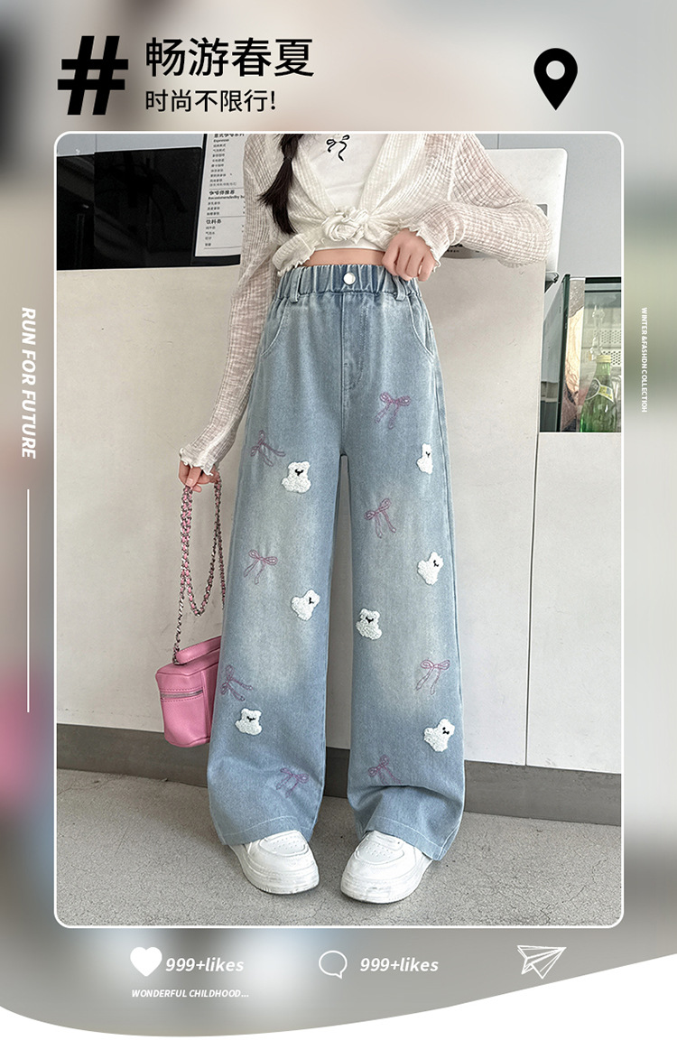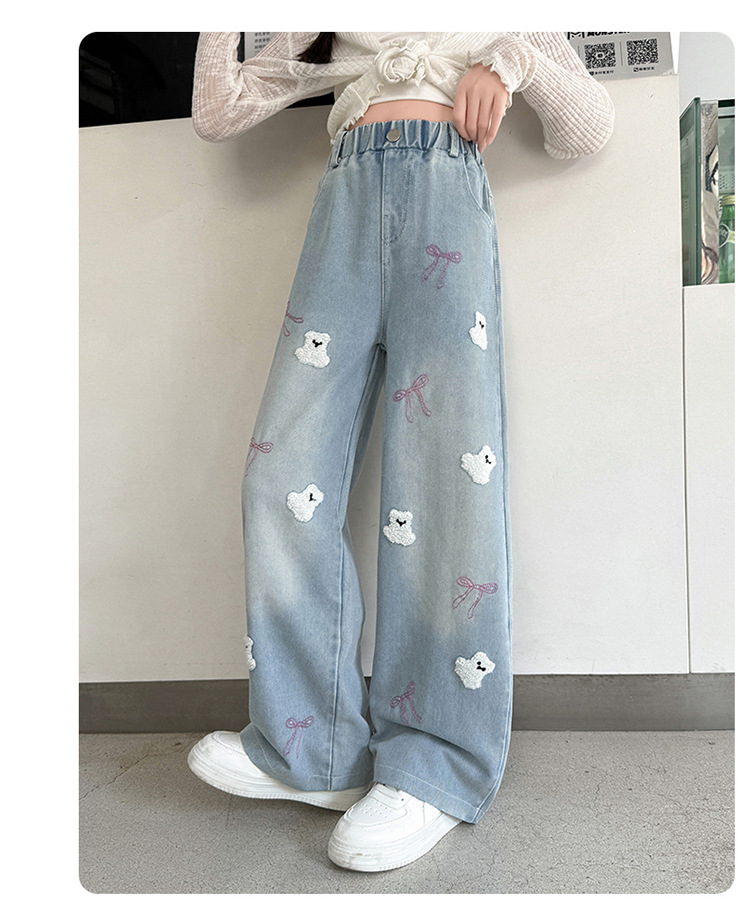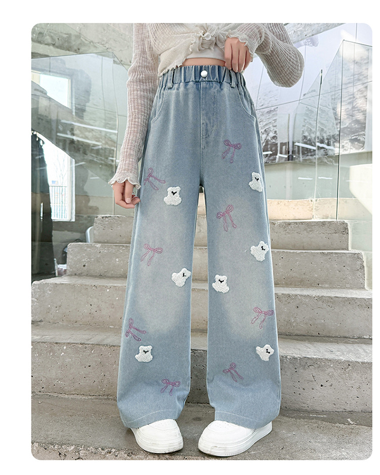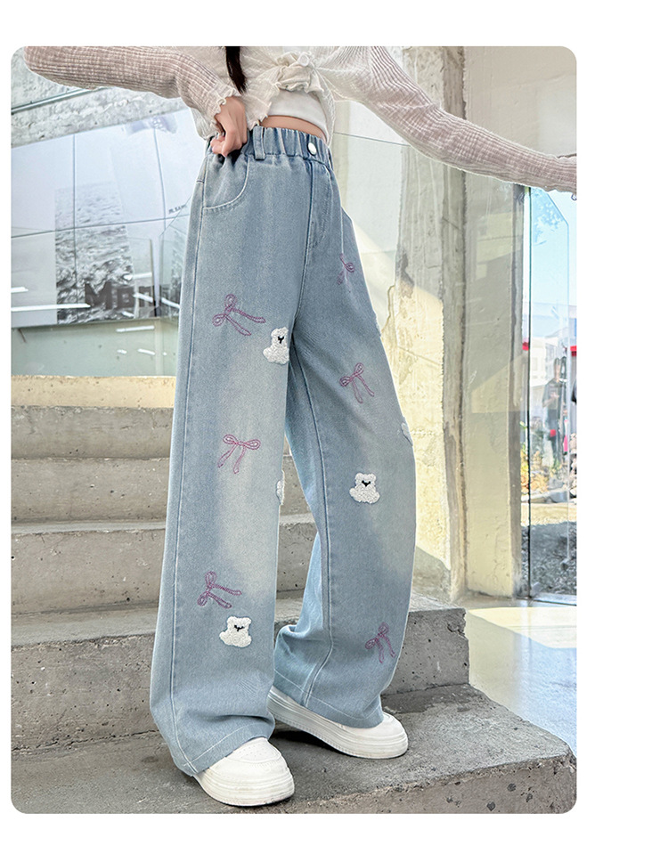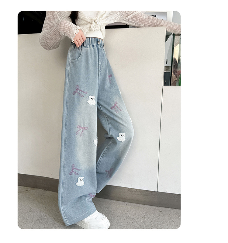 여자 데님 바지 봄 착용 어린이 외부 착용 만화 중학교 여자 서양식 와이드 레그 스트레이트 바지 Huzhou Zhili