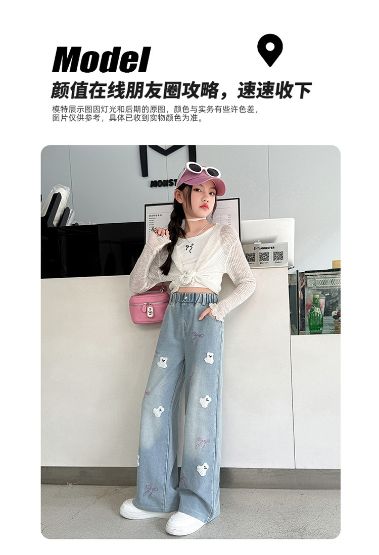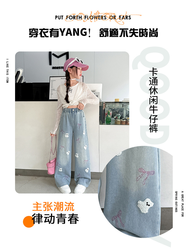 여자 데님 바지 봄 착용 어린이 외부 착용 만화 중학교 여자 서양식 와이드 레그 스트레이트 바지 Huzhou Zhili스토어 가기