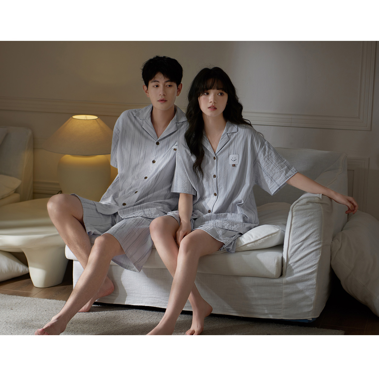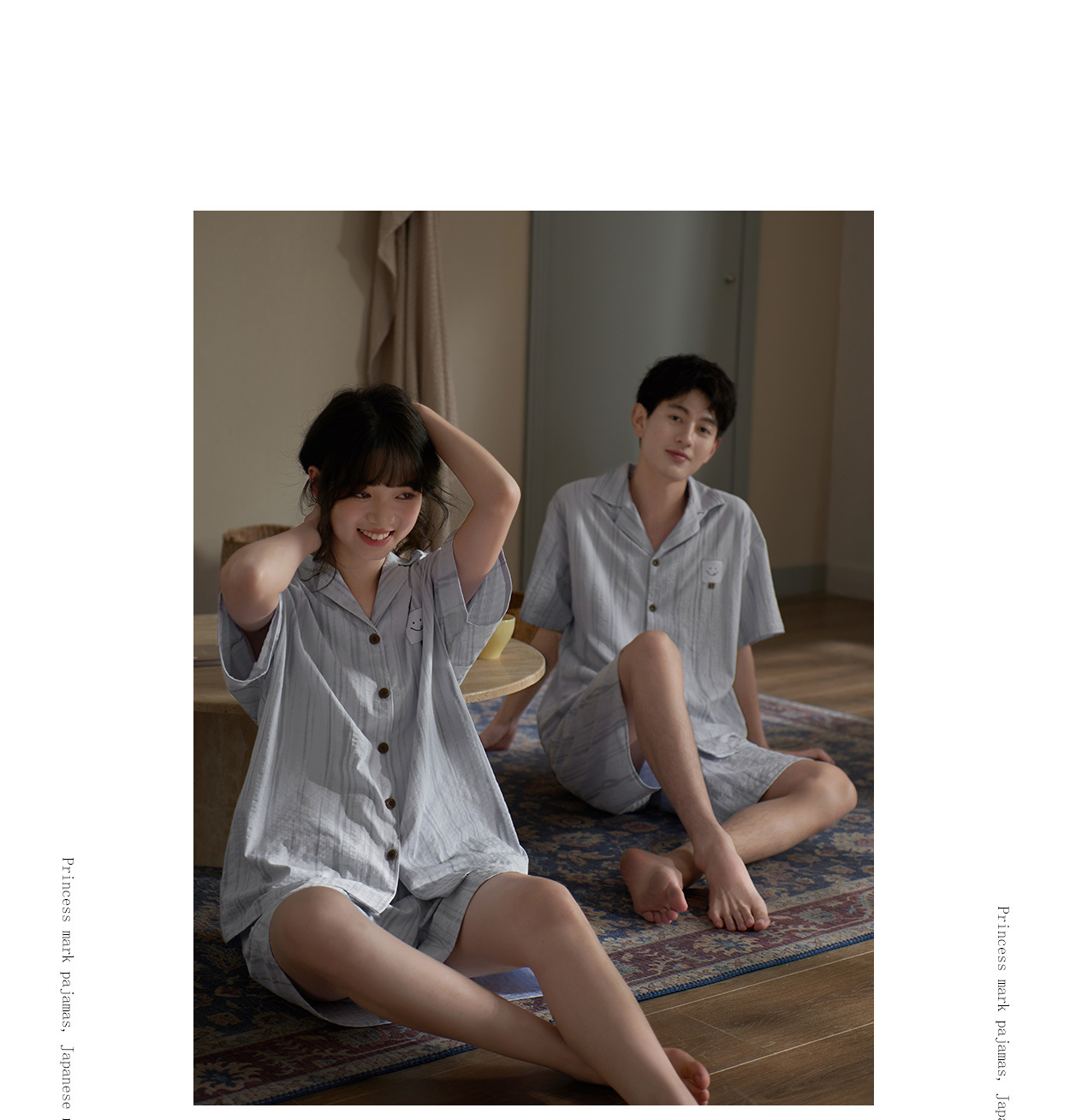 커플 잠옷 여성 여름 새 일본식 순면 남자의 짧은 소매 스트라이프 소프트 아웃웨어 홈 의류