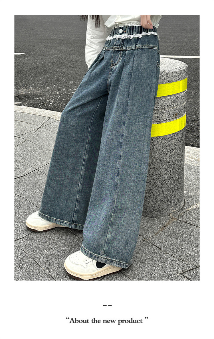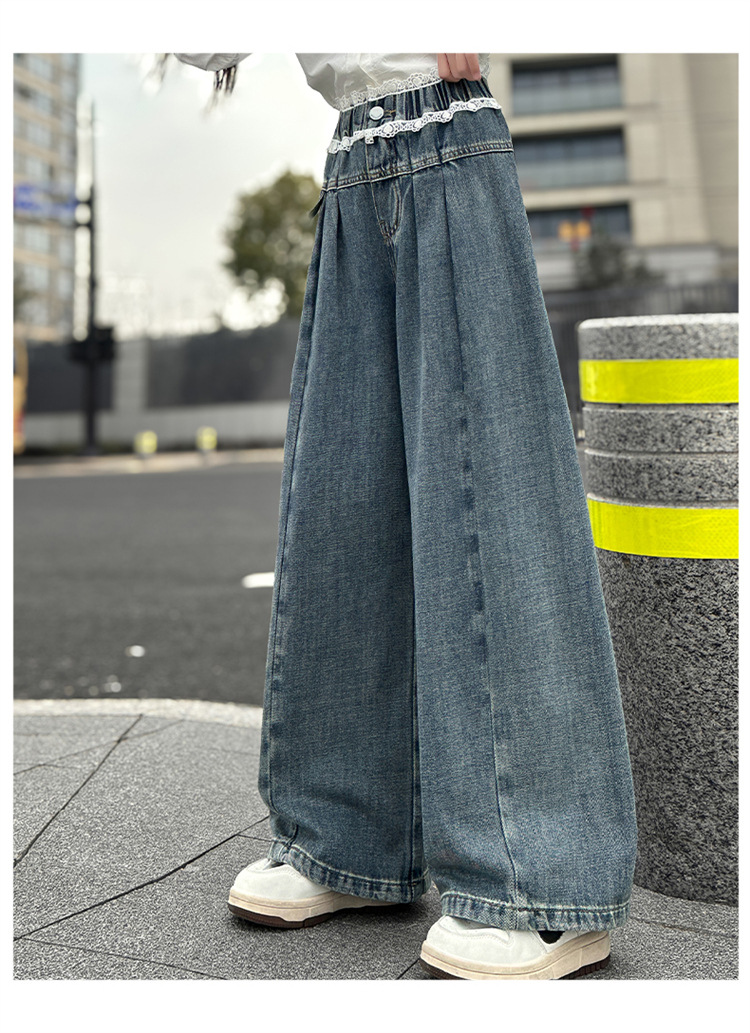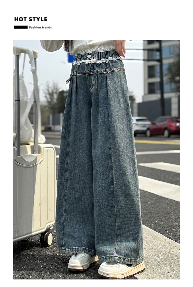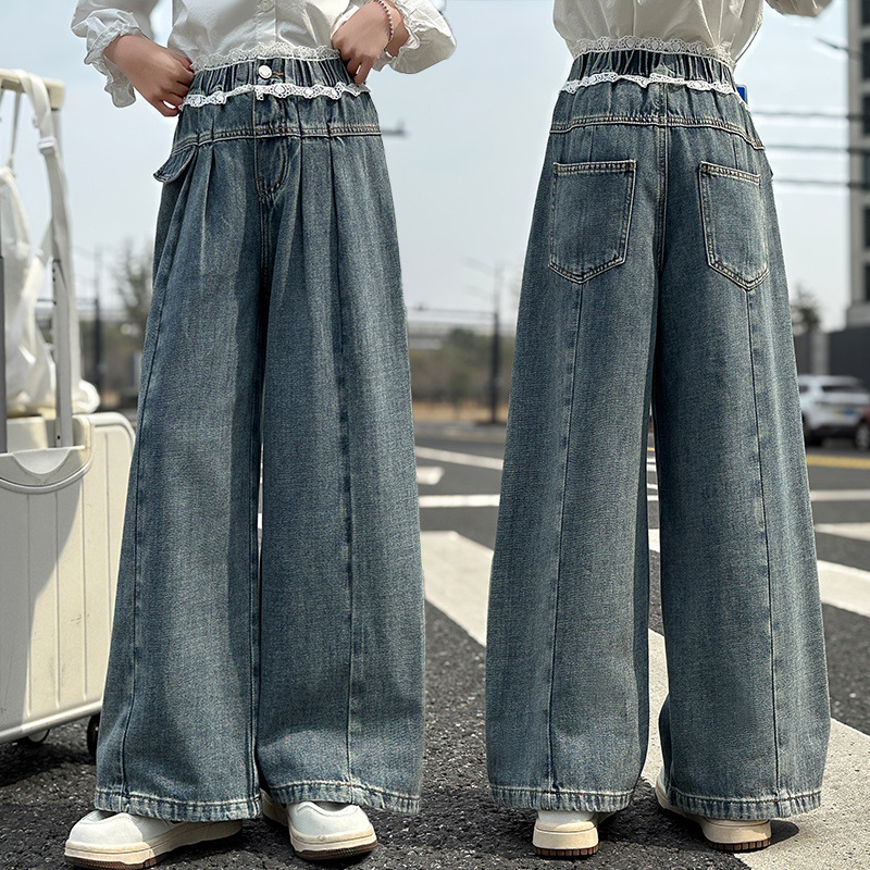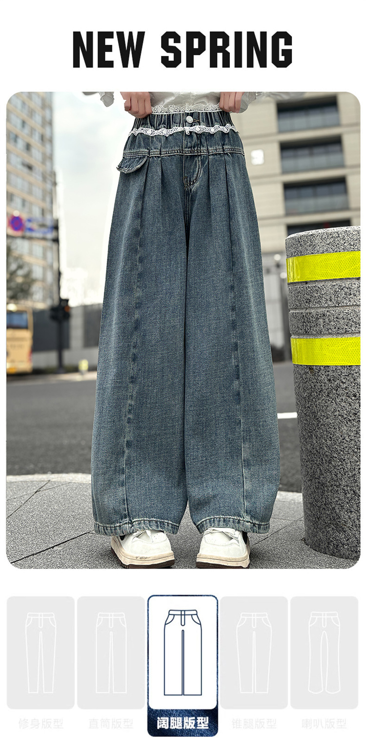 소녀 데님 바지 봄 레트로 중학교 소녀 서양식 와이드 레그 스트레이트 바지 Huzhou Zhili