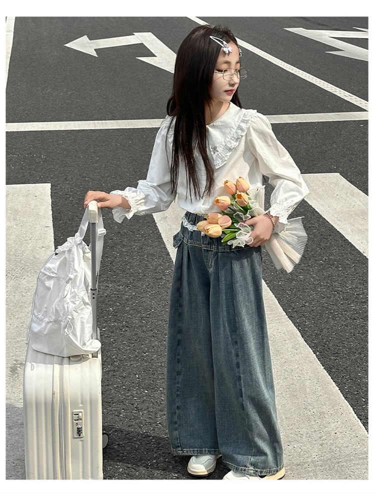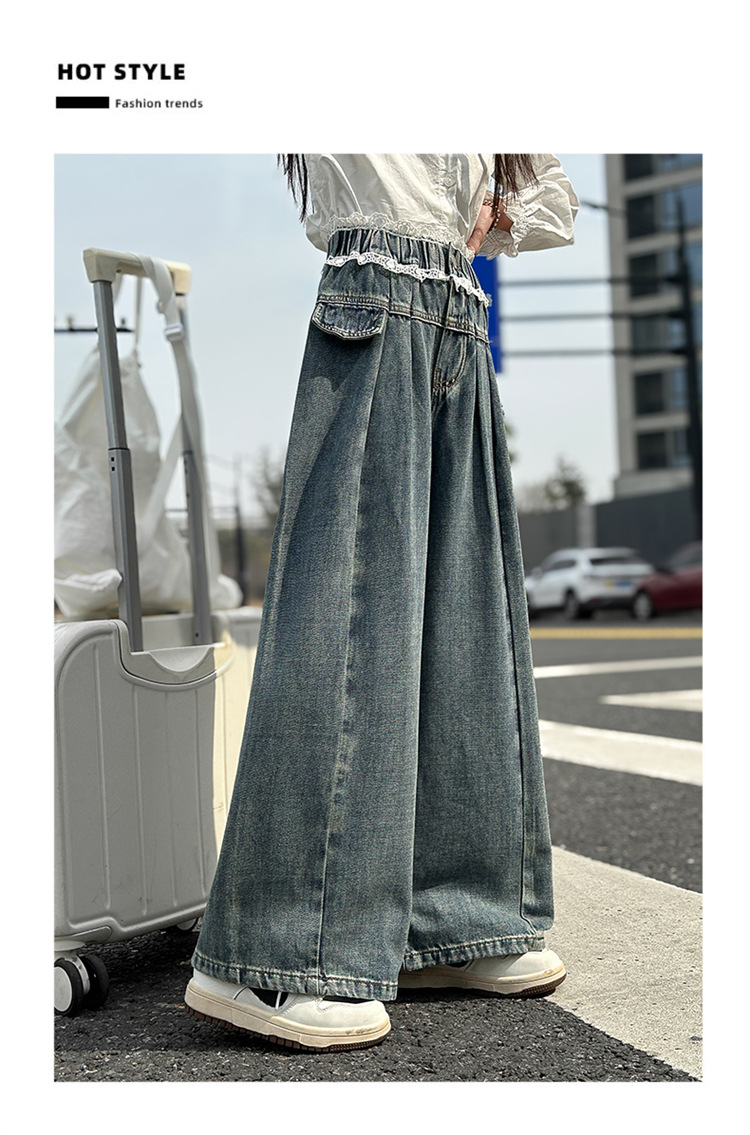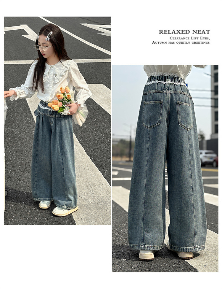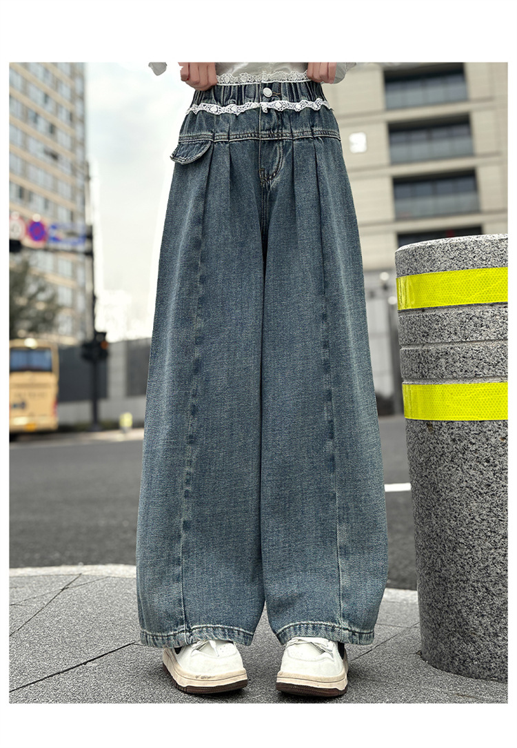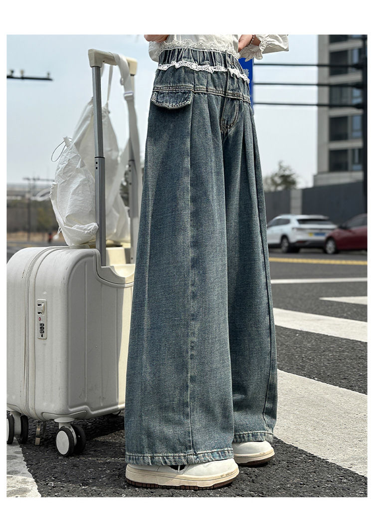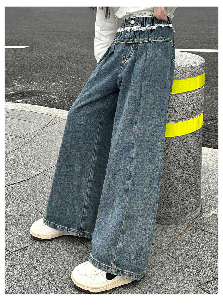 소녀 데님 바지 봄 레트로 중학교 소녀 서양식 와이드 레그 스트레이트 바지 Huzhou Zhili