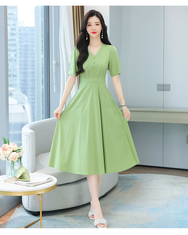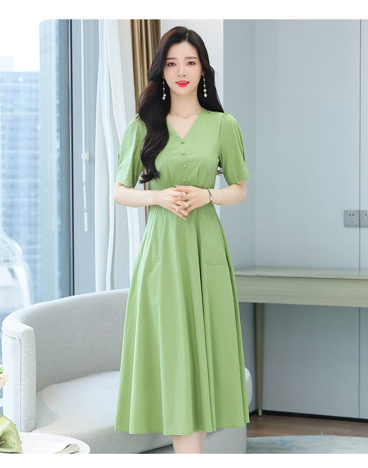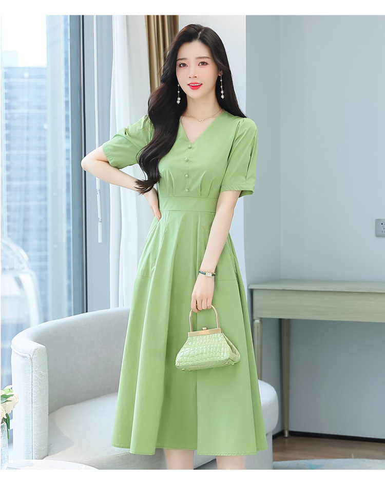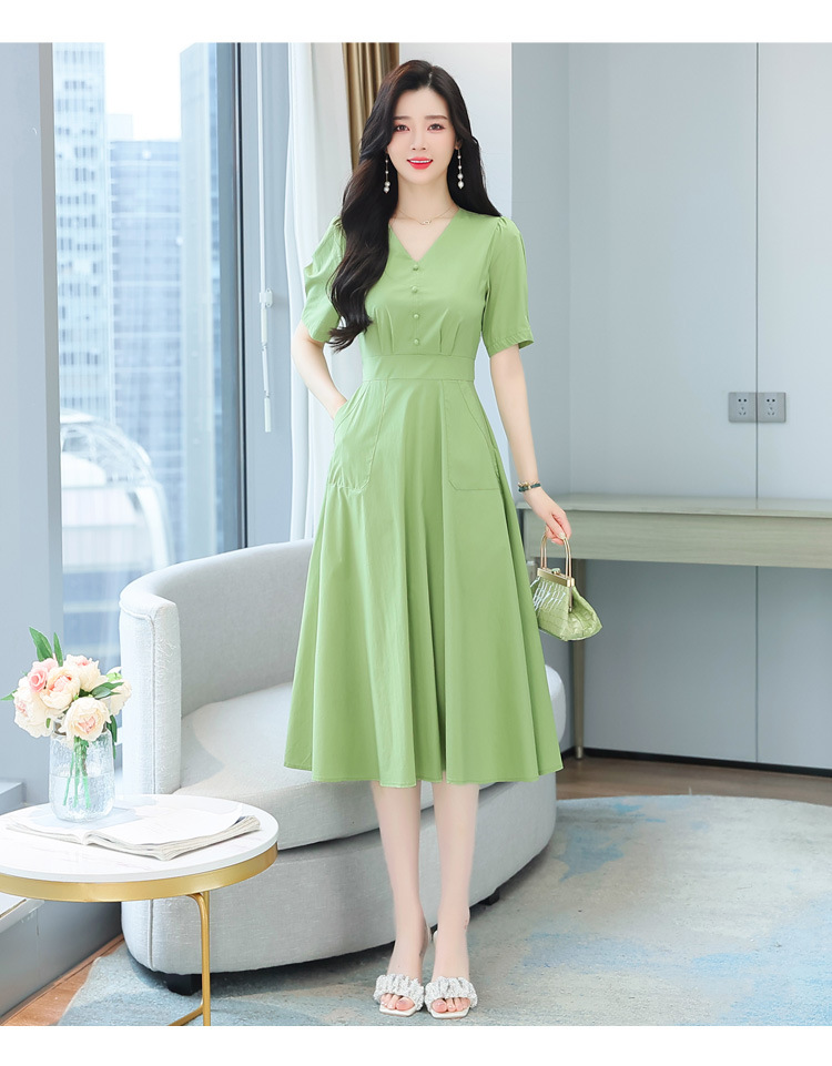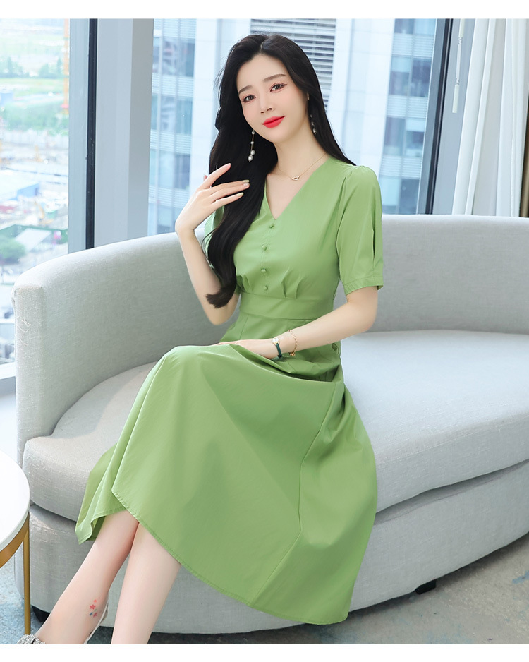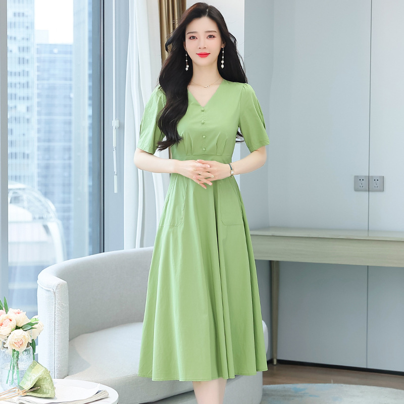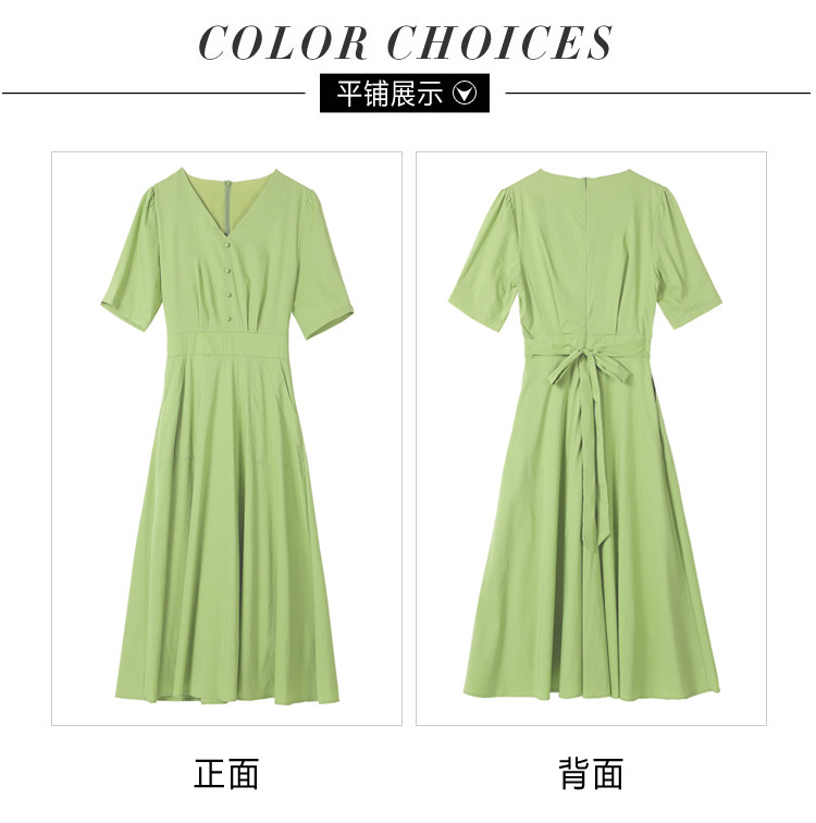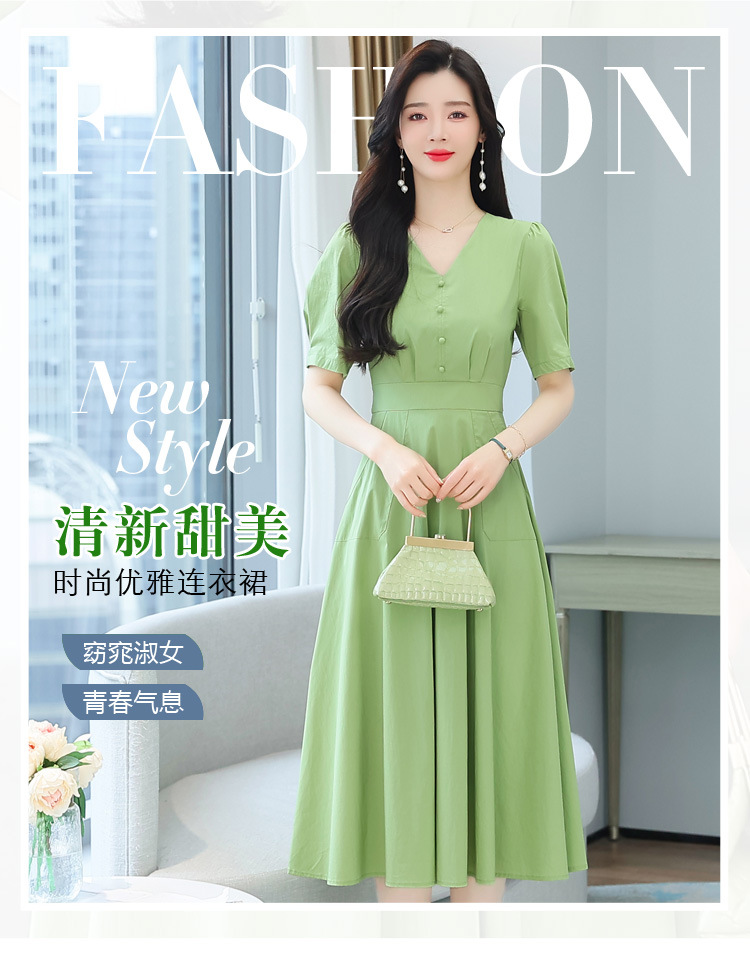 빈티지 프랑스 스타일 화이트 아보카도 그린 원피스 봄과 여름 달콤한 허리 V-목 긴 A 라인 대형 원피스스토어 가기