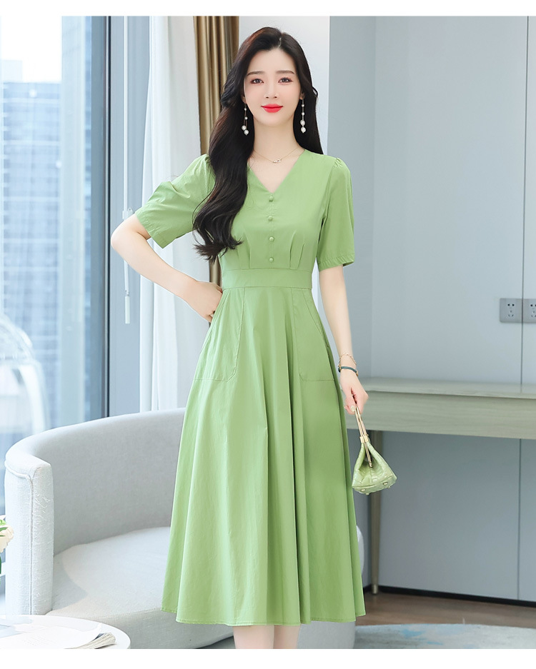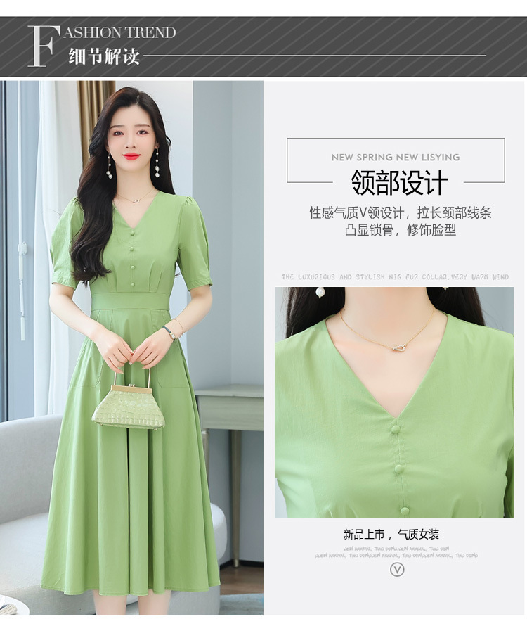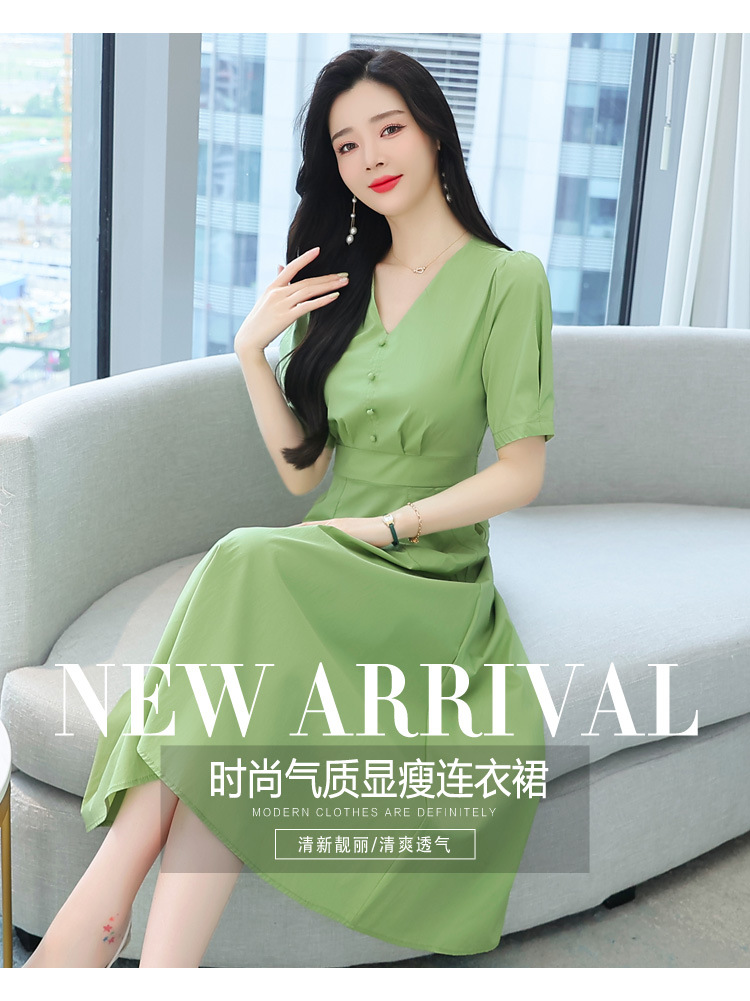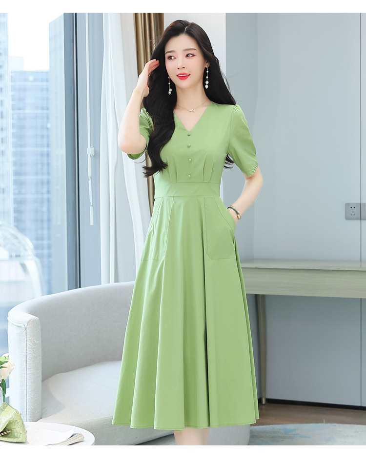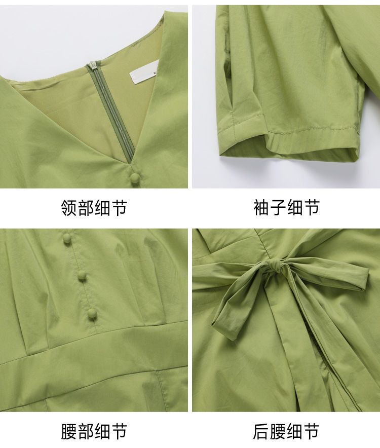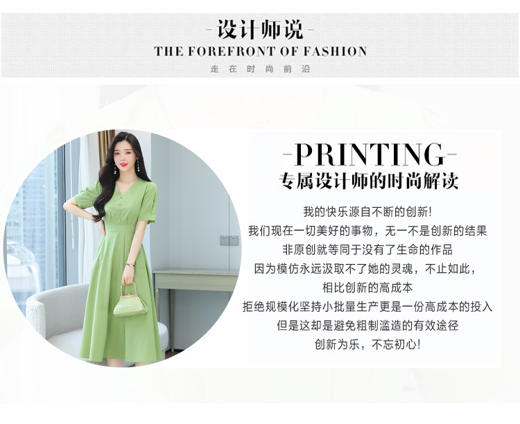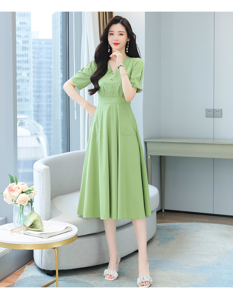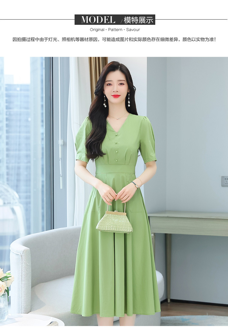 빈티지 프랑스 스타일 화이트 아보카도 그린 원피스 봄과 여름 달콤한 허리 V-목 긴 A 라인 대형 원피스스토어 가기