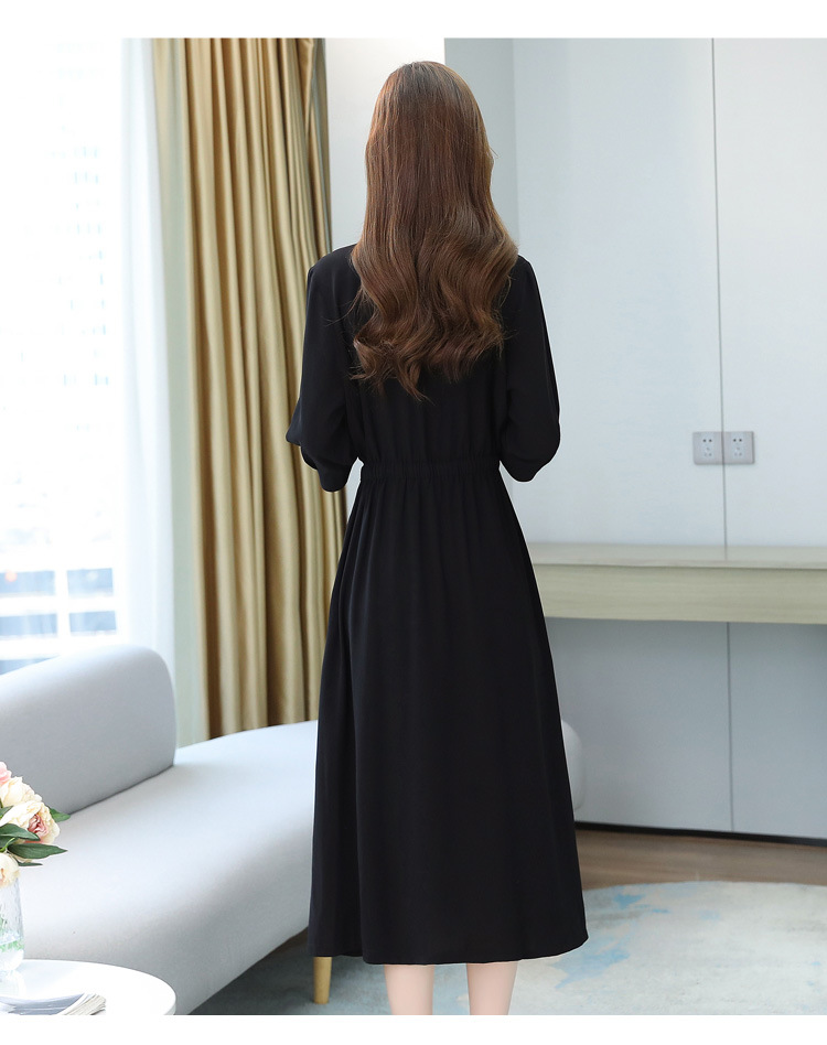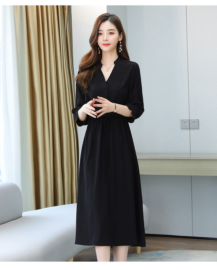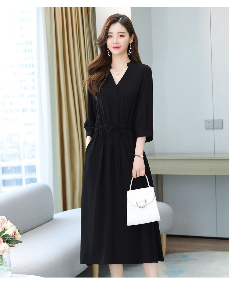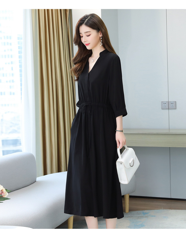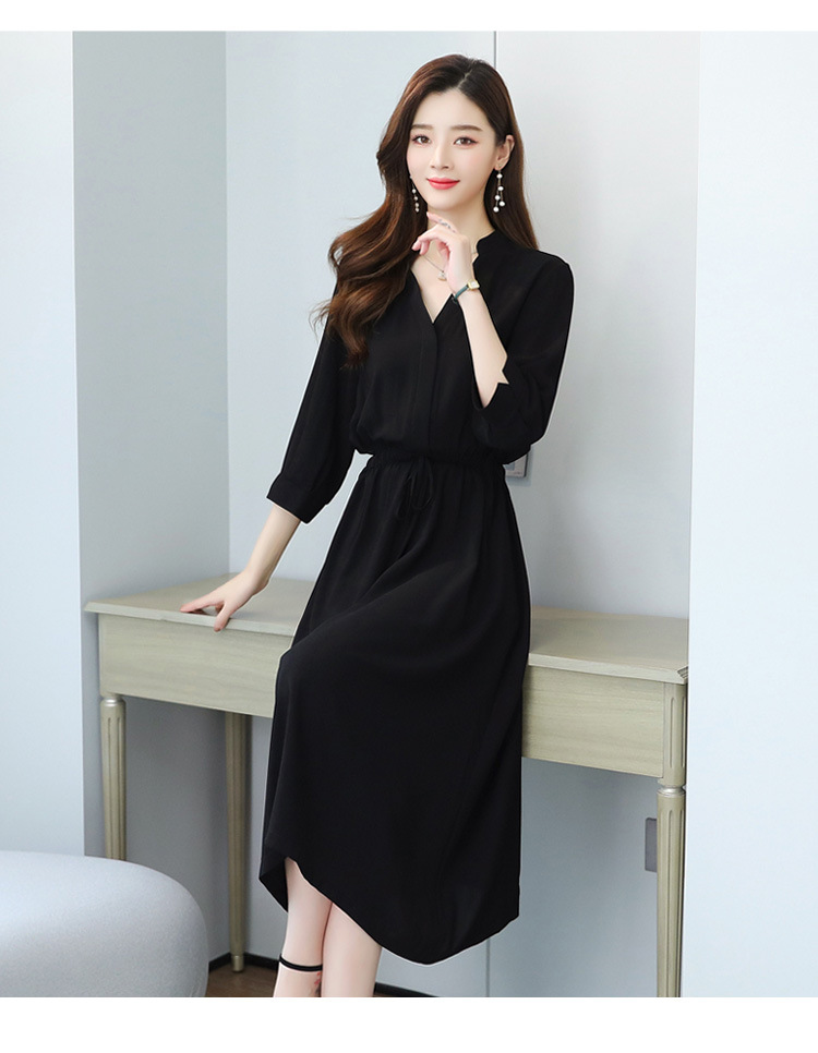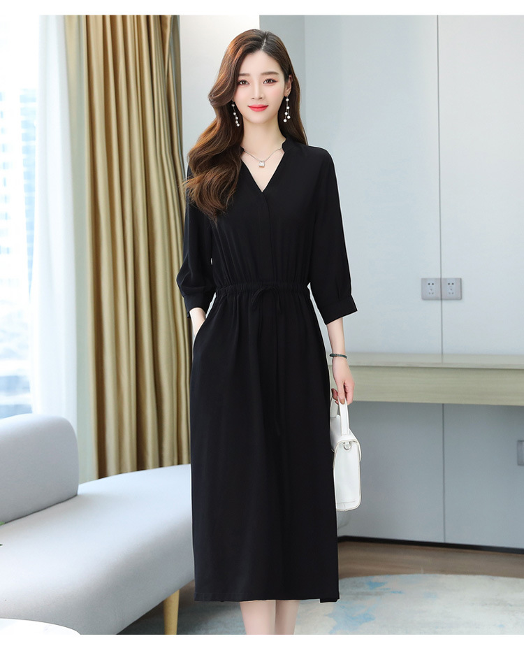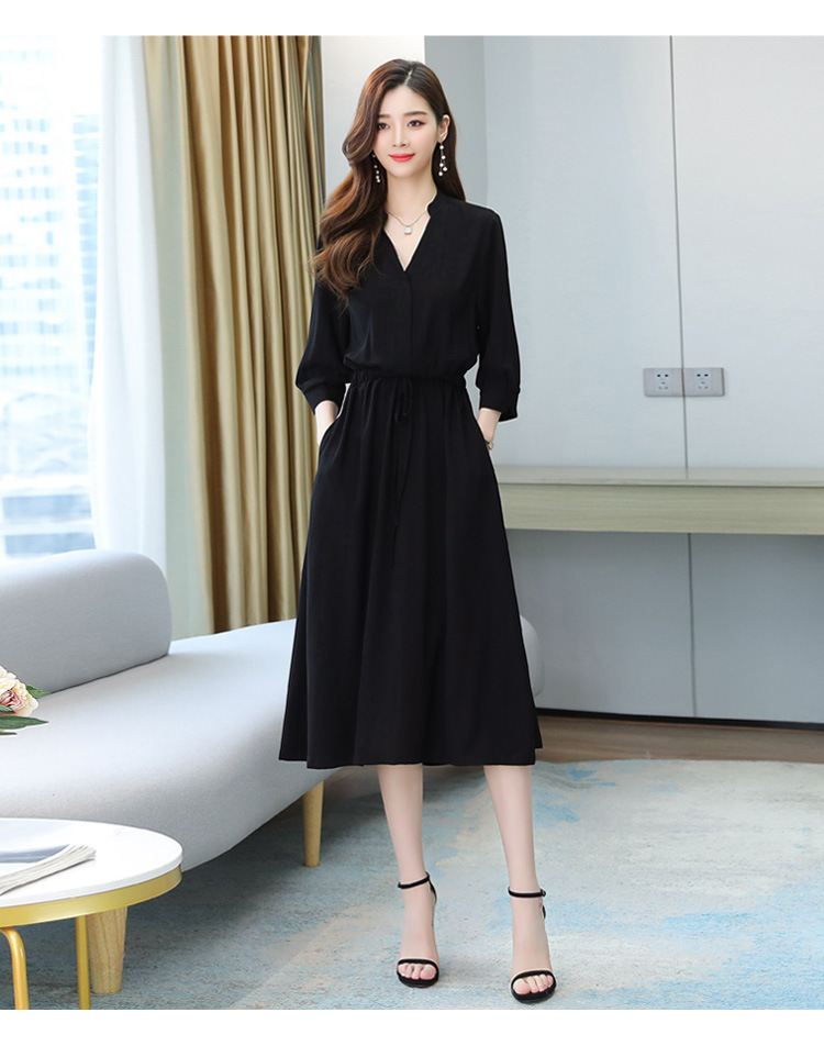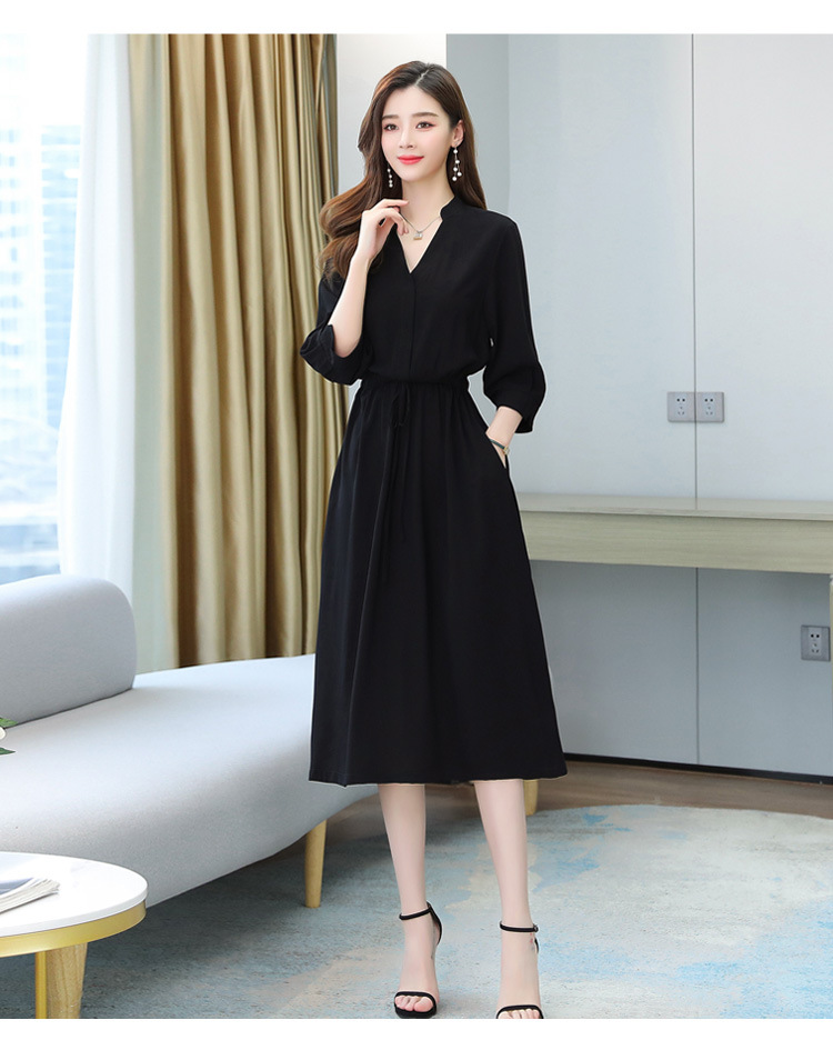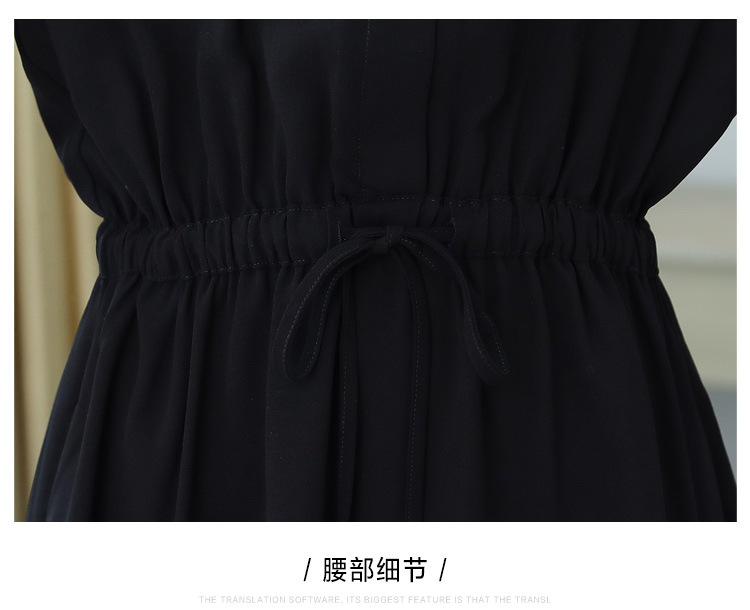 쉬폰 블랙 V-넥 원피스 여성 새로운 여름 허리 슬리밍 캐주얼 우아한 배꼽 커버 프랑스 스타일 원피스