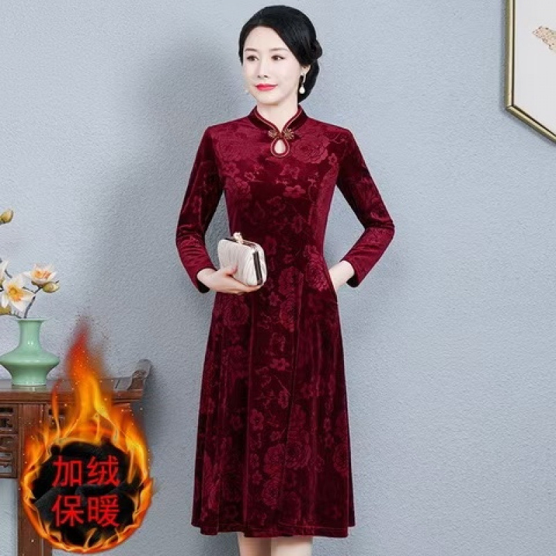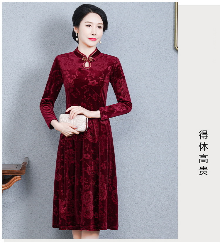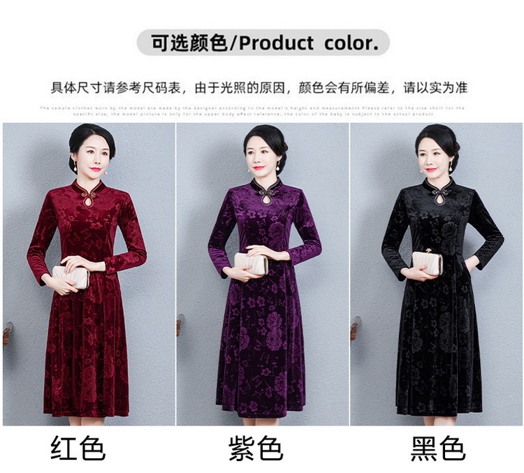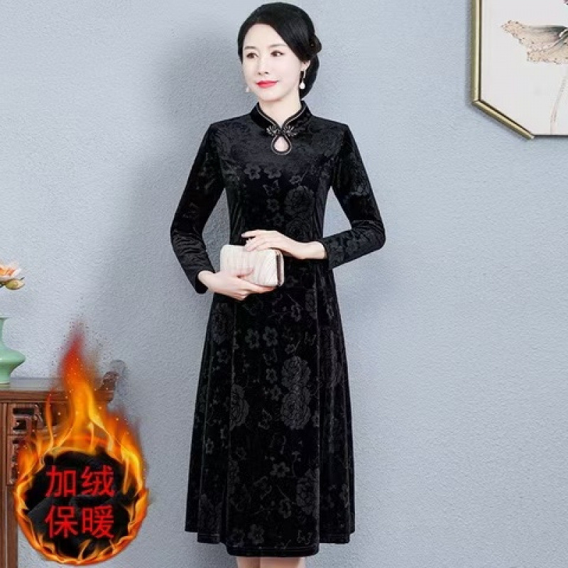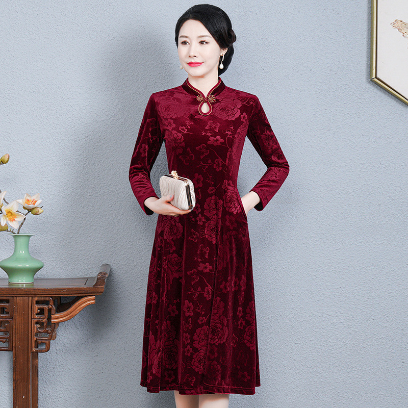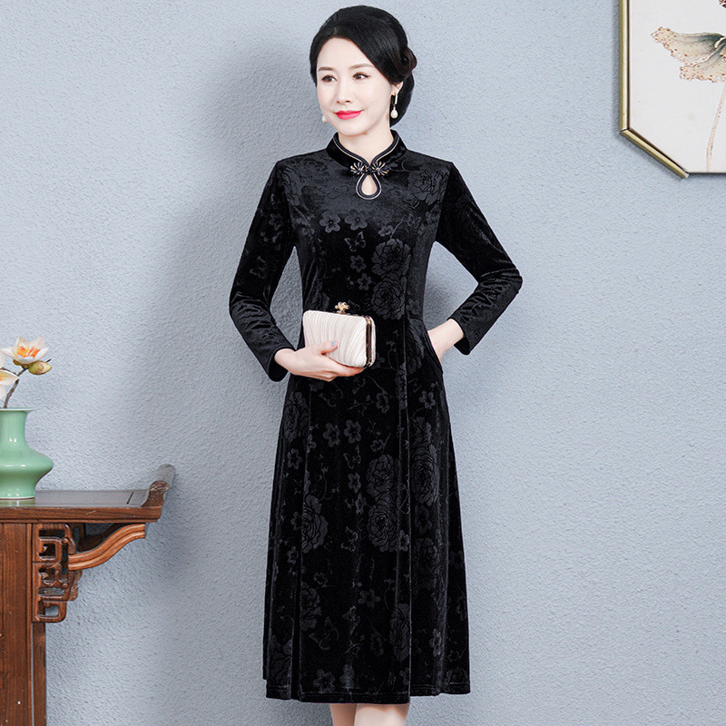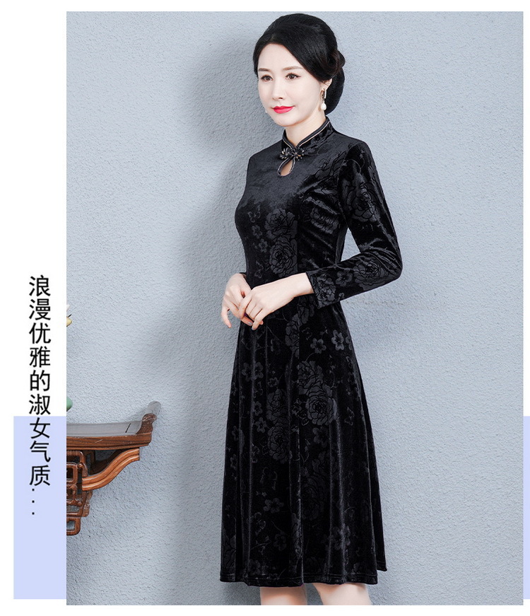 개량된 청삼 원피스 여자 2024 년 봄 · 가을 새 최고급 청삼 슬림핏 황금 벨벳 스커트스토어 가기