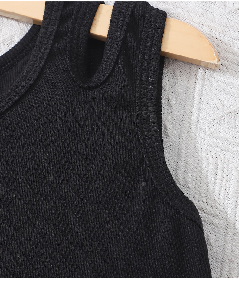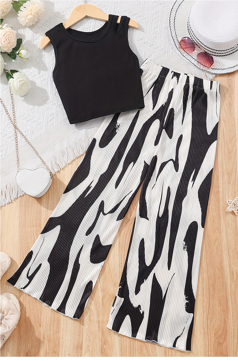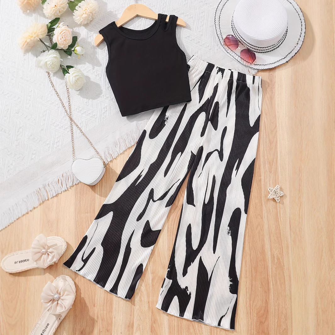 유럽과 미국의 소녀 세트 여름 우아한 단색 조끼 흑백 줄무늬 넓은 다리 바지 대형 어린이를위한 국경 2 종 세트