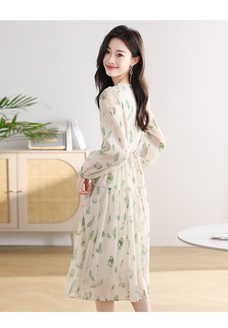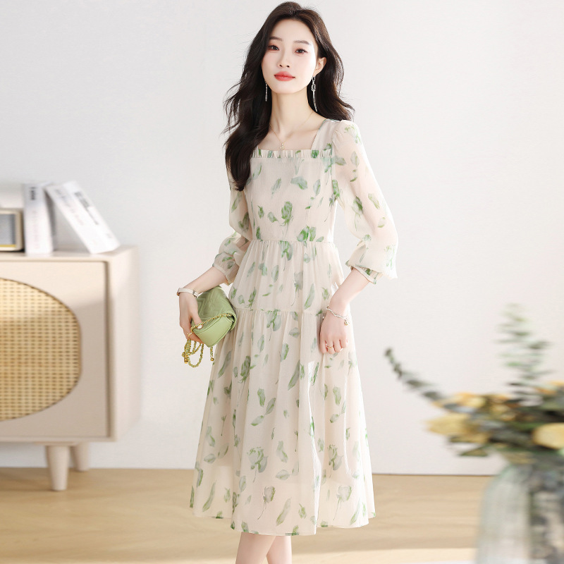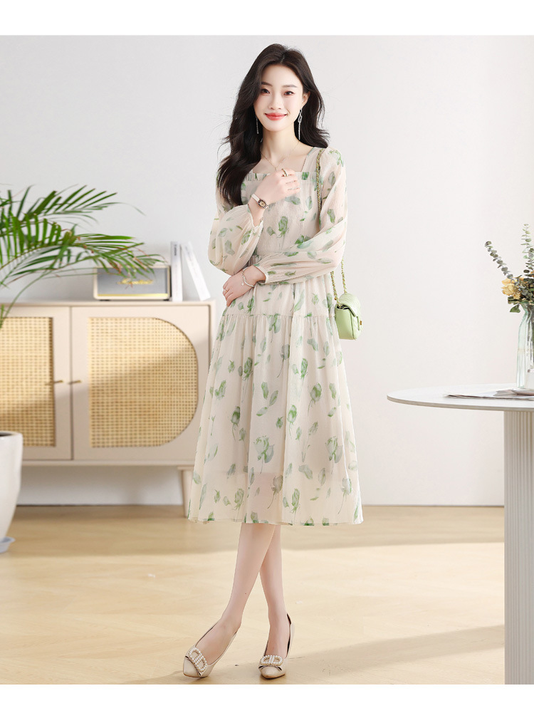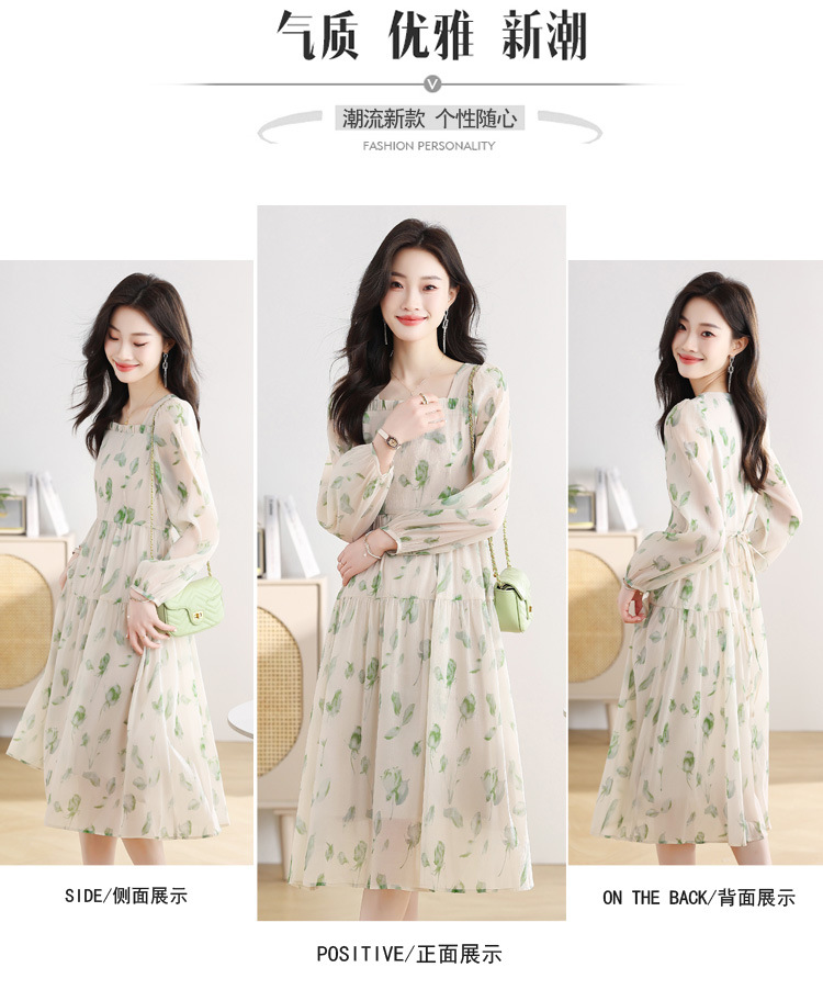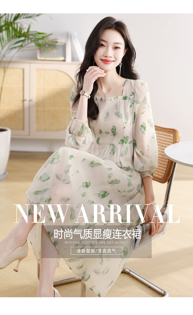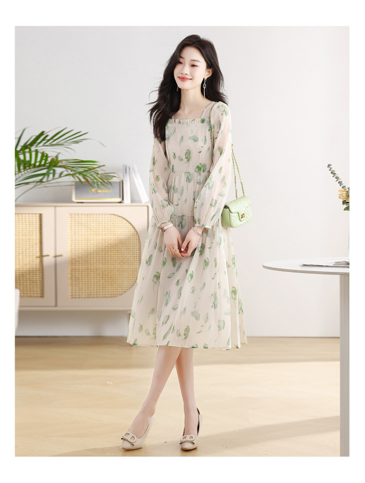 프랑스 스타일 꽃 원피스 봄과 가을 새로운 퍼프 소매 스커트 타이트 허리 슬리밍 니쉬 봄과 가을을위한 우아한 긴 치마스토어 가기