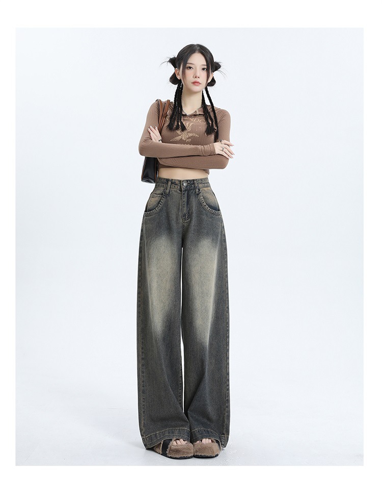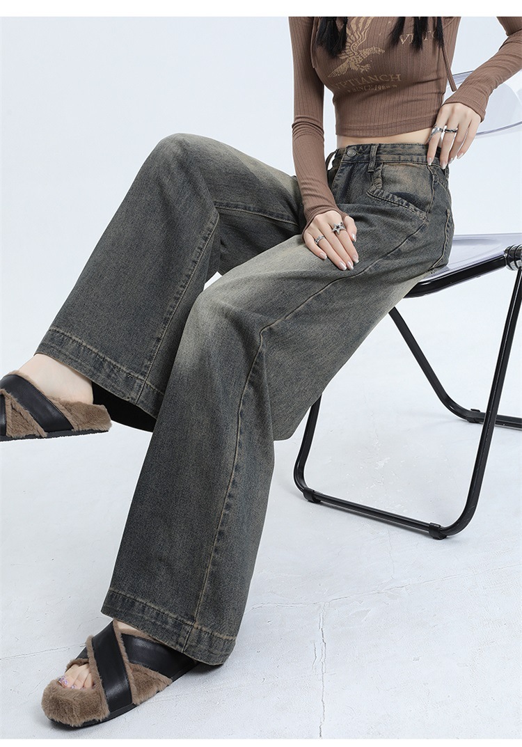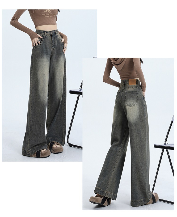 빈티지 옷을 입은 넓은 다리 청바지 여성의 봄과 가을 새로운 스트레이트 루즈 슬림 핏 봄 여성용 바지