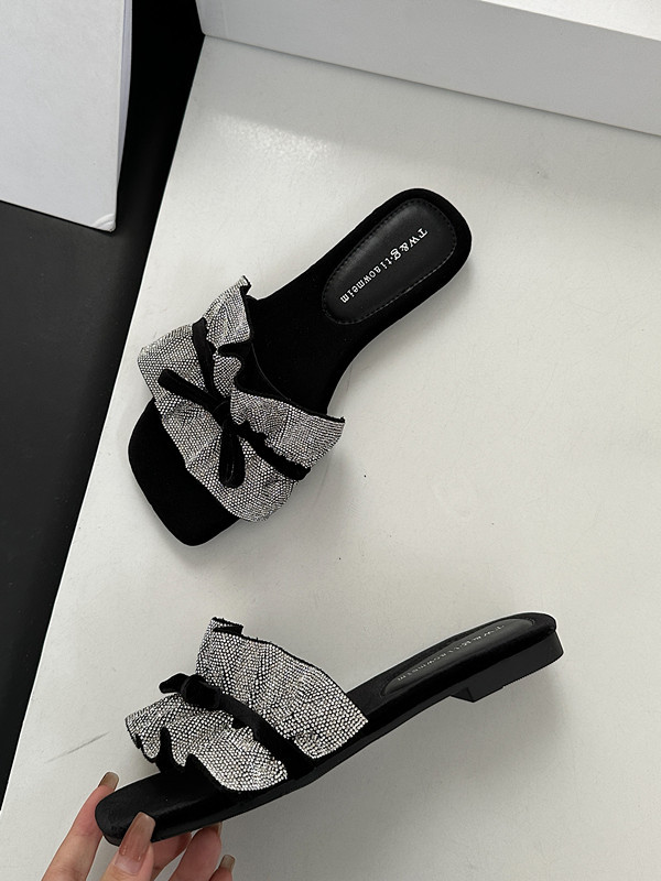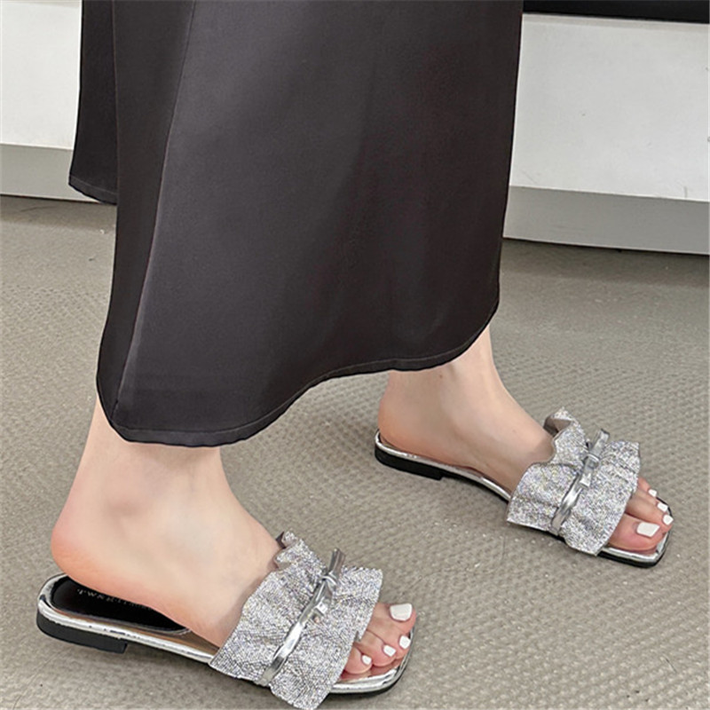 양가죽 프랑스 스타일 활 슬라이드 슬리퍼 여성 여름 의상 광장 발가락 플랫 비치 샌들스토어 가기