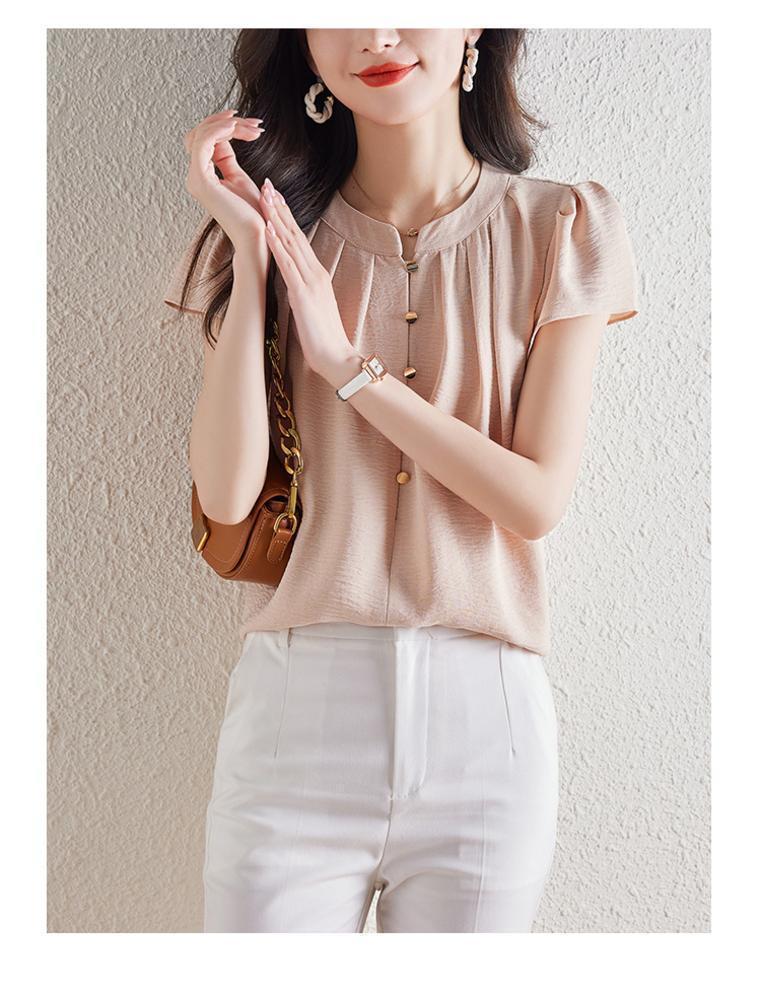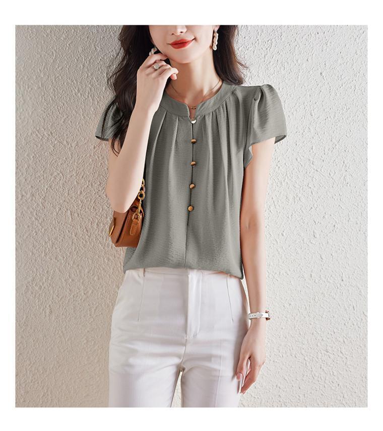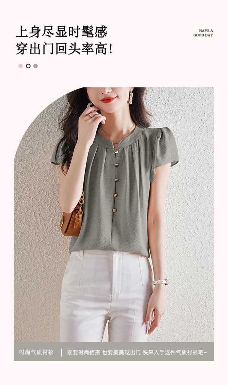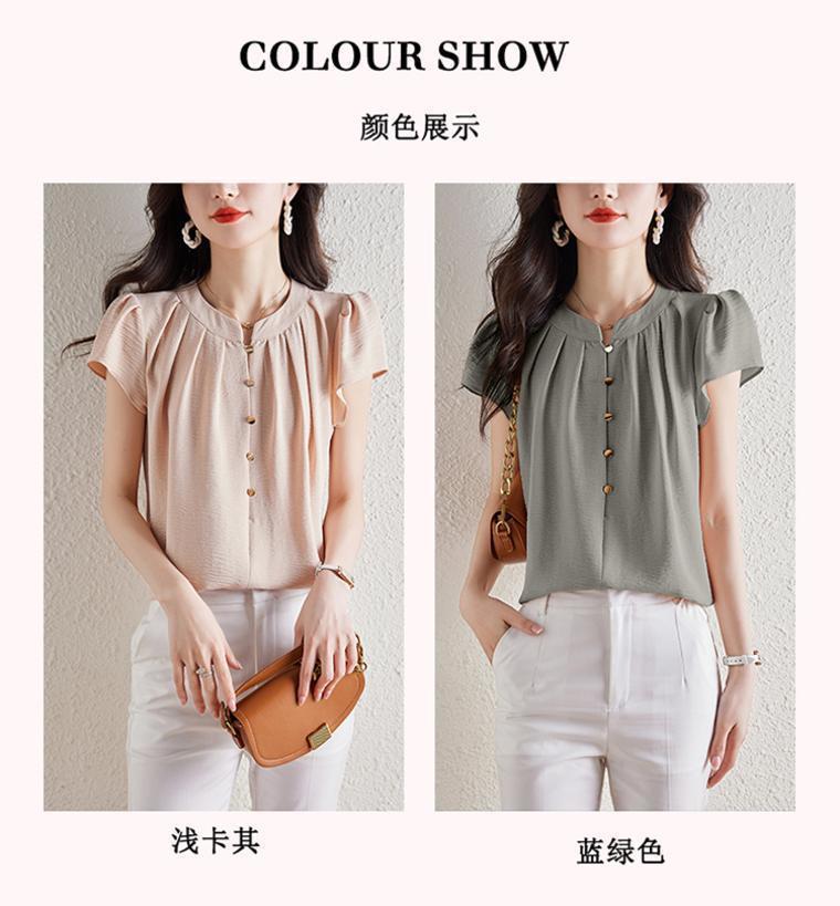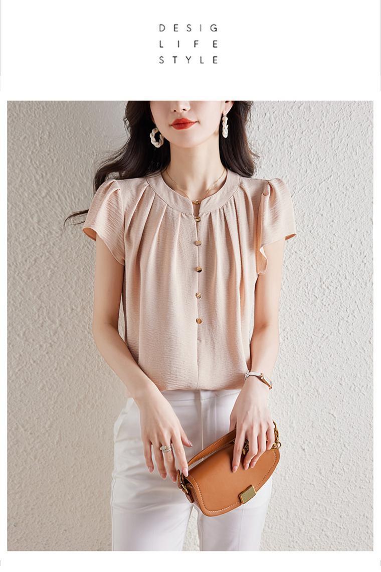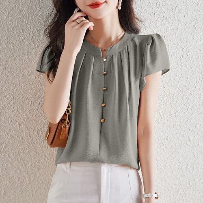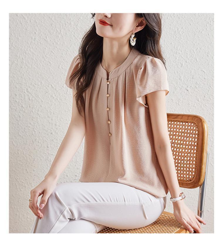 여름 새로운 라운드 넥 하프 오픈 버튼 짧은 소매 셔츠 여성의 여름 퍼프 소매 셔츠 우아한 나이 감소 쉬폰 탑스토어 가기