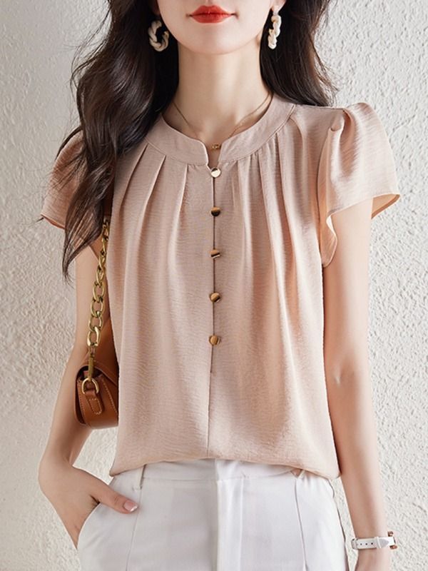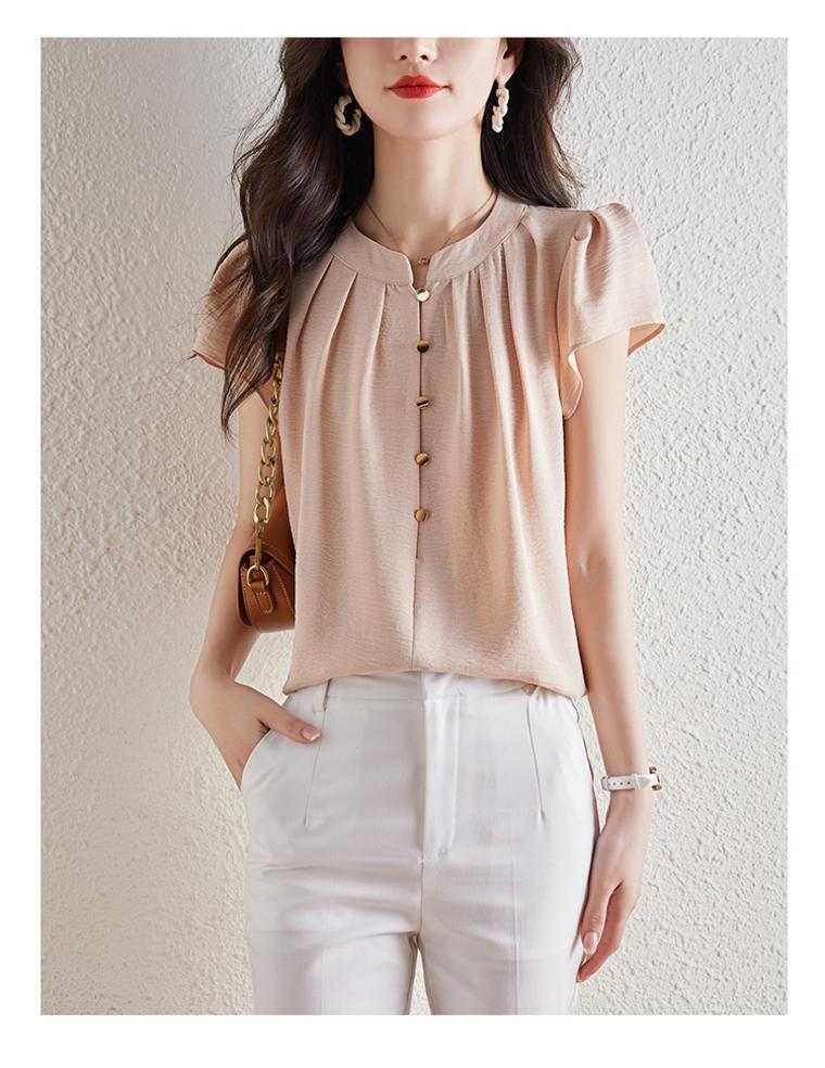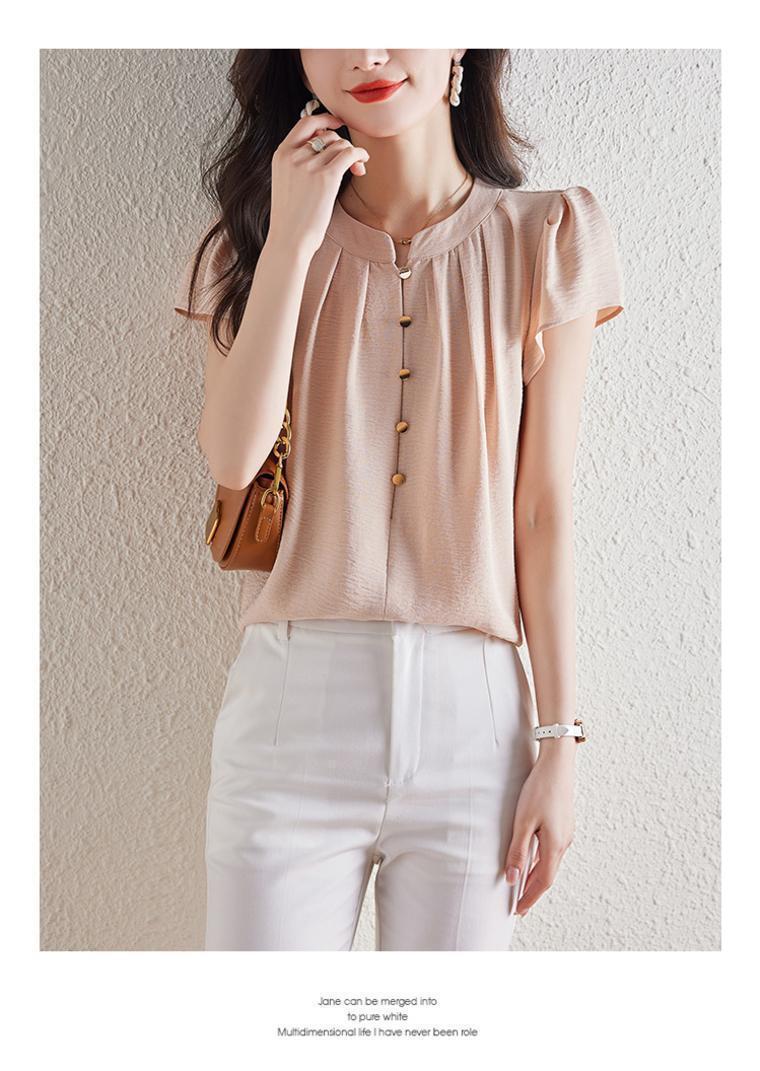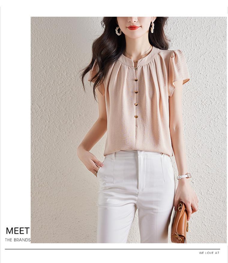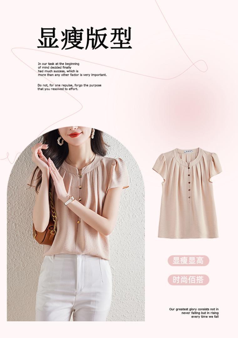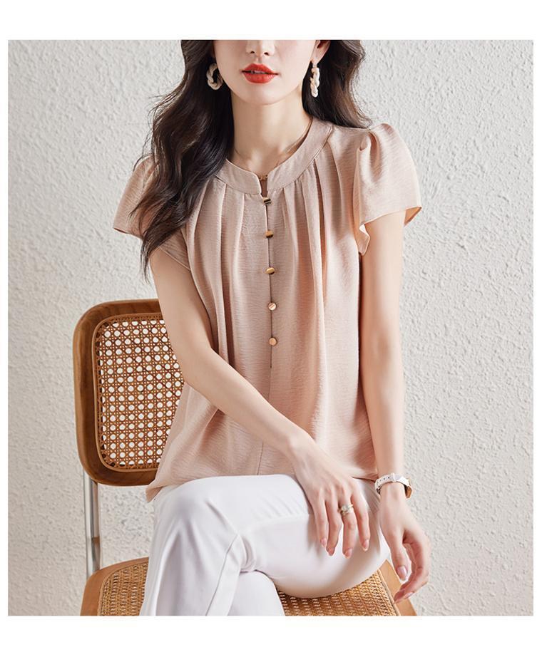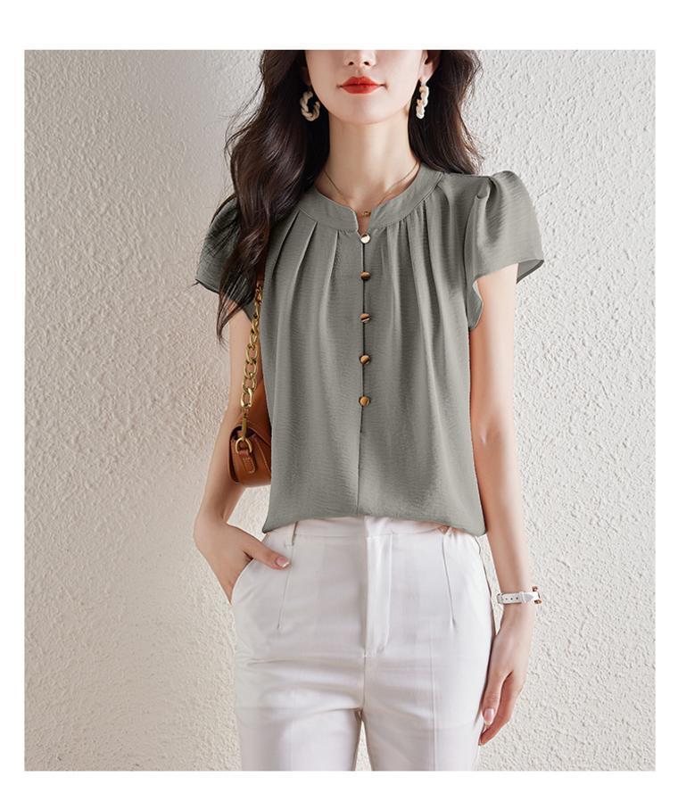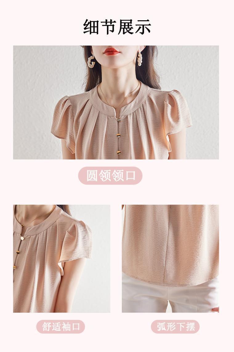 여름 새로운 라운드 넥 하프 오픈 버튼 짧은 소매 셔츠 여성의 여름 퍼프 소매 셔츠 우아한 나이 감소 쉬폰 탑스토어 가기