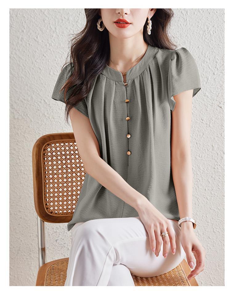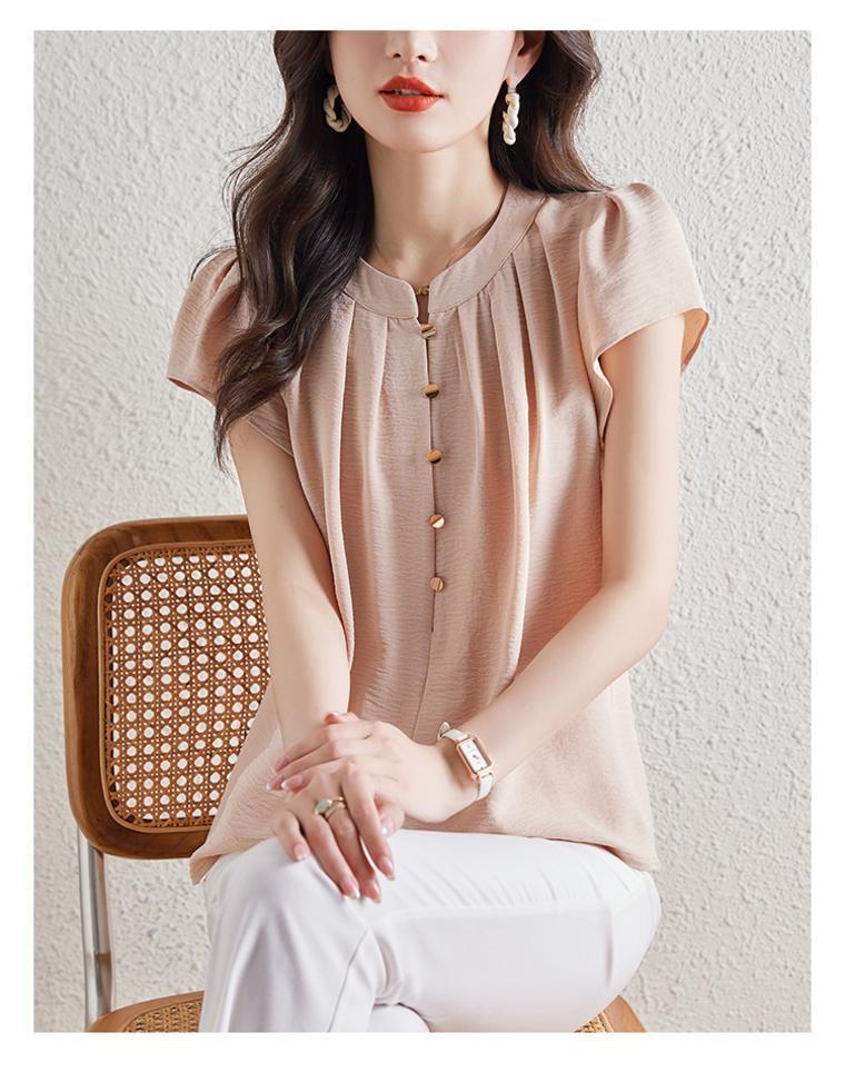 여름 새로운 라운드 넥 하프 오픈 버튼 짧은 소매 셔츠 여성의 여름 퍼프 소매 셔츠 우아한 나이 감소 쉬폰 탑