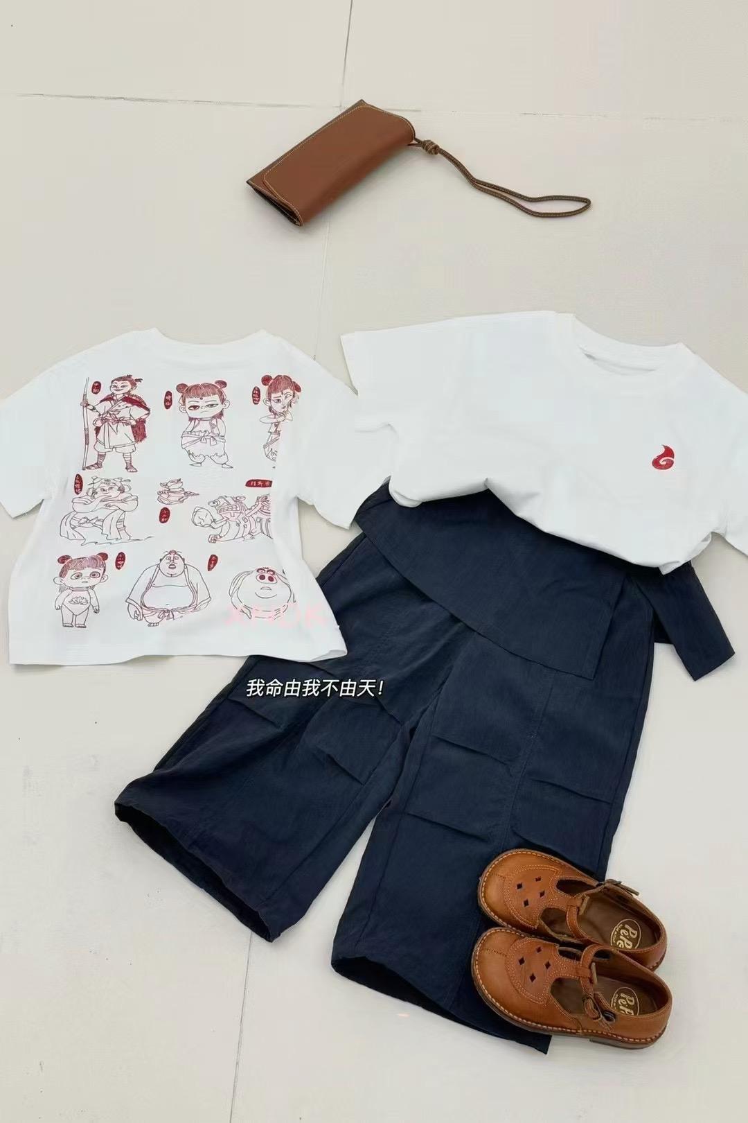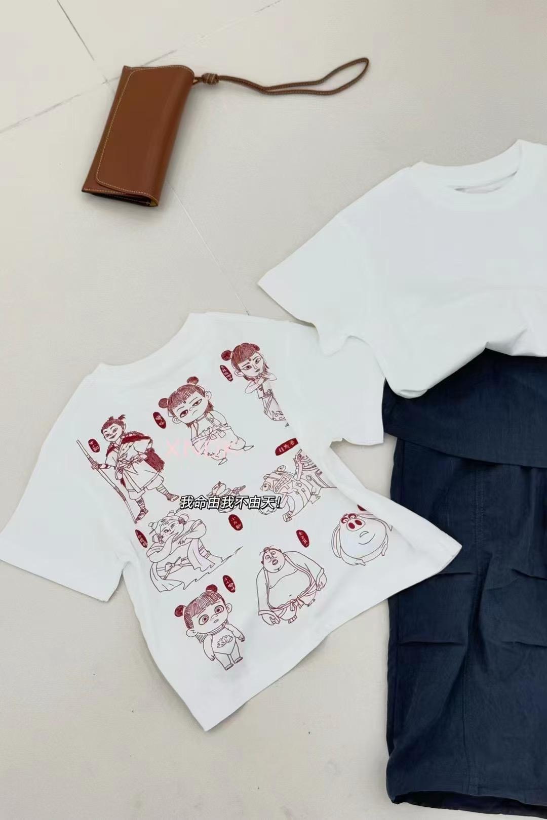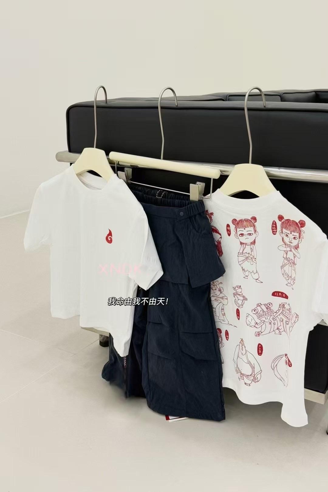 한국 스타일 아동복 여름 화이트 네자 인쇄 반팔 티셔츠 소년 소녀 만화 애니메이션 루즈 탑 트렌디스토어 가기
