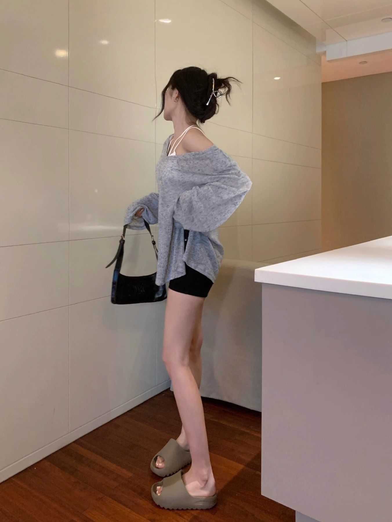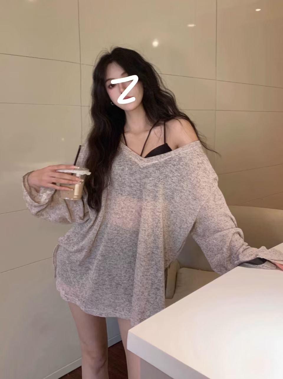 2025 여름 섹시한 긴팔 티셔츠 여성용 목 스트랩 얇은 디자인 감각 느슨한 태양 보호 블라우스 탑