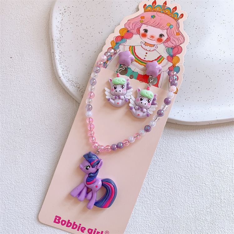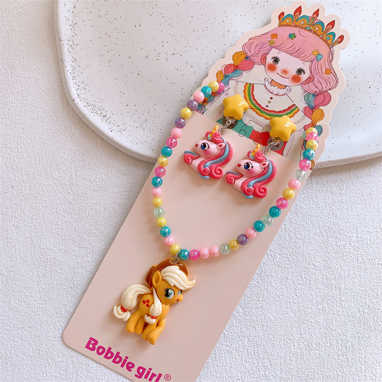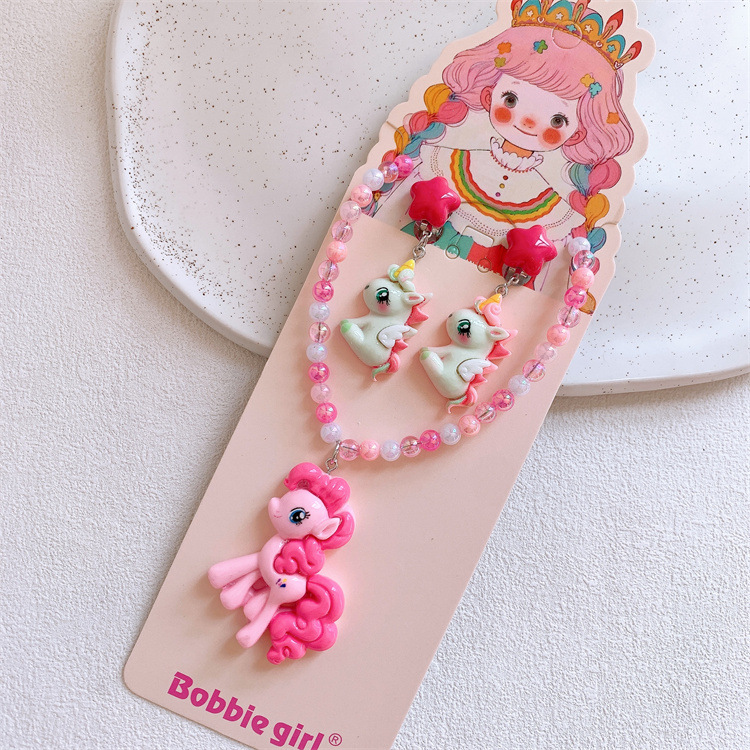어린이 귀여운 만화 컬러 포니 비즈 목걸이 소녀 공주 펜던트 귀 클립 아기 생일 선물 보석스토어 가기