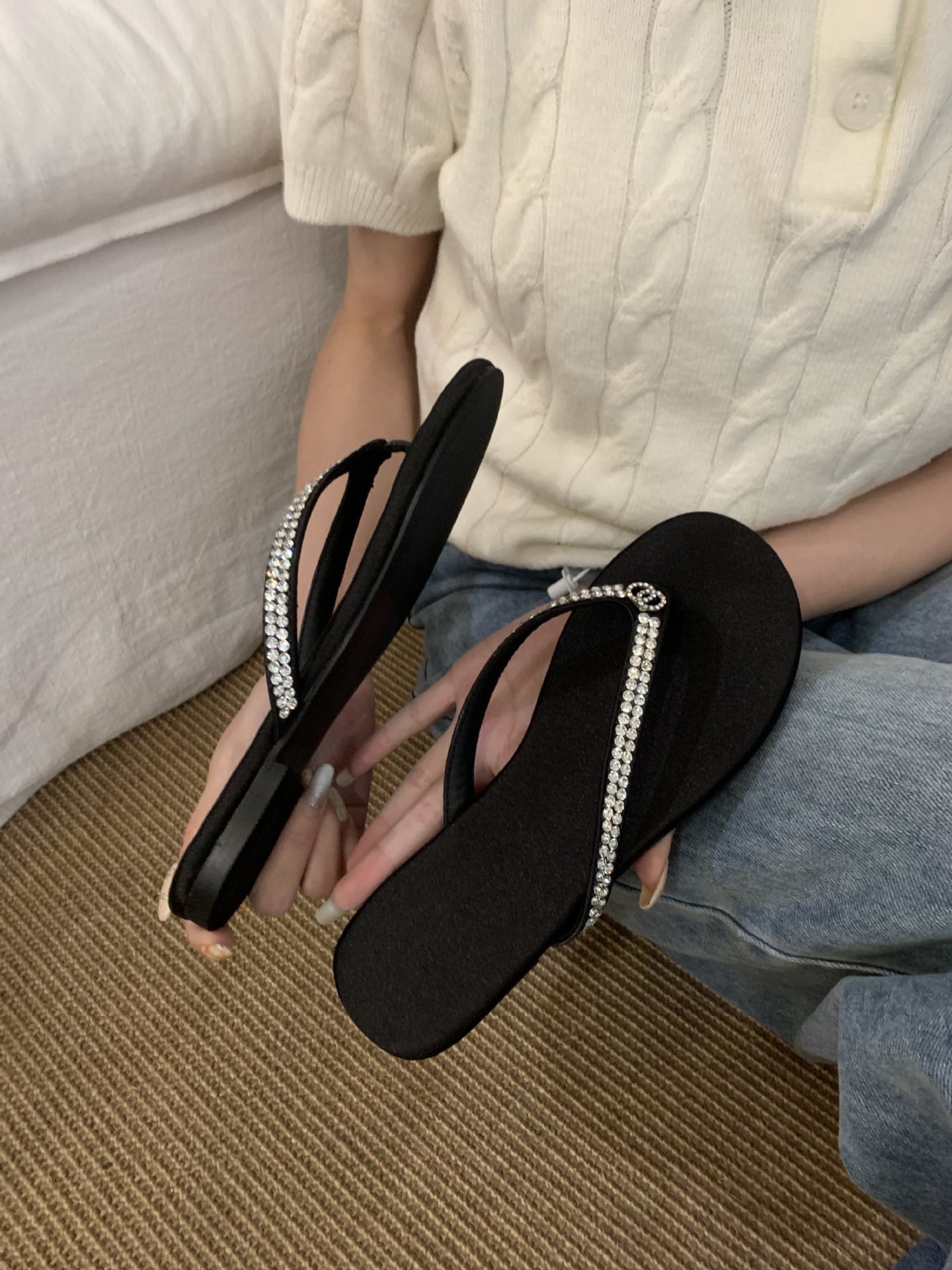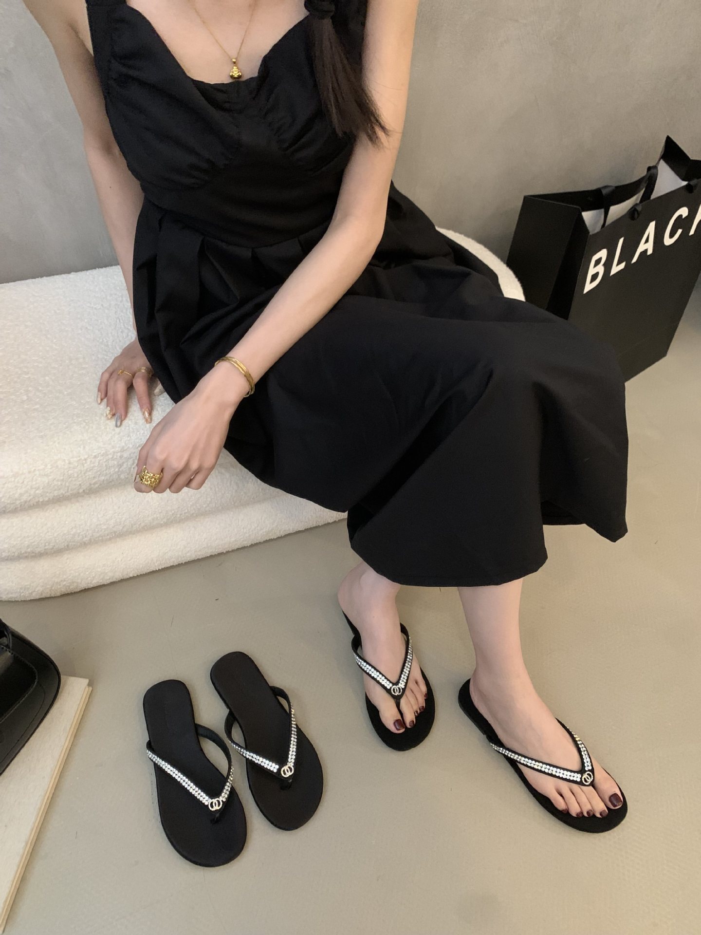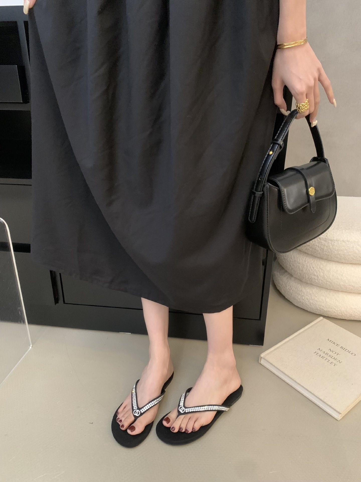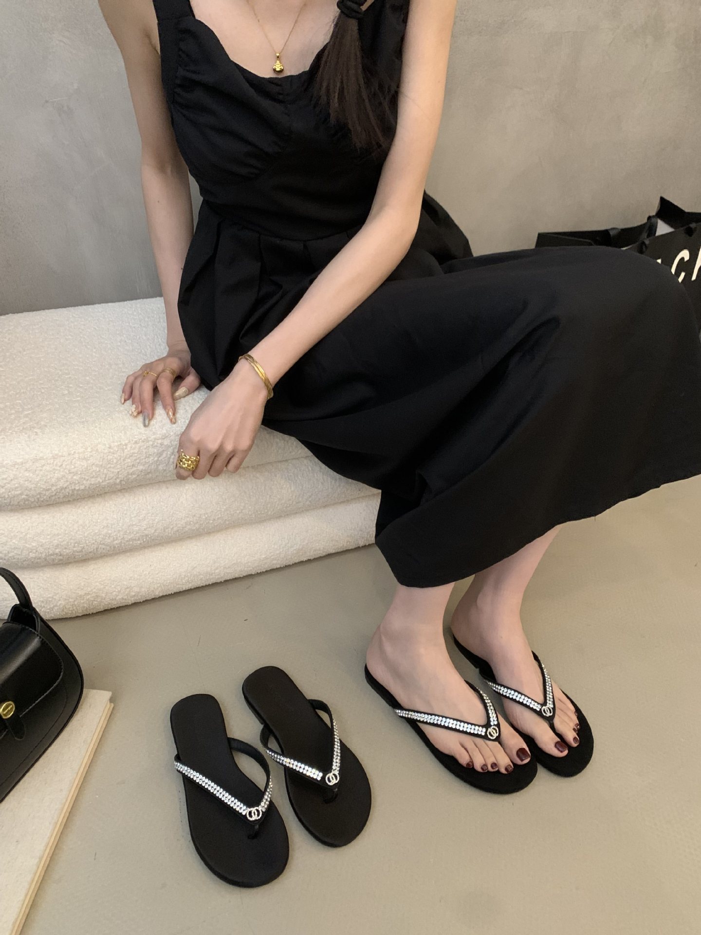 2025 새로운 스타일의 향기로운 스타일 플립 플롭 여성용 플랫 통 발가락 비치 슈즈 외부 착용 Satin Suede Rhinestone 샌들스토어 가기