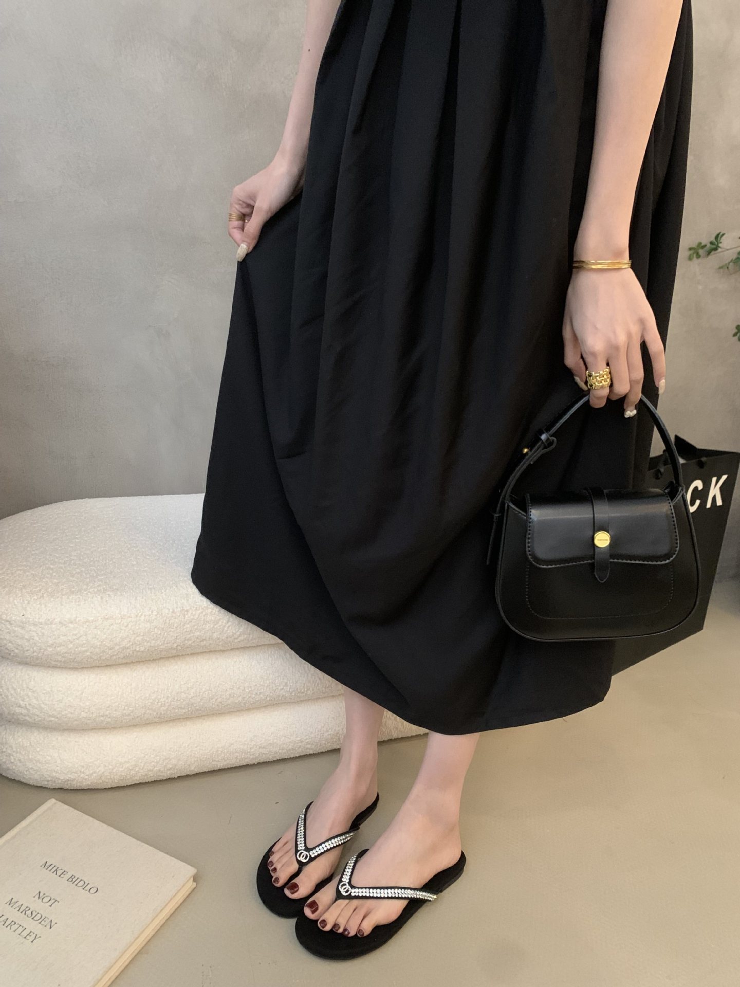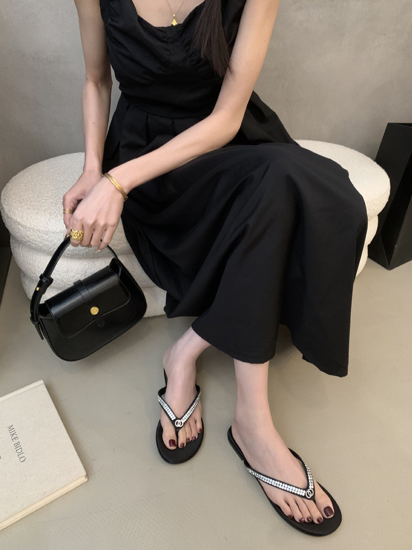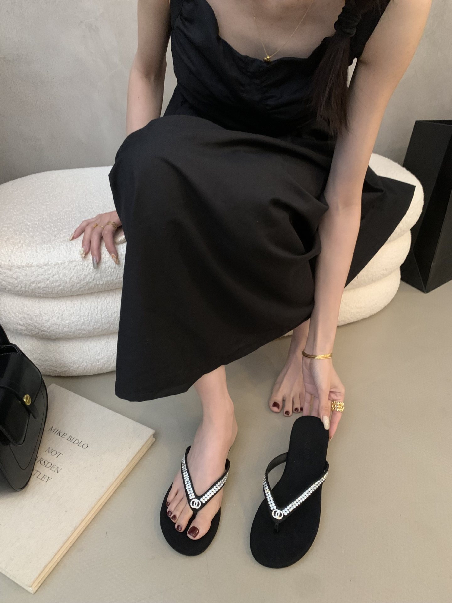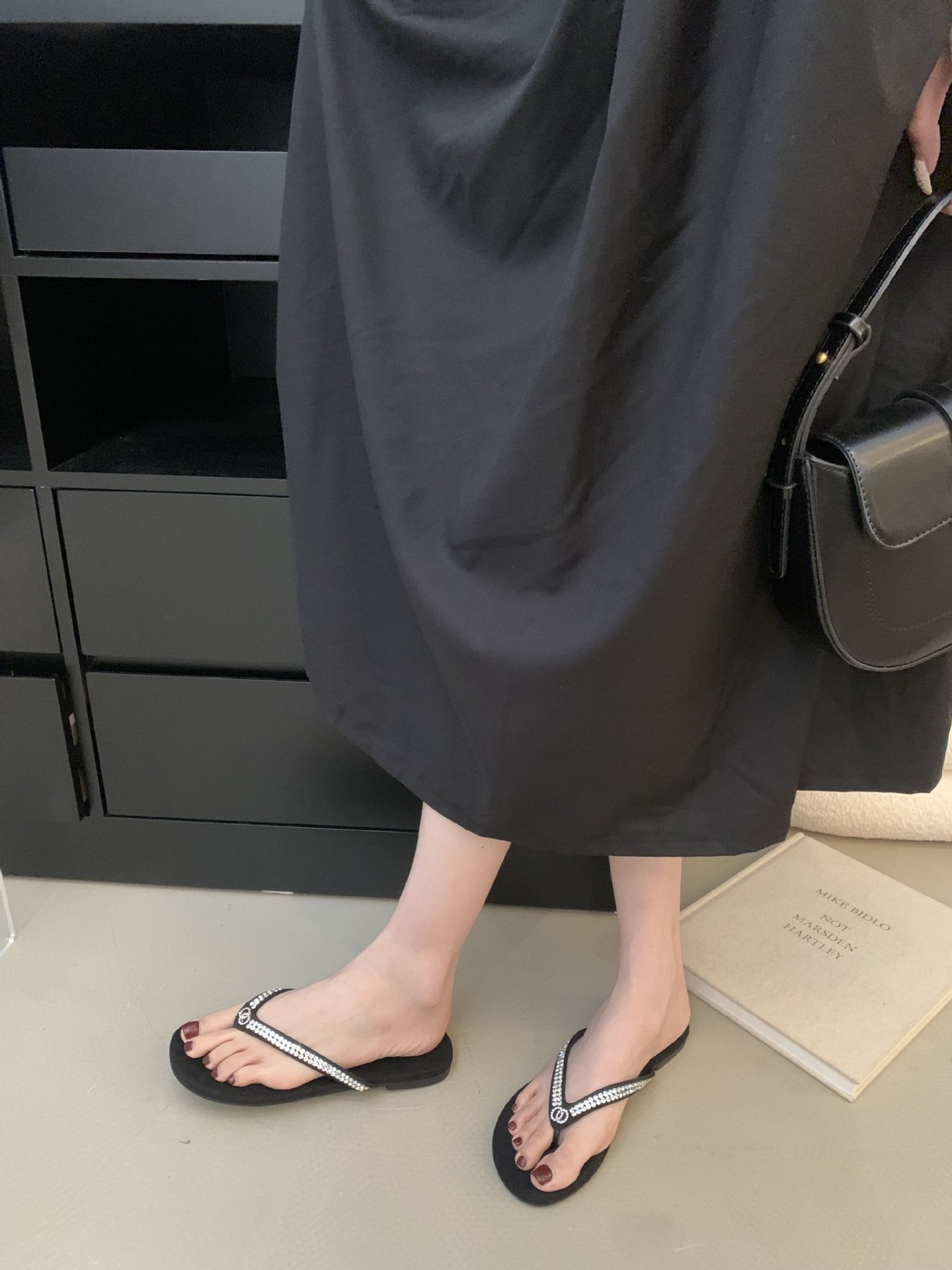 2025 새로운 스타일의 향기로운 스타일 플립 플롭 여성용 플랫 통 발가락 비치 슈즈 외부 착용 Satin Suede Rhinestone 샌들스토어 가기