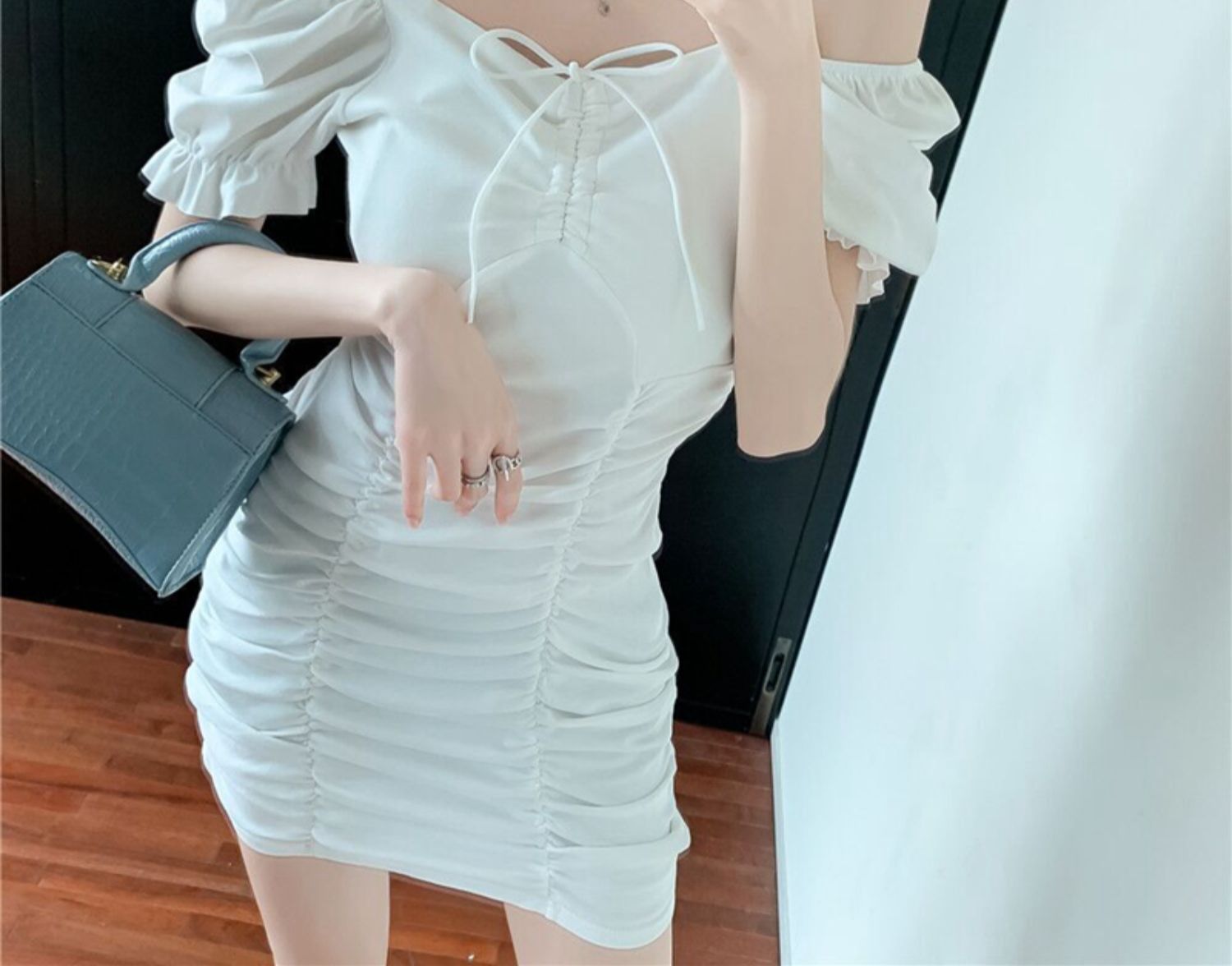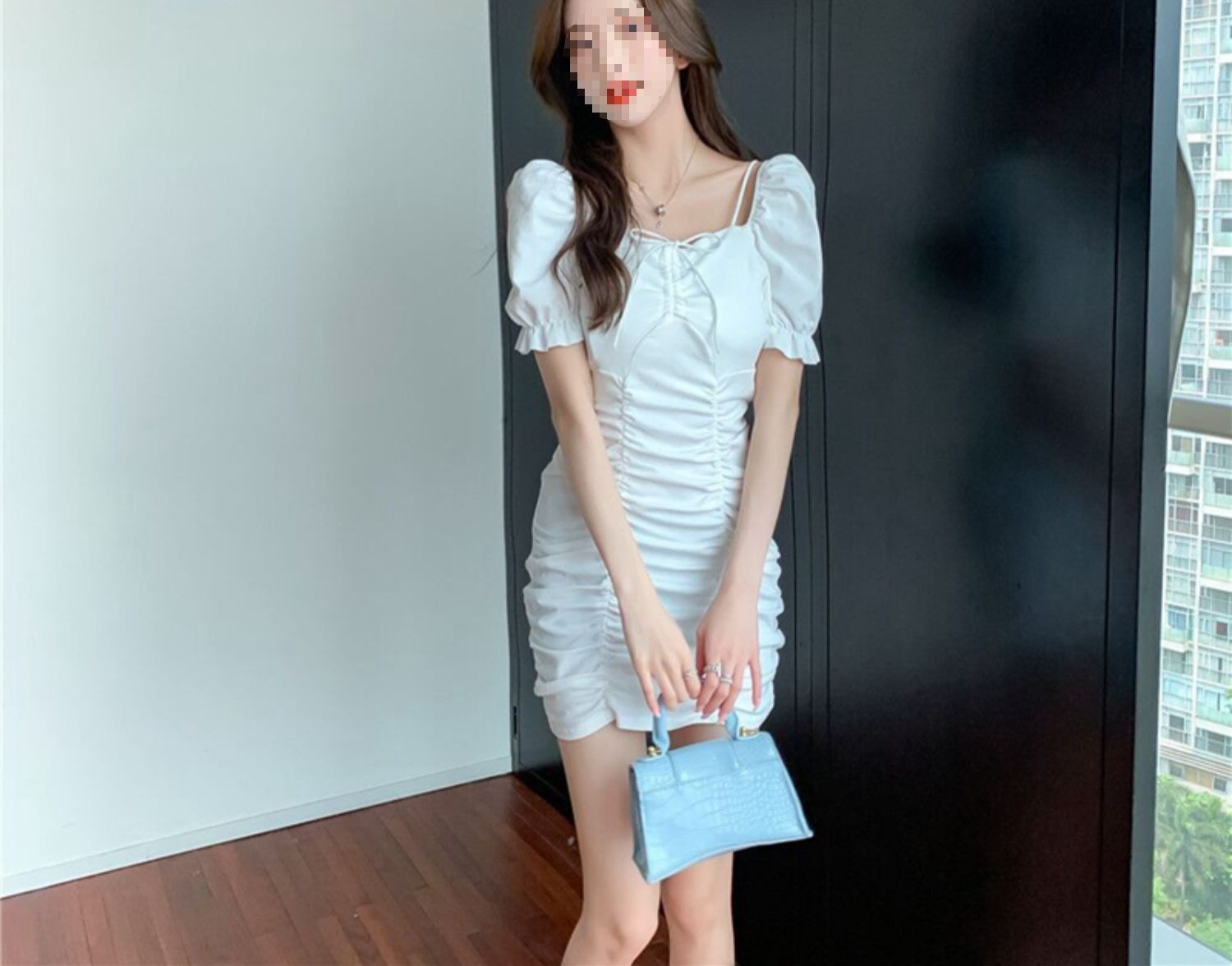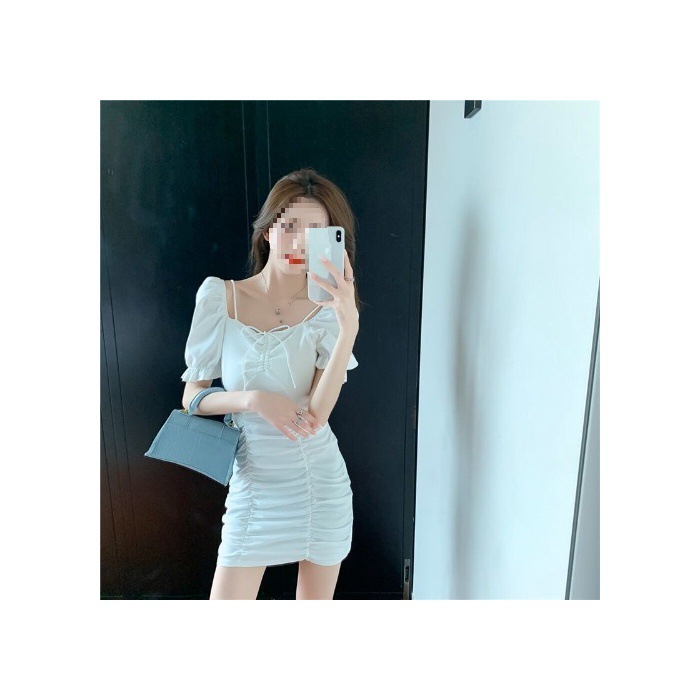 프랑스 스퀘어 칼라 슬림 기질 섹시한 순수한 드로 스트링 주름 허리 짧은 소매 원피스 여성