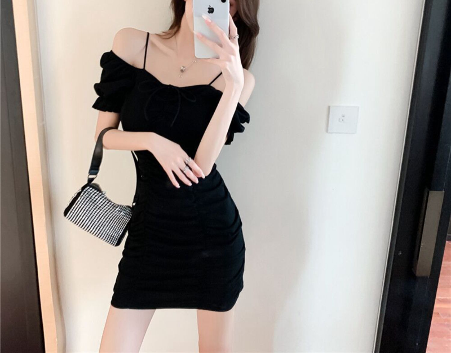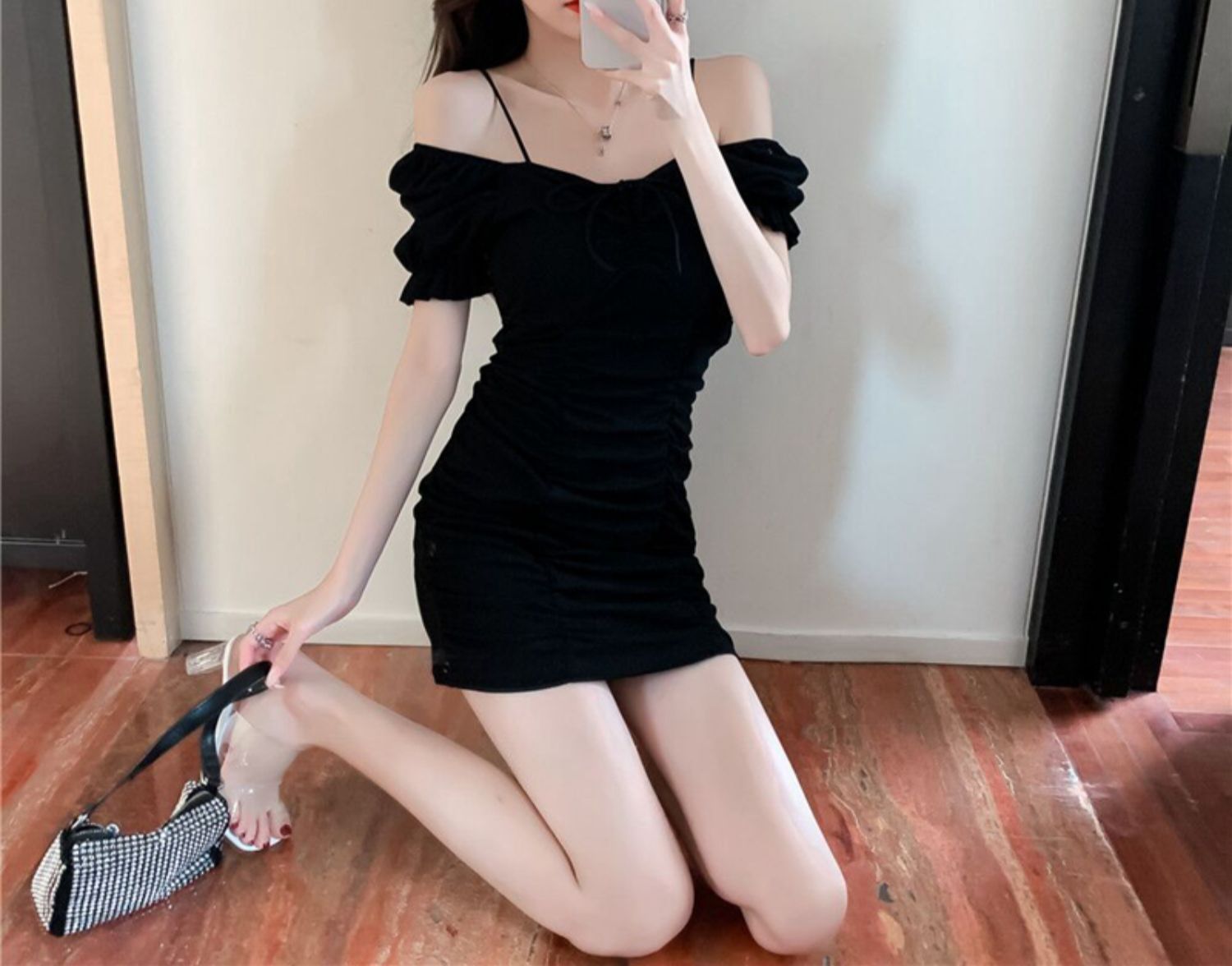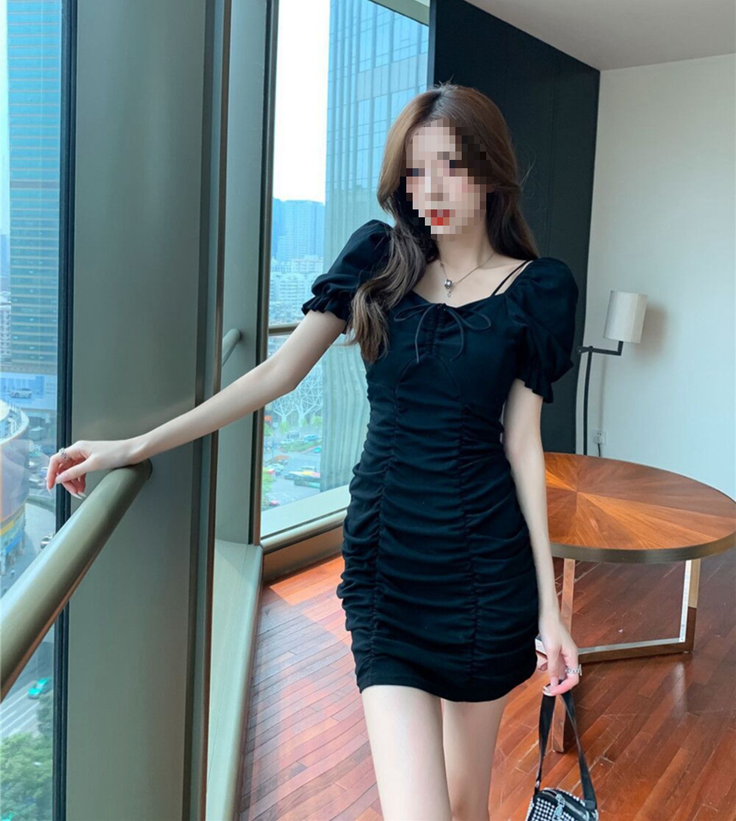 프랑스 스퀘어 칼라 슬림 기질 섹시한 순수한 드로 스트링 주름 허리 짧은 소매 원피스 여성