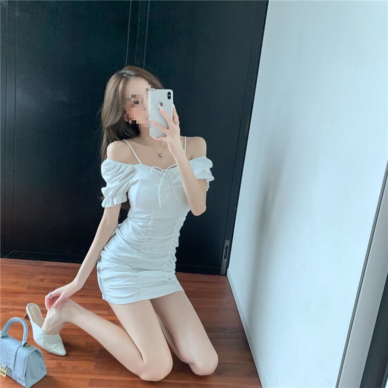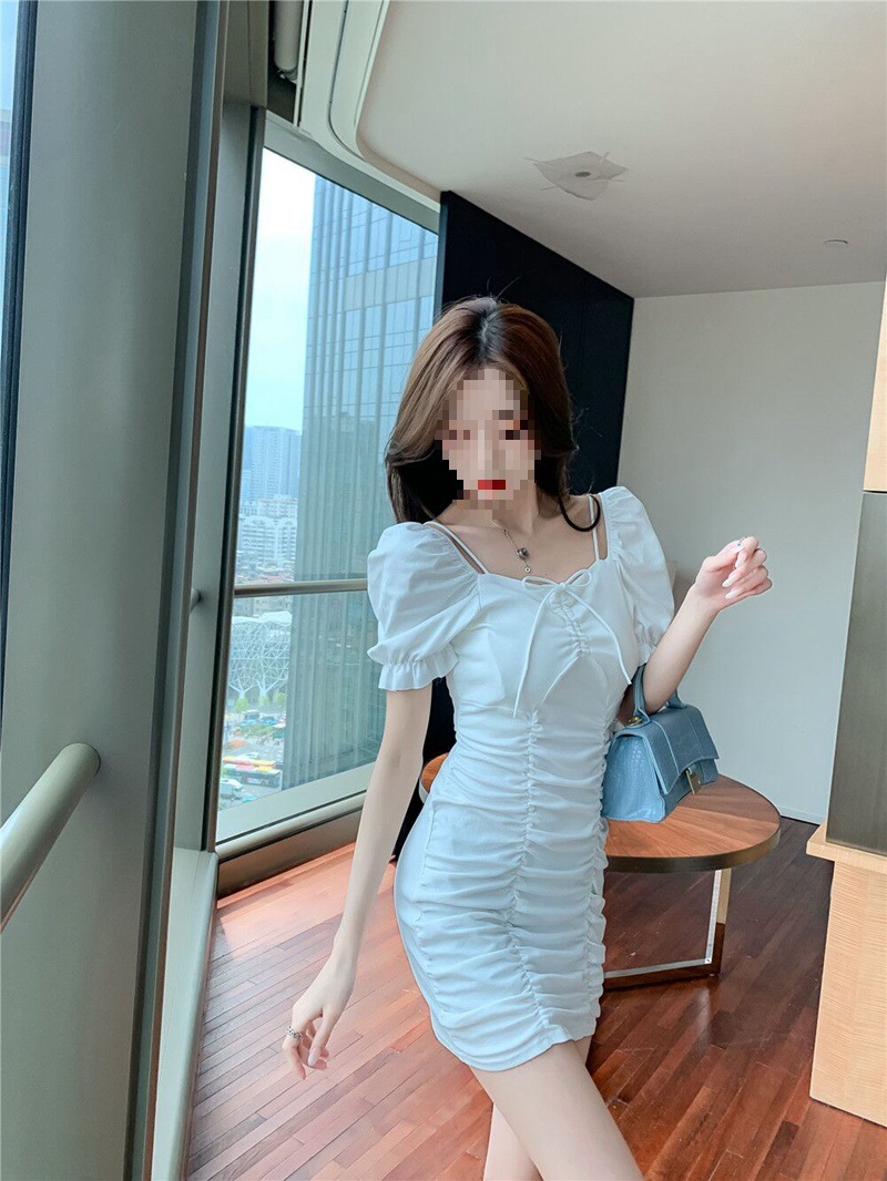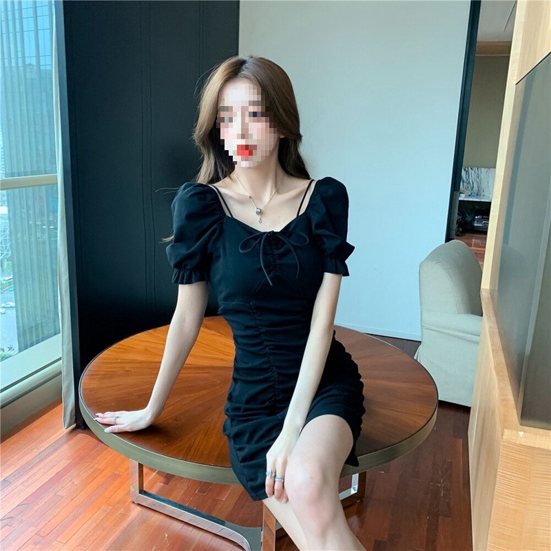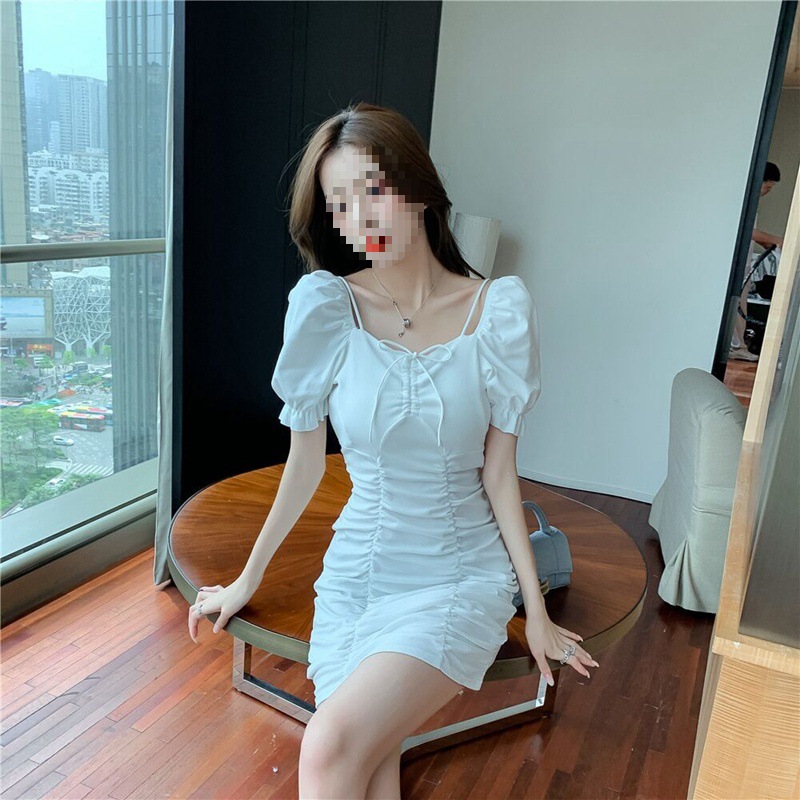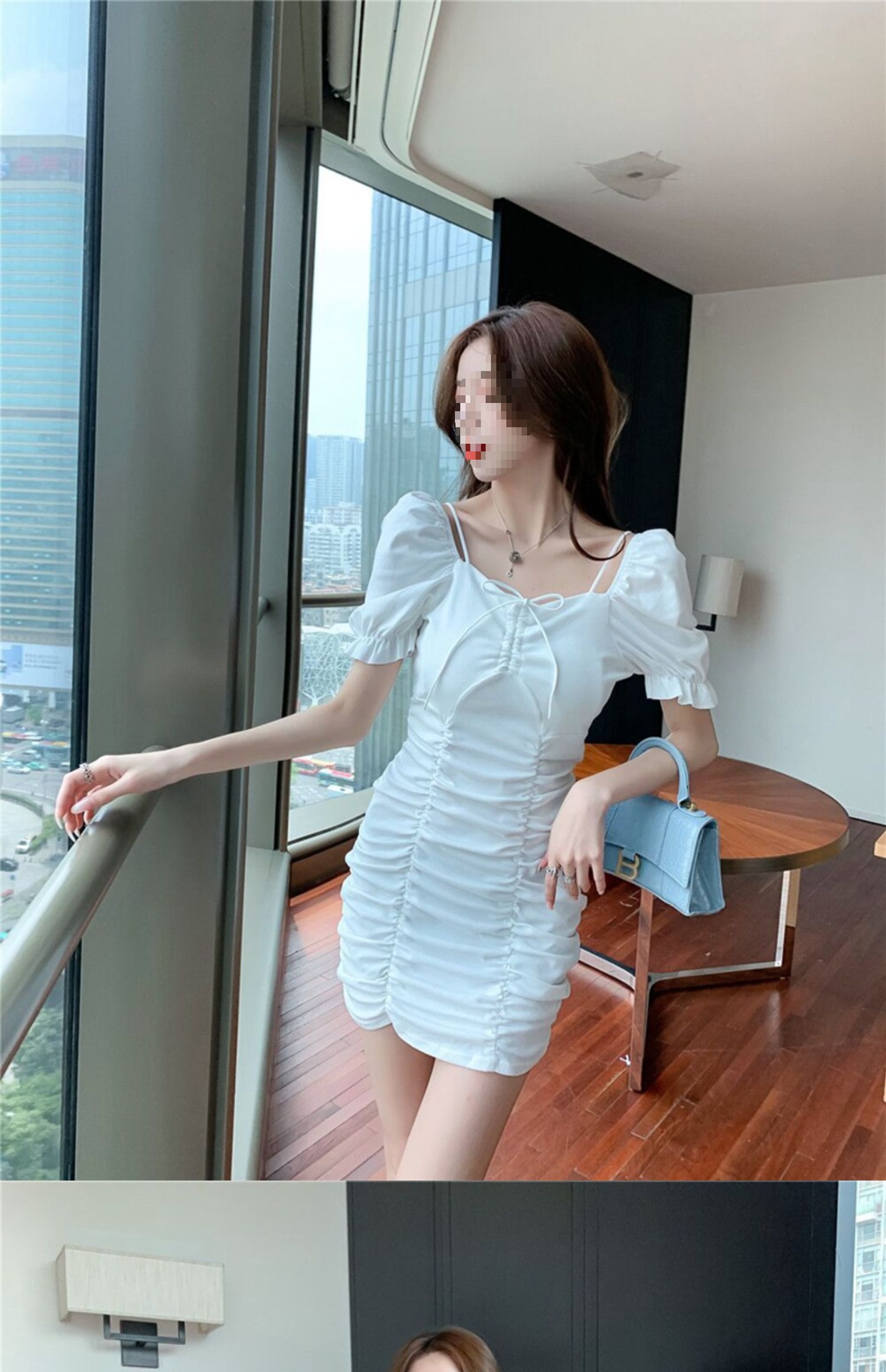 프랑스 스퀘어 칼라 슬림 기질 섹시한 순수한 드로 스트링 주름 허리 짧은 소매 원피스 여성스토어 가기
