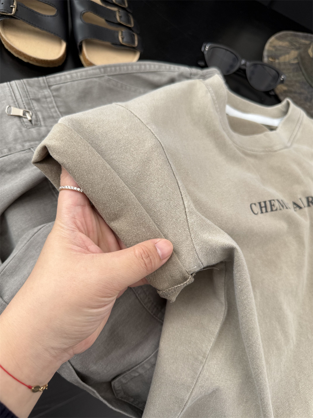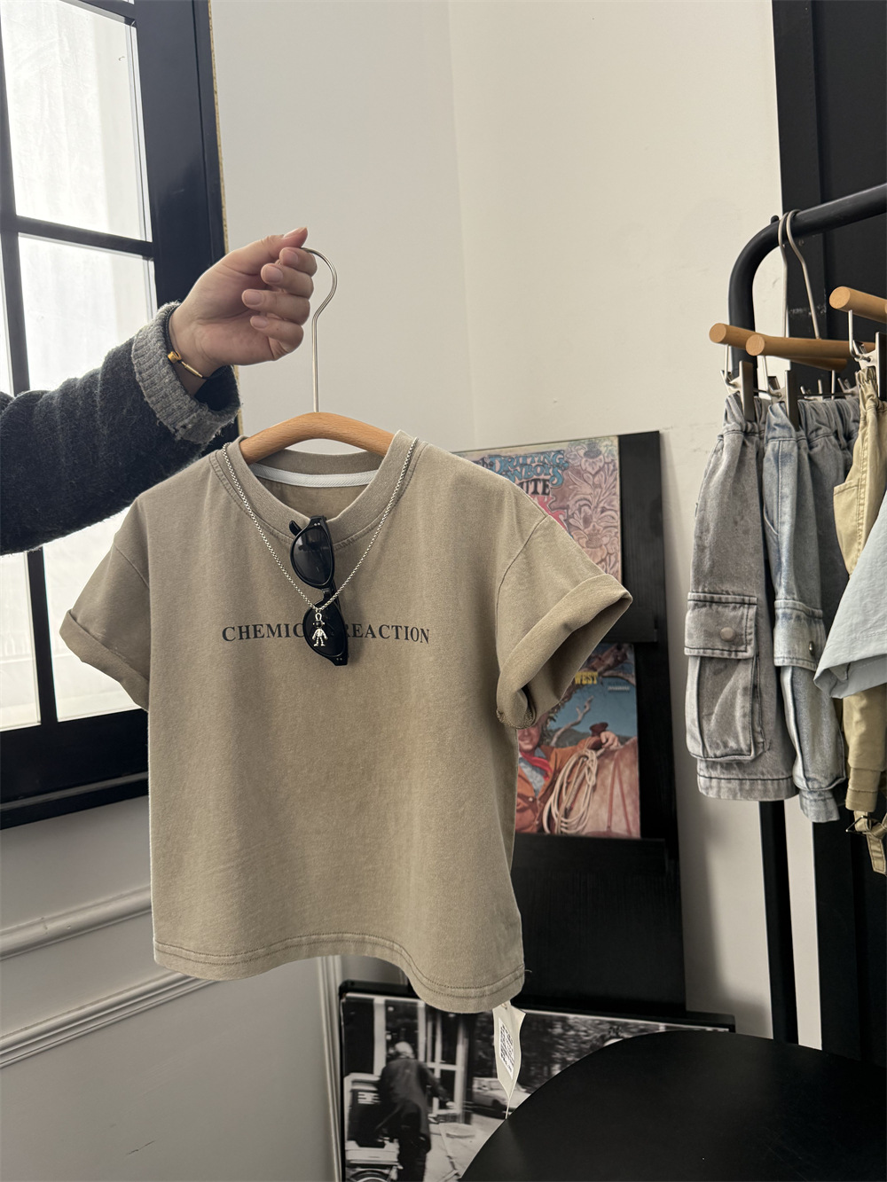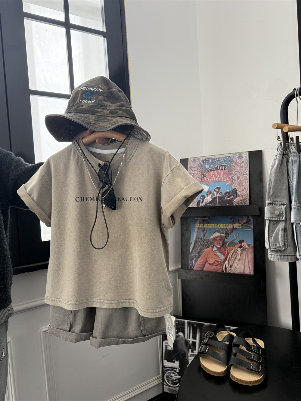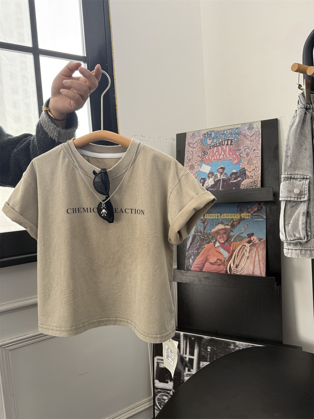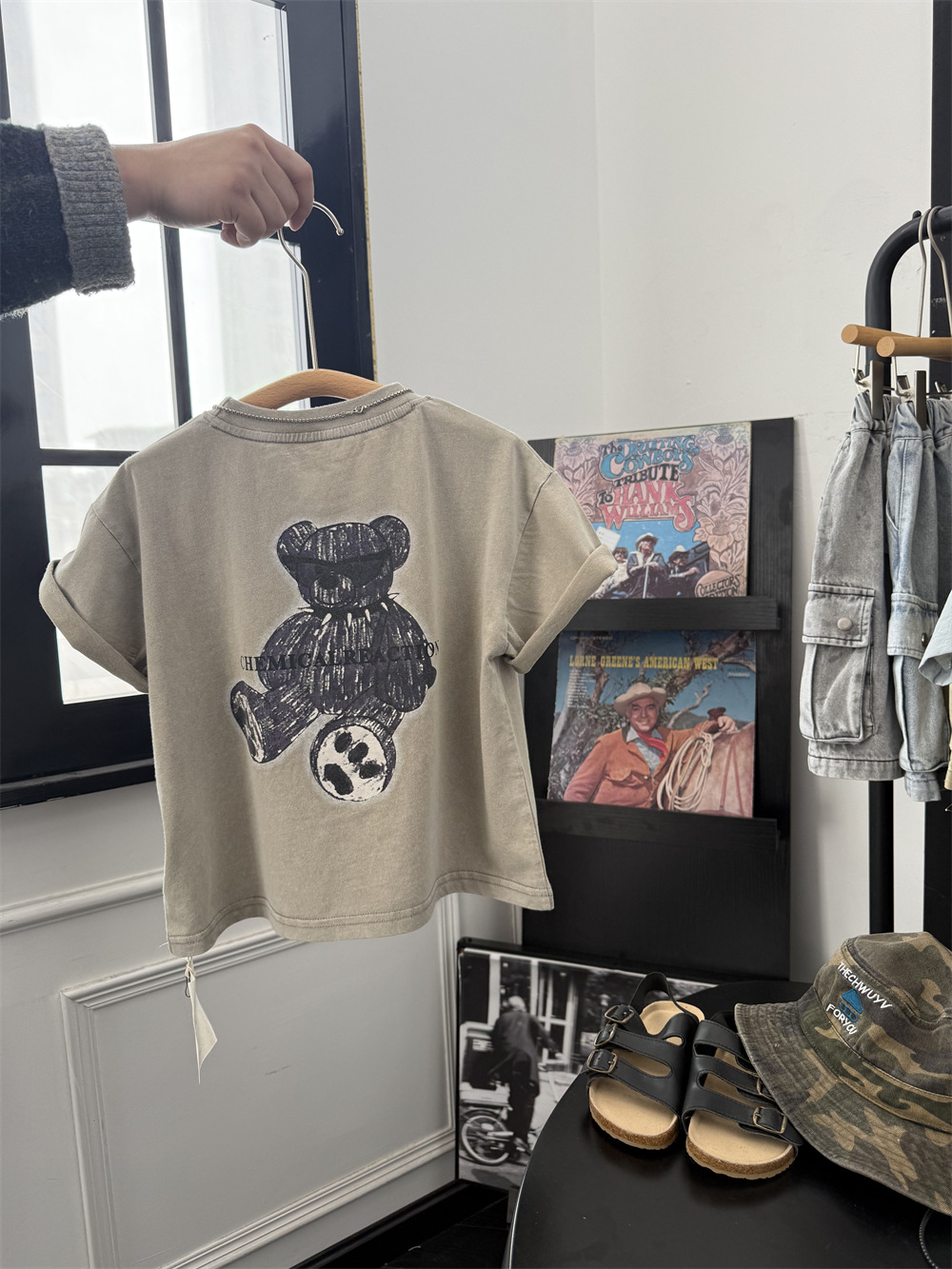 2025 아동복 여름 어린이 미국 모래 세척 늙은 곰 짧은 소매 티셔츠 소년 소녀 잘 생긴 복고풍 튀긴 색 반