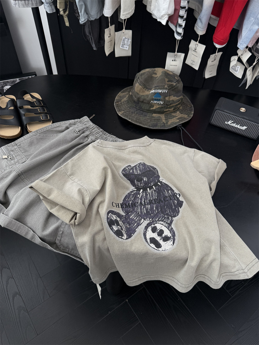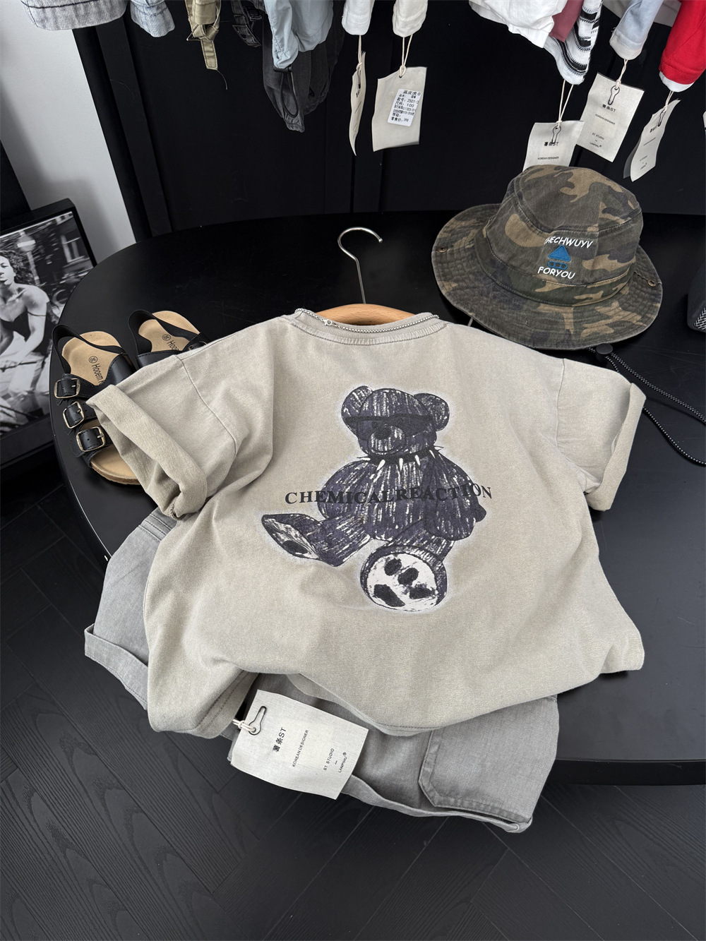 2025 아동복 여름 어린이 미국 모래 세척 늙은 곰 짧은 소매 티셔츠 소년 소녀 잘 생긴 복고풍 튀긴 색 반스토어 가기