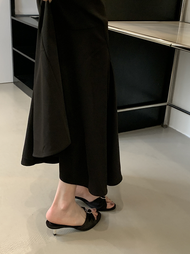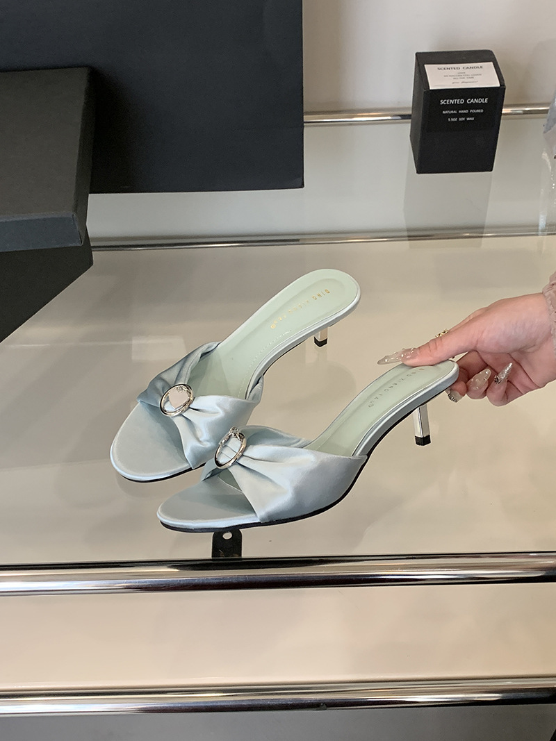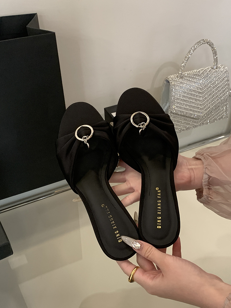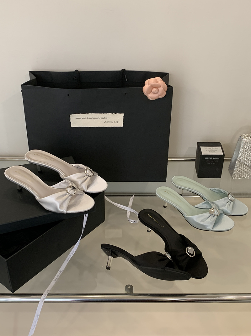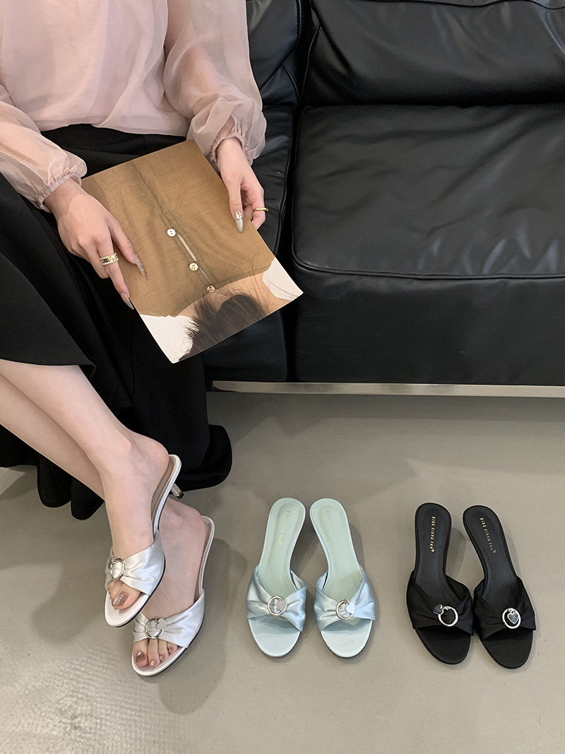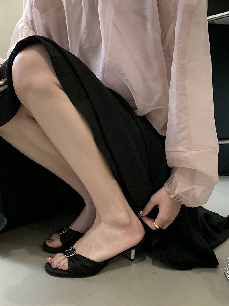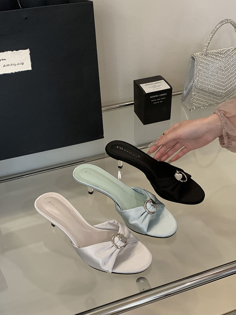 2025 여름 패션 오픈 발가락 여성 신발 간단한 우아한 라운드 발가락 새틴 샌들 프랑스 틈새 금속 버클 고양이 뒤꿈치 신발스토어 가기