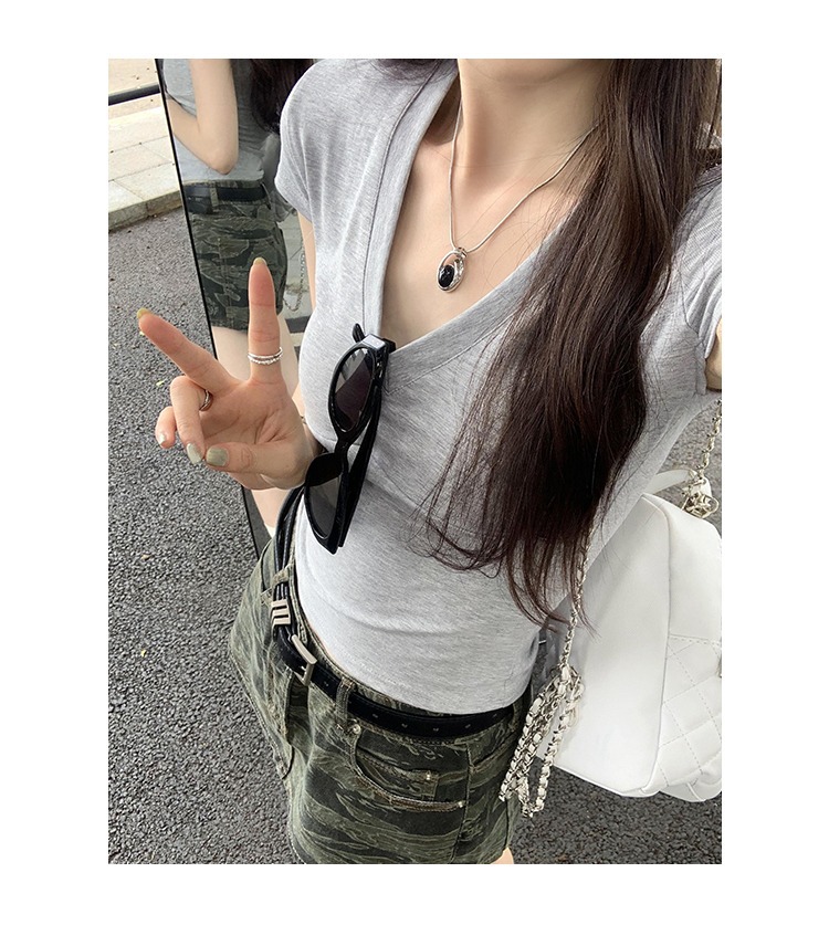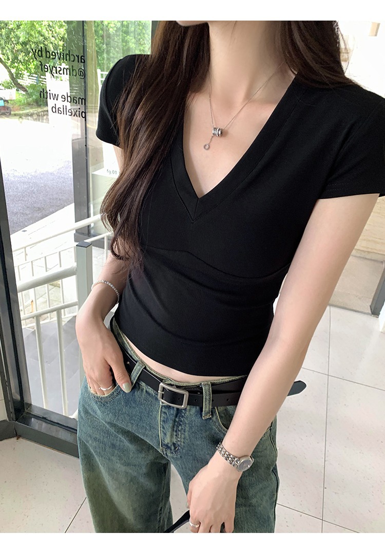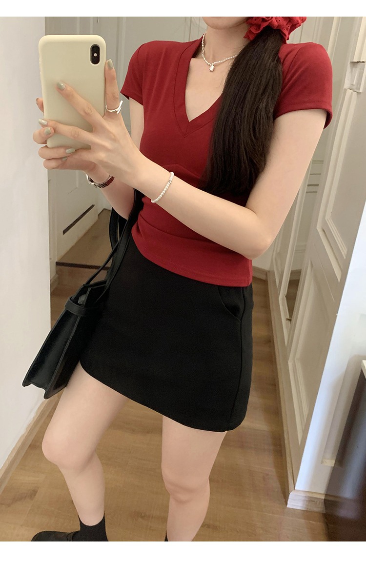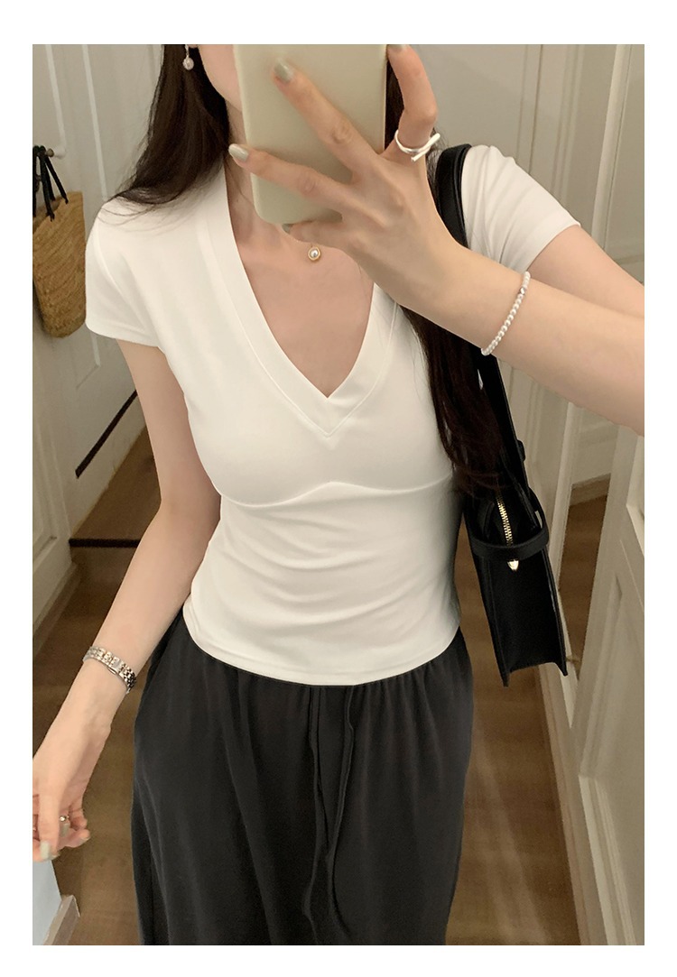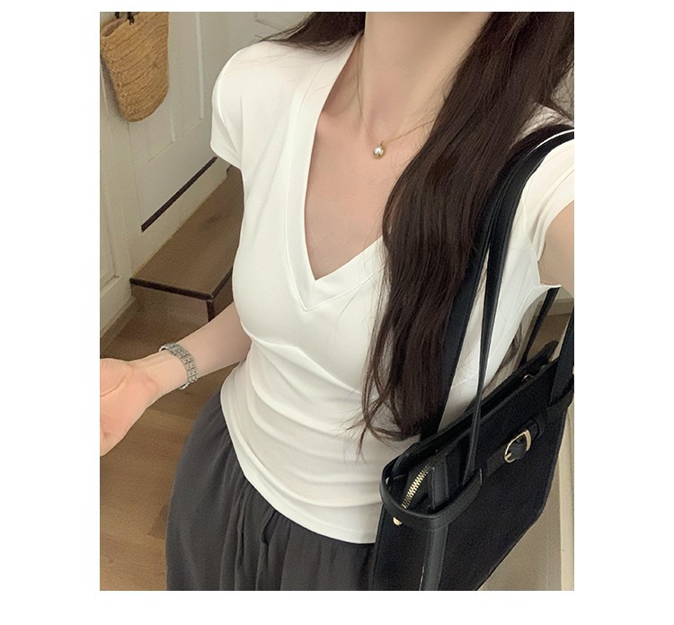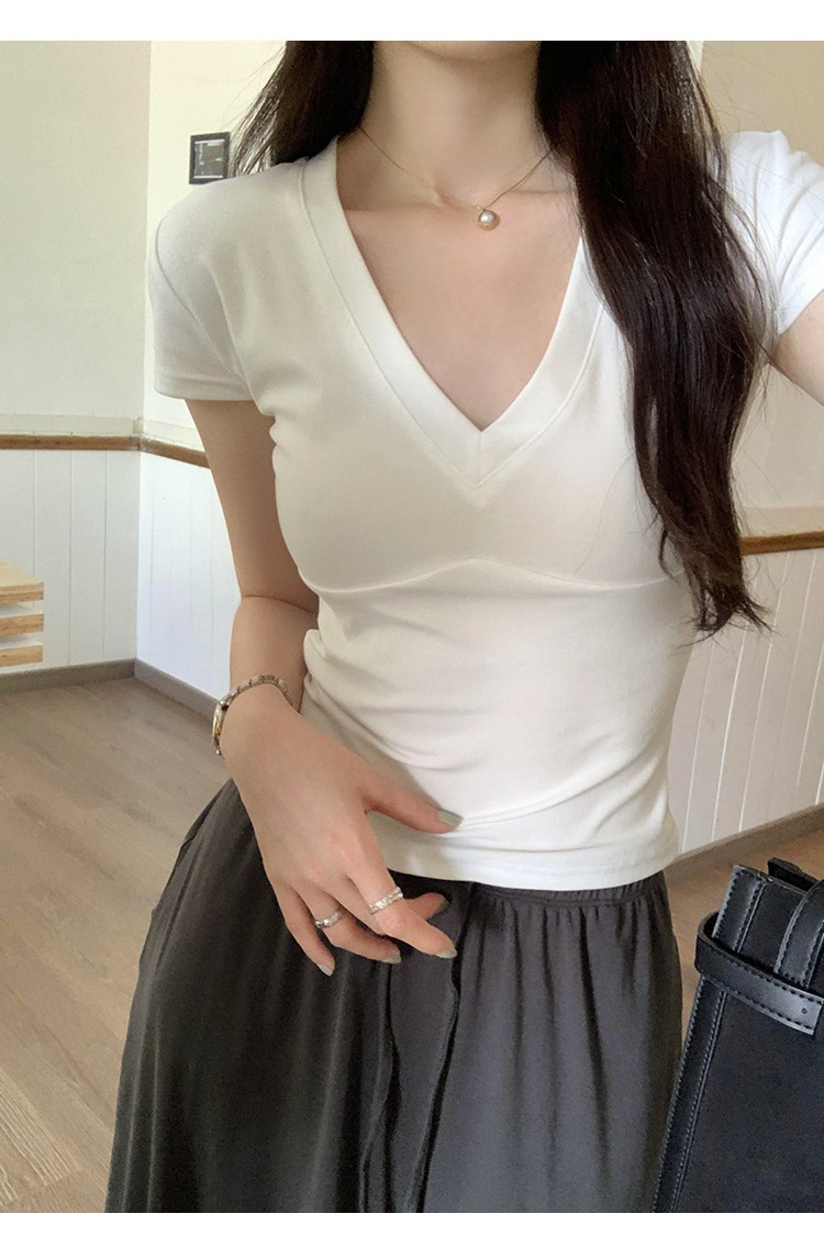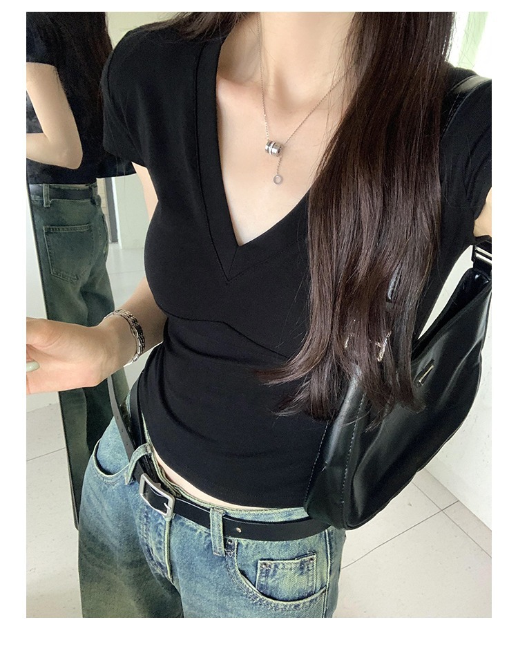 [레이온 260g 좋은 품질] 세련된 스플릿 스티칭 v-neck 짧은 소매 티셔츠 여성의 여름 어깨 쇼트 탑