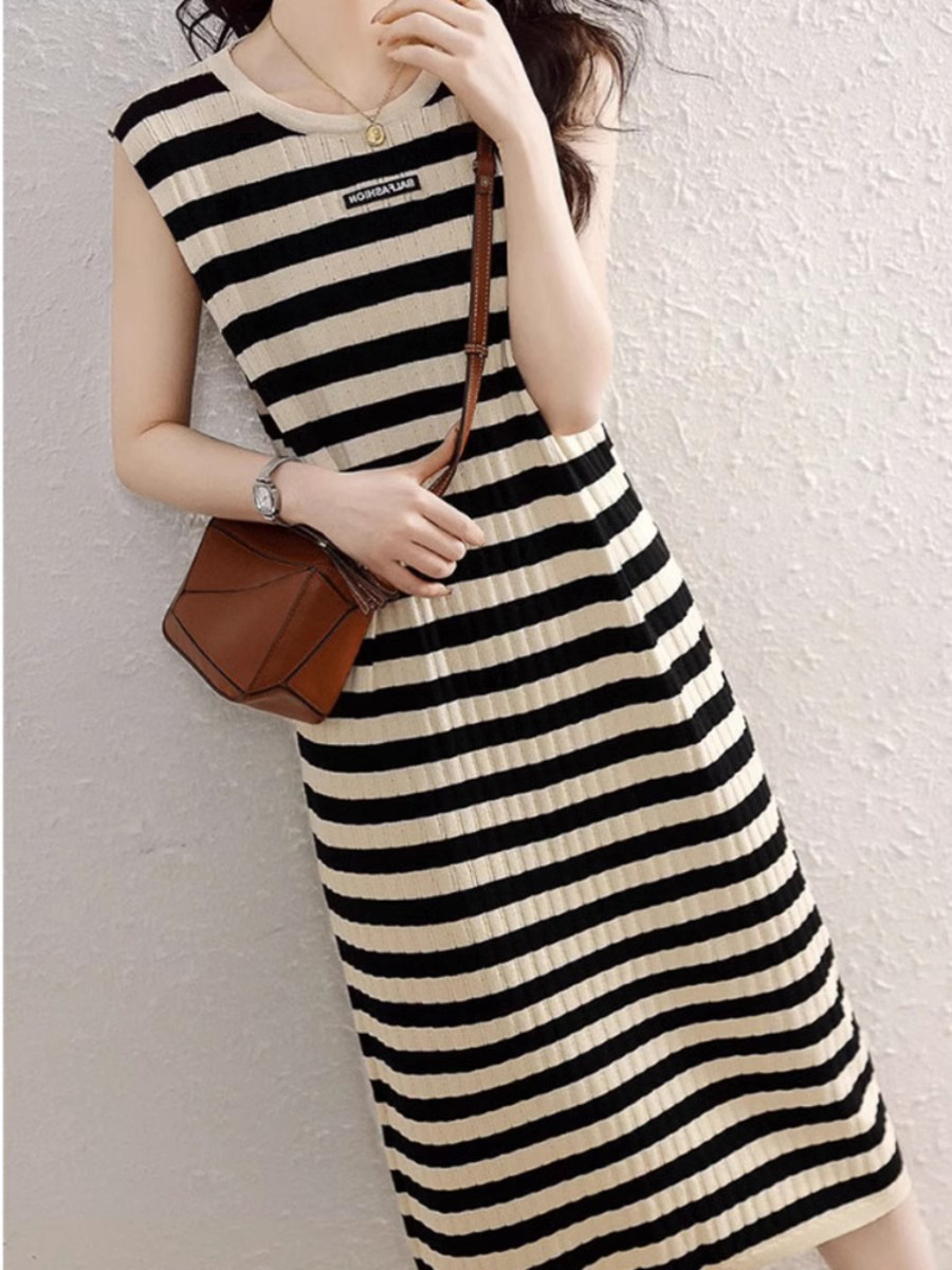 느슨한 슬림 줄무늬 민소매 조끼 원피스 여성 여름 2025 새로운 캐주얼 니트 롱 스커트