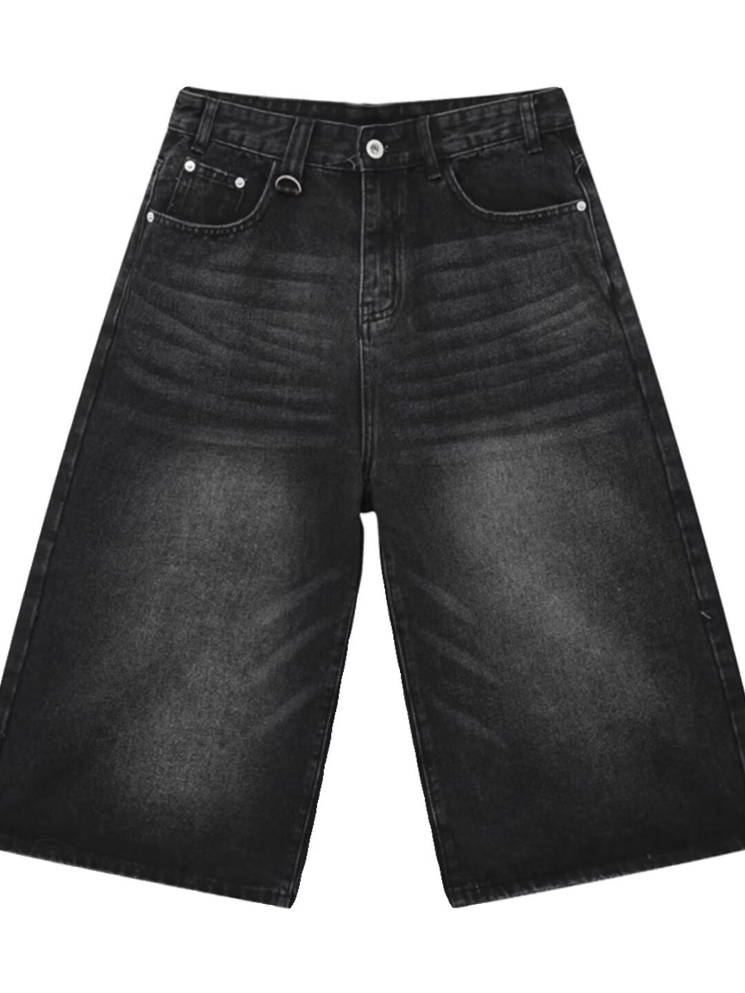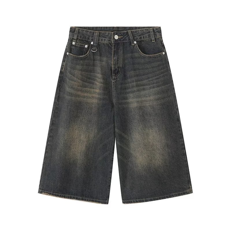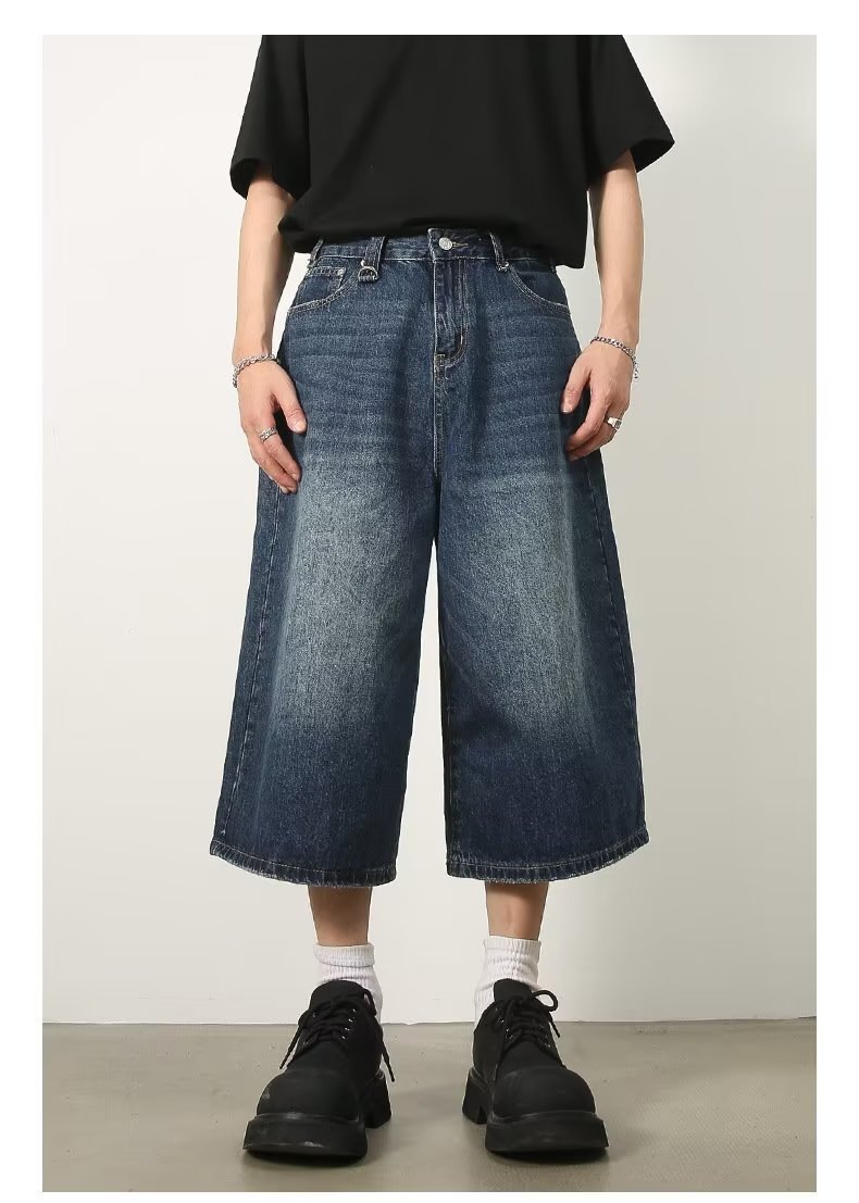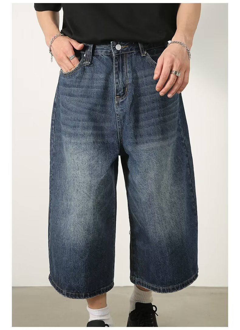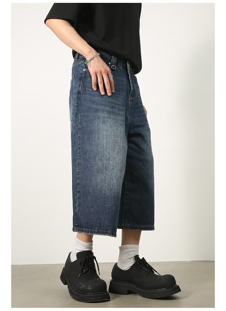 여름 틈새 올 매치 아메리칸 스타일 레트로 올드 블루 데님 반바지 남자 느슨한 스트레이트 와이드 레그 자른 바지