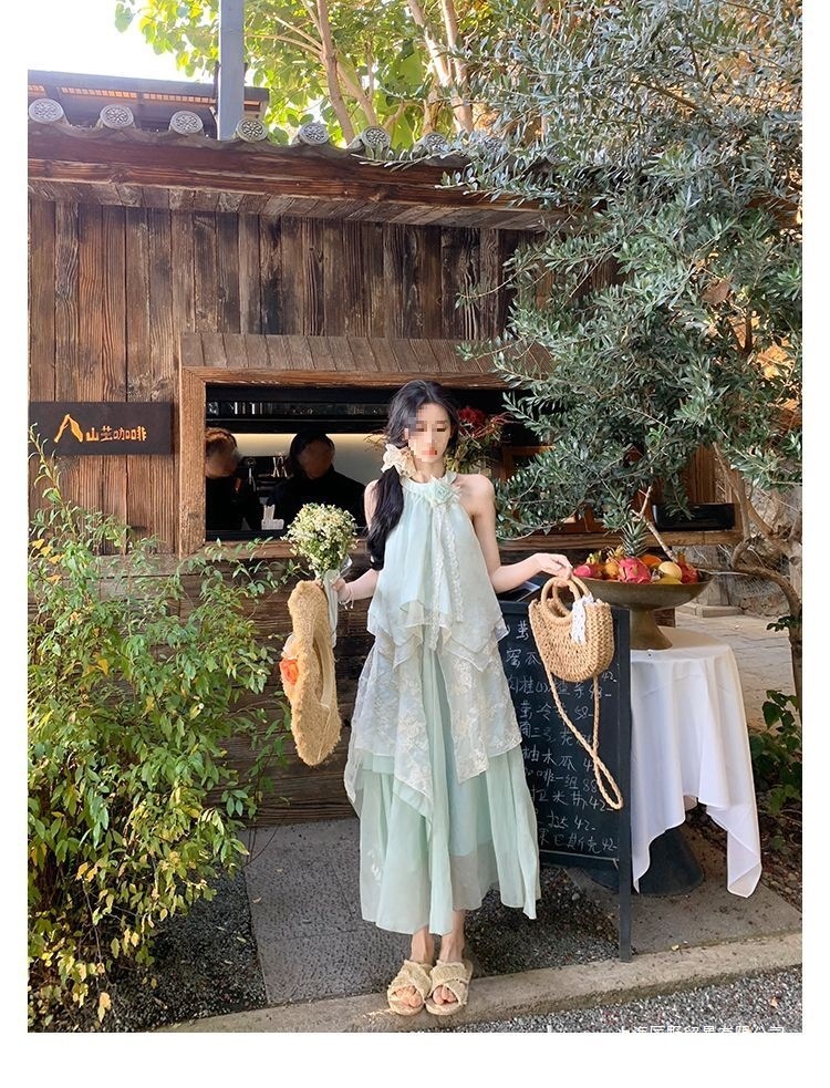 민소매 목 매달려 원피스 여름 기질 부드러운 슈퍼 요정 여름 여행 휴일 긴 치마