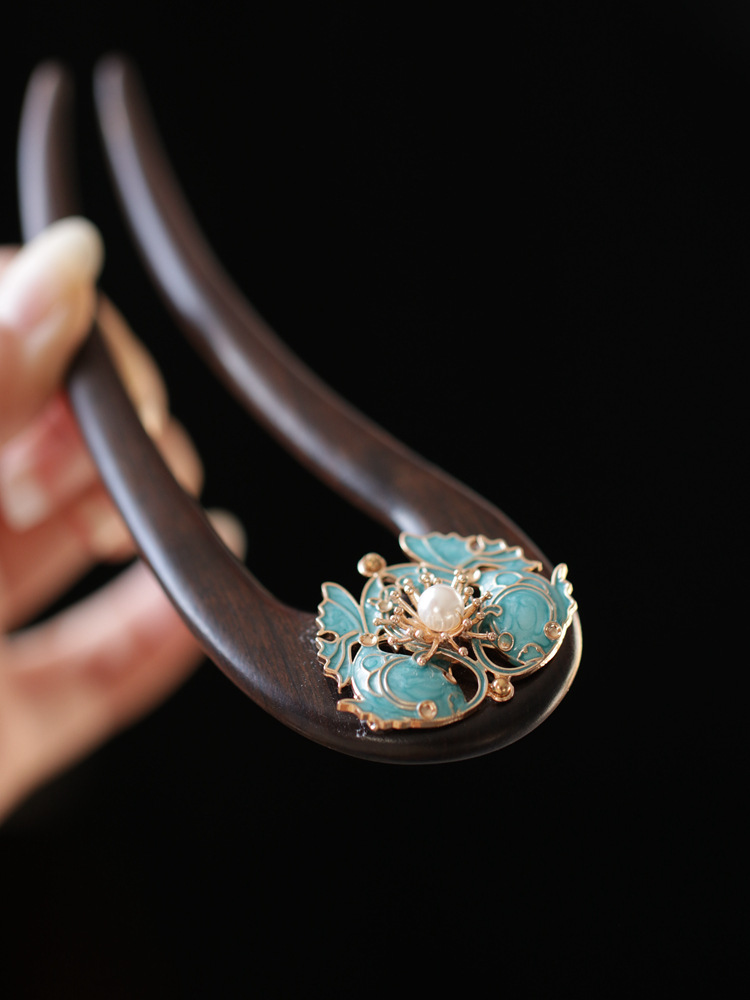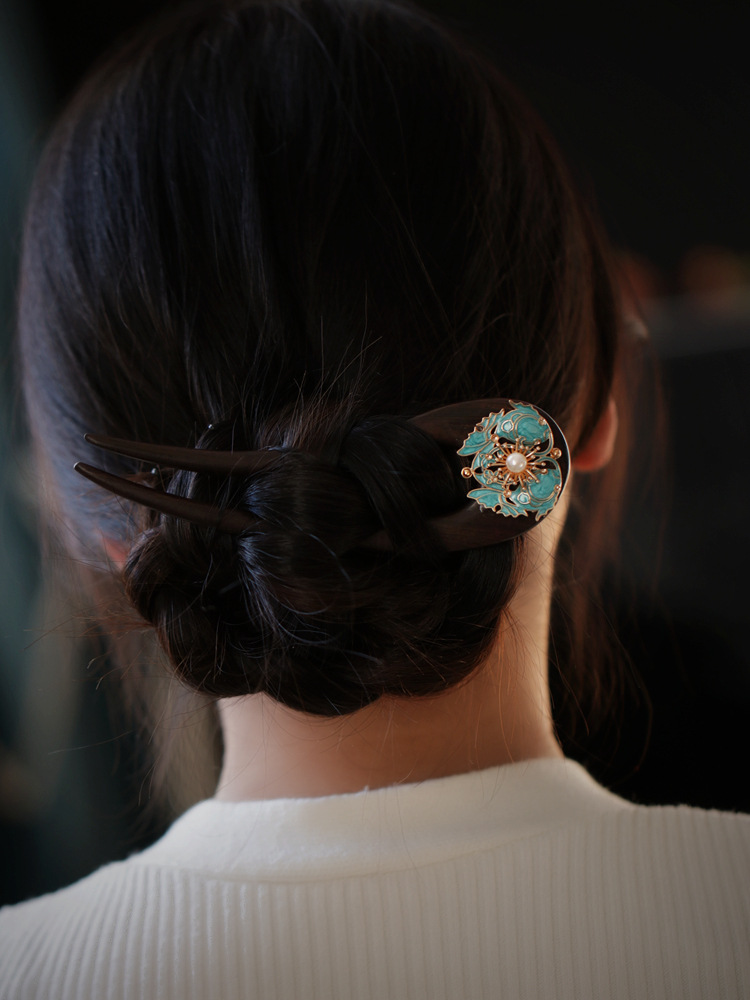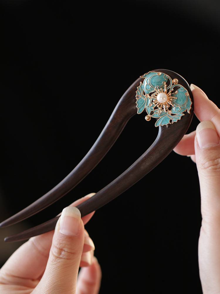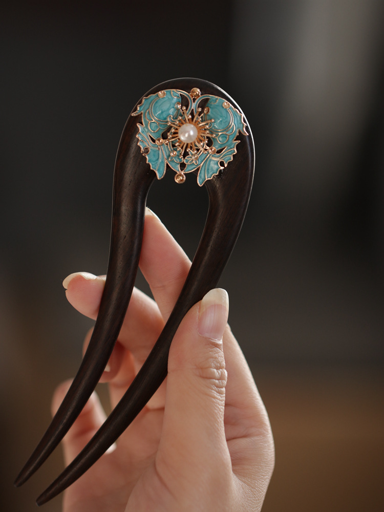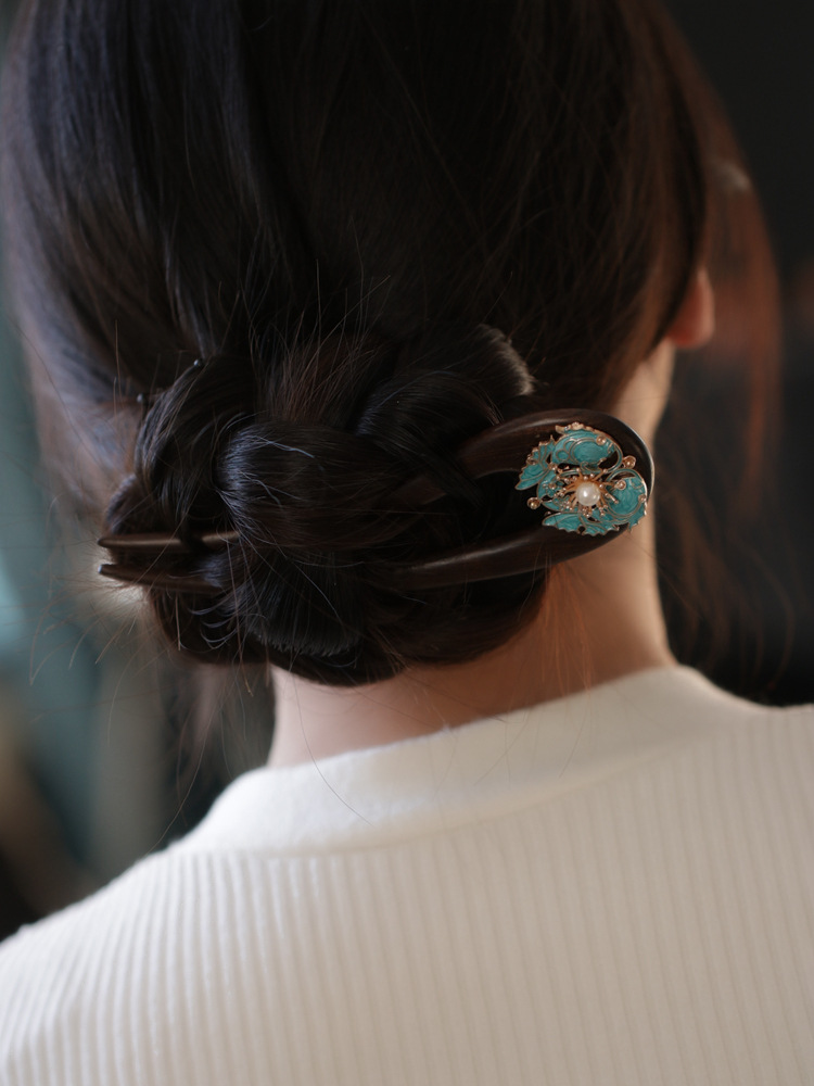 새로운 중국식 잉어 불타는 블루 더블 삽입 헤어핀 여성용 골동품 하이 엔드 나무 헤어핀 U 자형 헤어핀 청삼 액세서리
