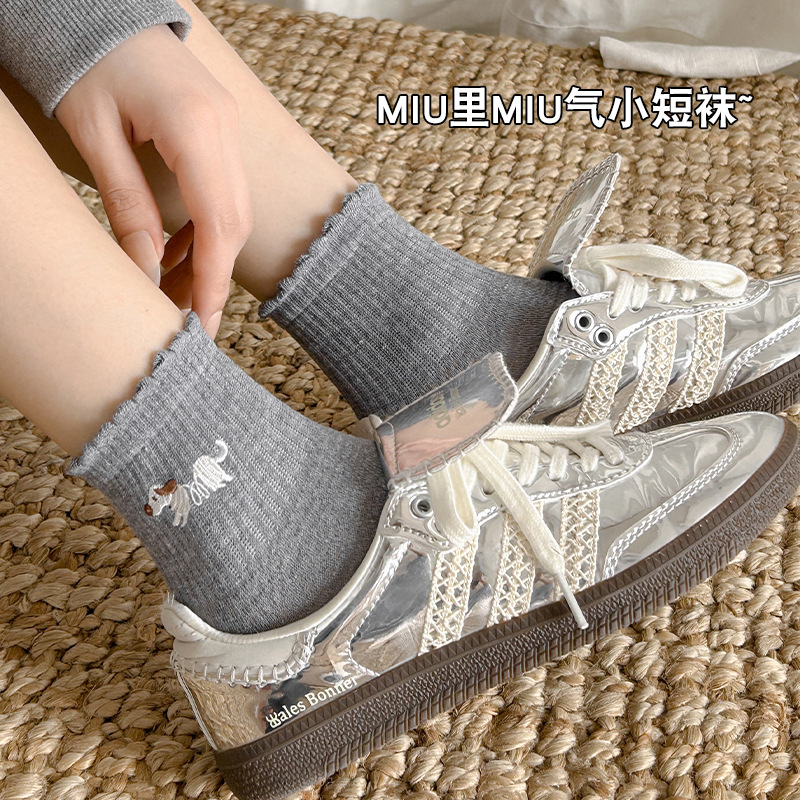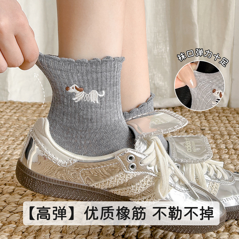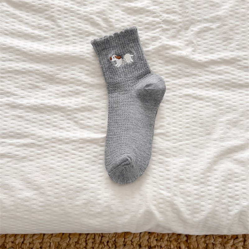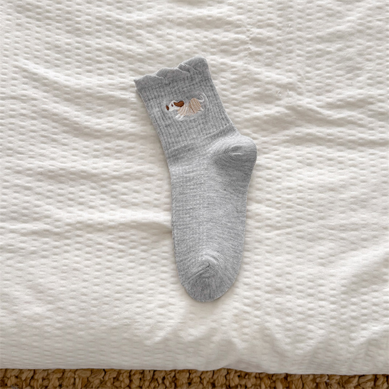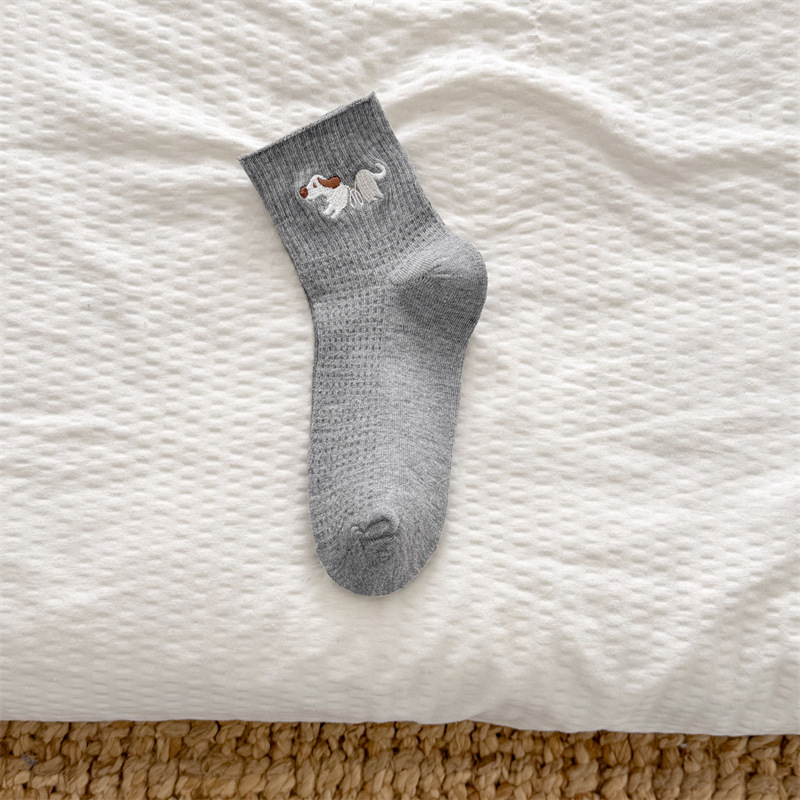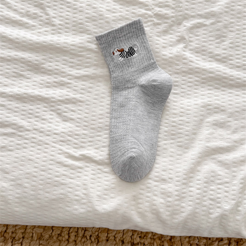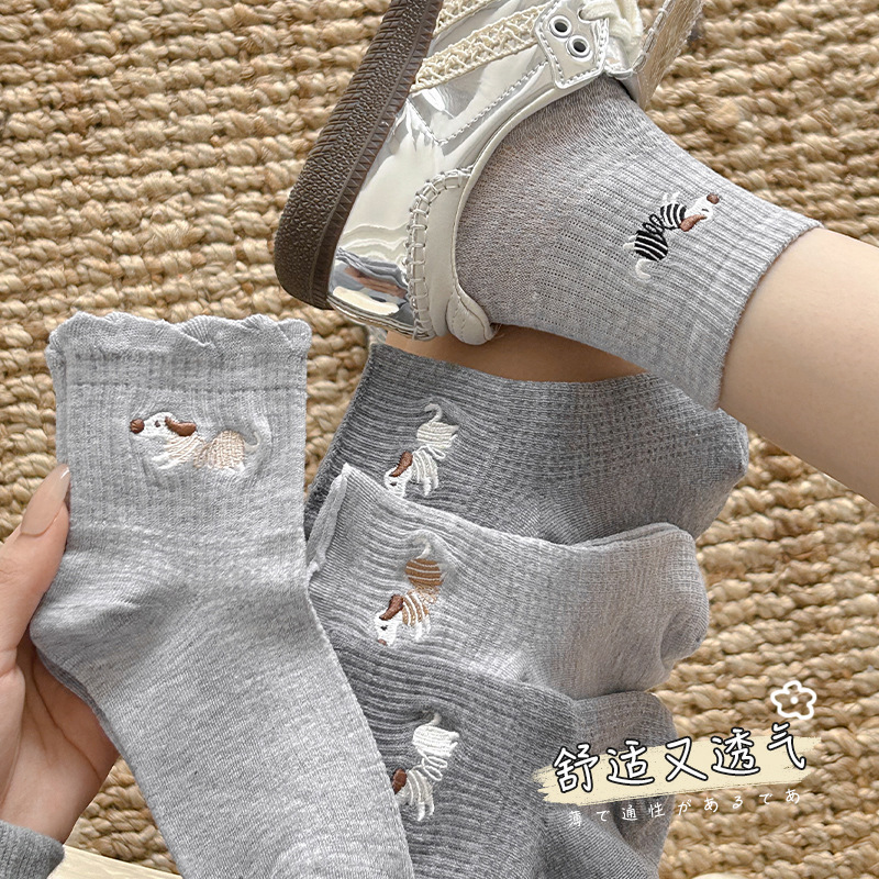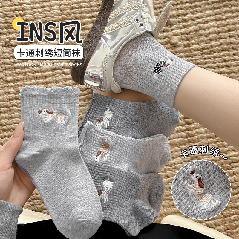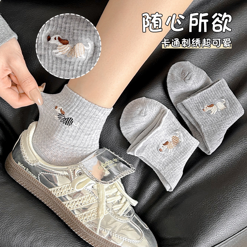 양말 여성의 봄과 가을 자수 귀여운 만화 강아지 단색 여름 회색 짧은 양말 Instagram 스타일 일본식 짧은 양말