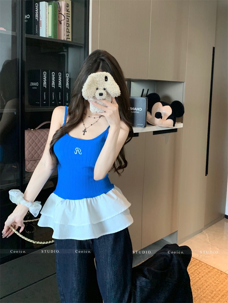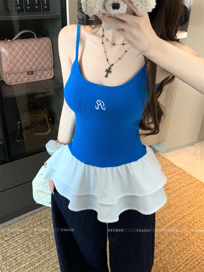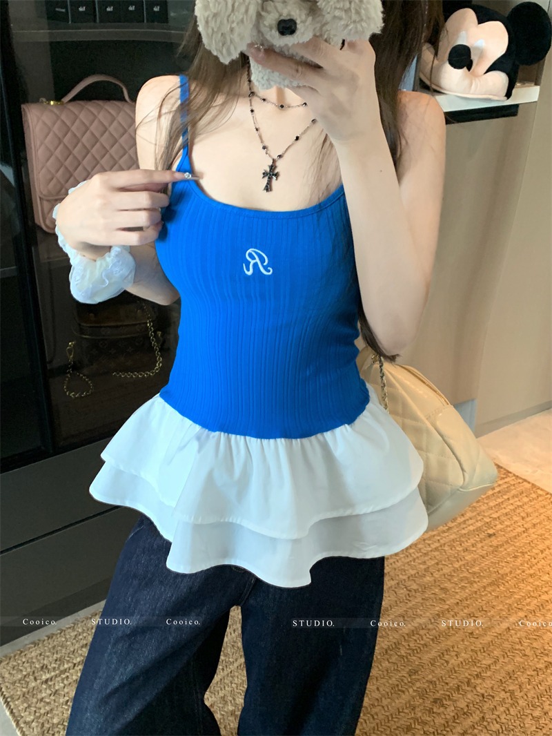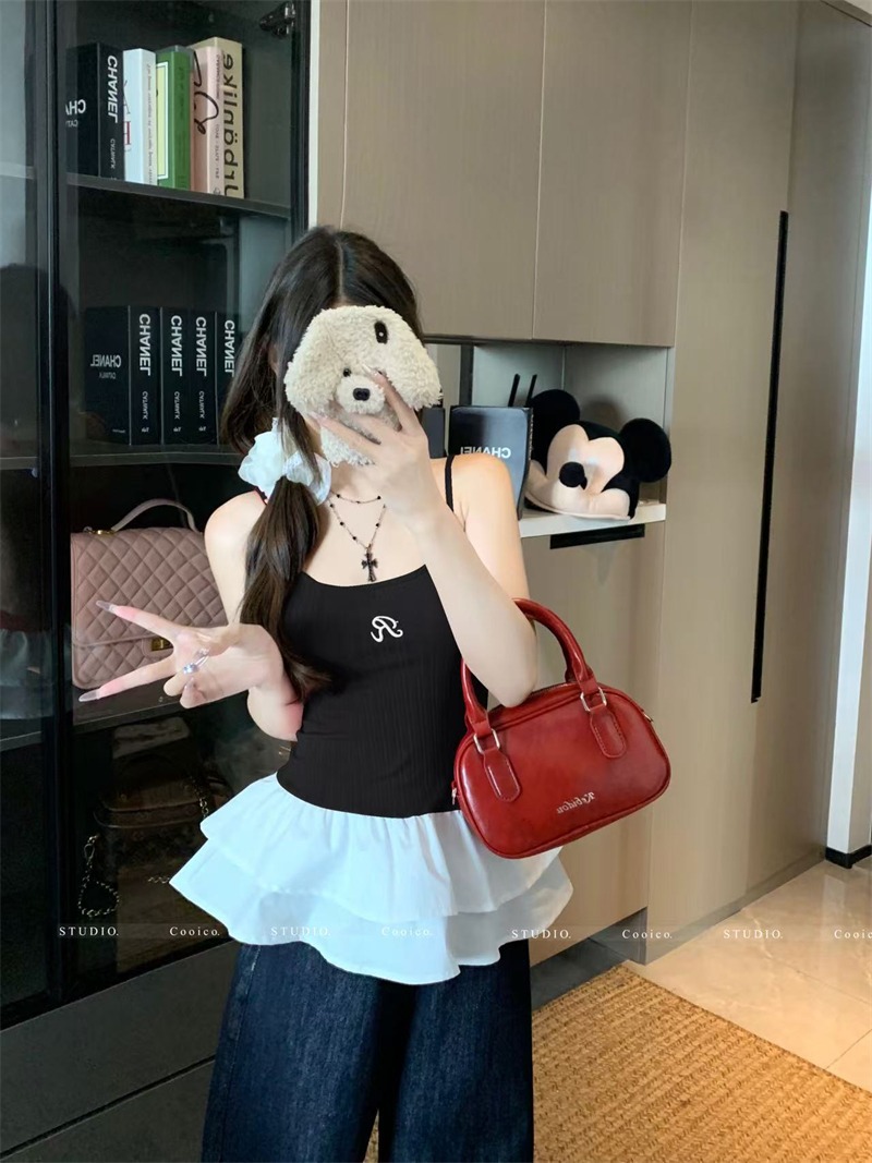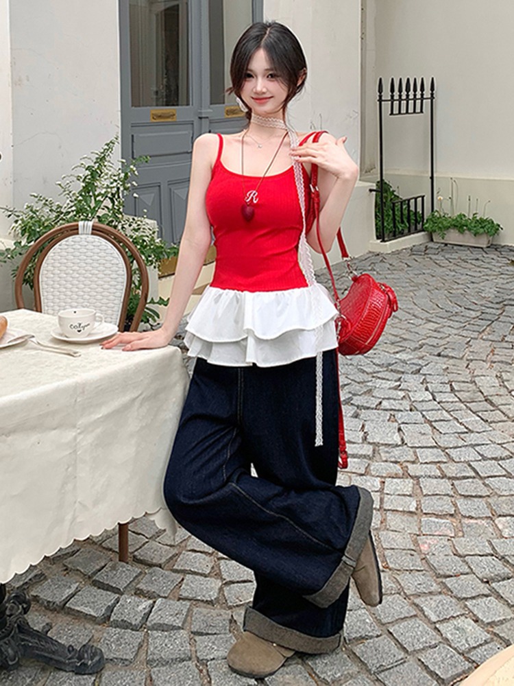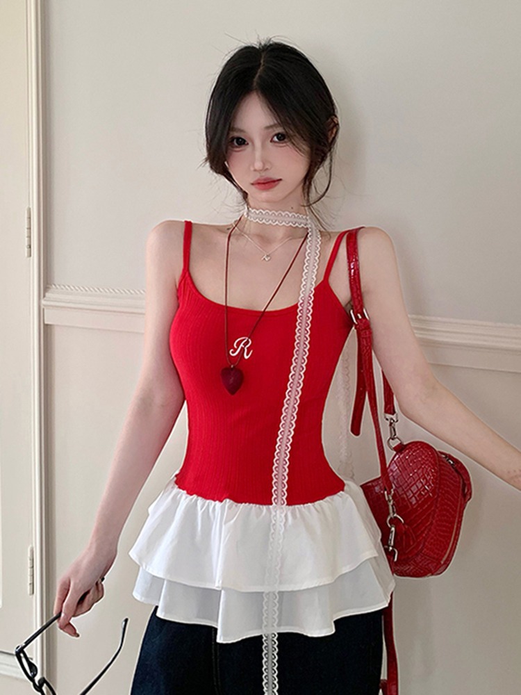 [원래 품질] 발레 스타일 레드 카미솔 여성 여름 레이스 짧은 스위트 스파이스 탑