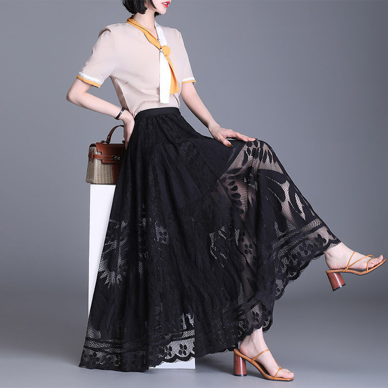플러스 사이즈 레이스 스커트 2024 새로운 패션 올 매치 롱 스커트 대형 스윙 메쉬 할로우 요정 주름 치마스토어 가기