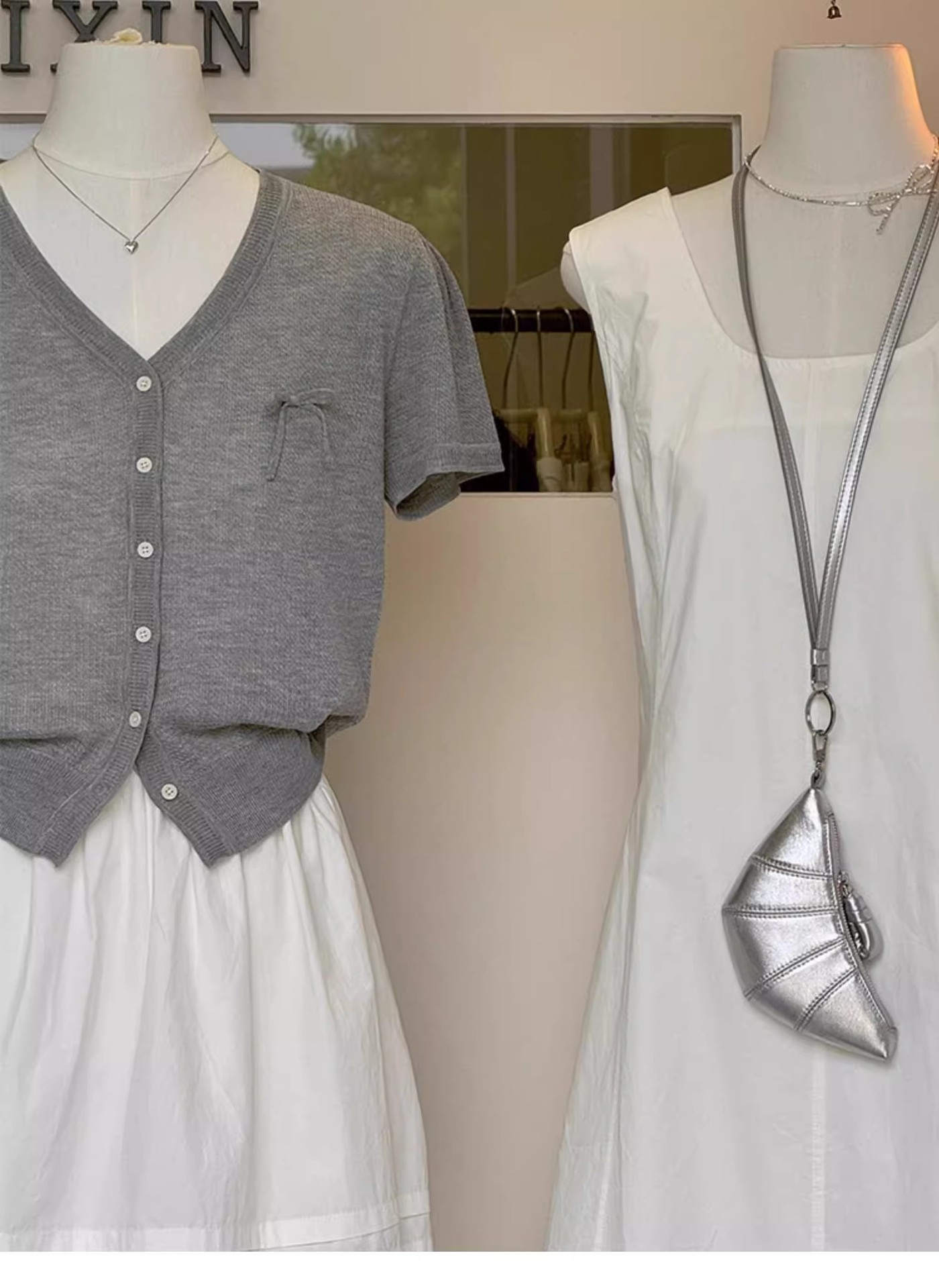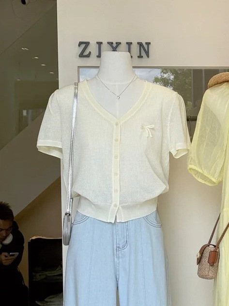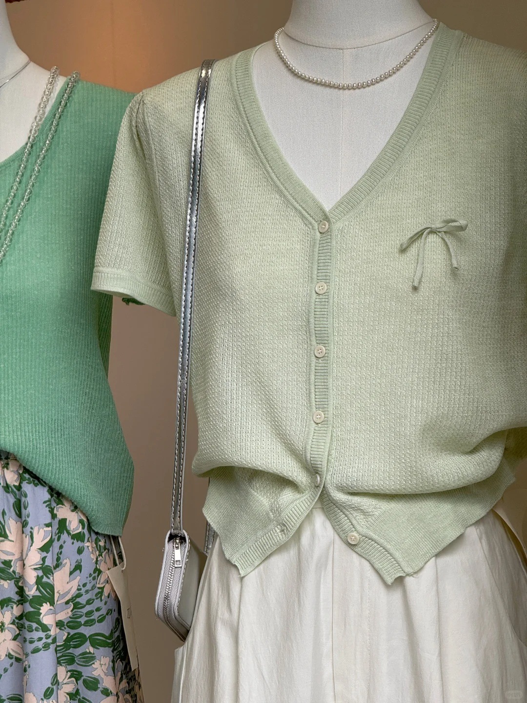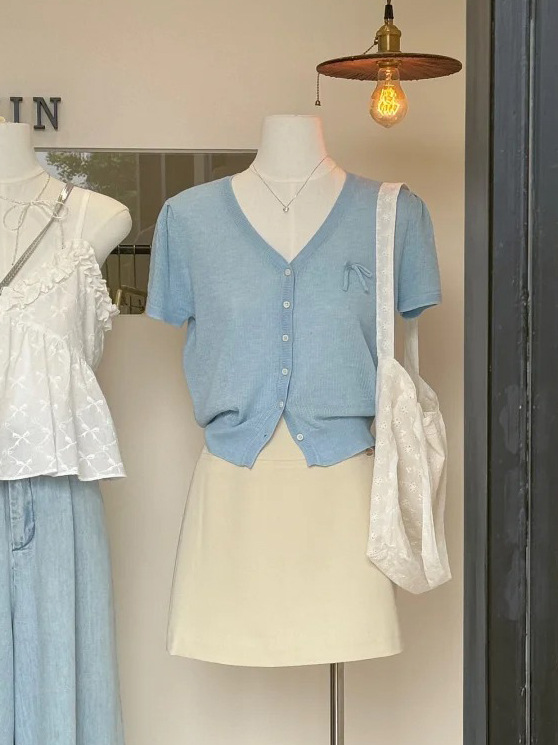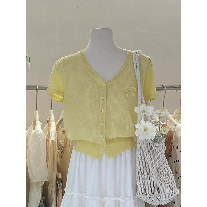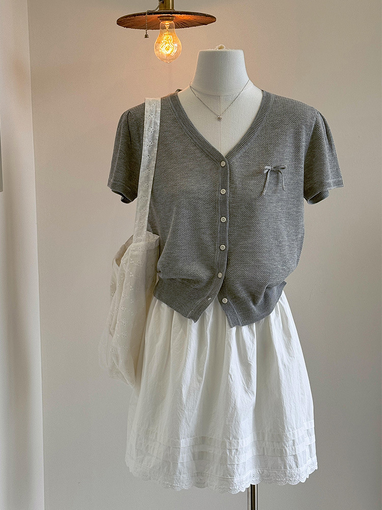 한국 스타일 그레이 아이스 실크 보우 V 넥 반팔 니트 티셔츠 여성 여름 작은 슬림 핏 짧은 칙 탑스토어 가기