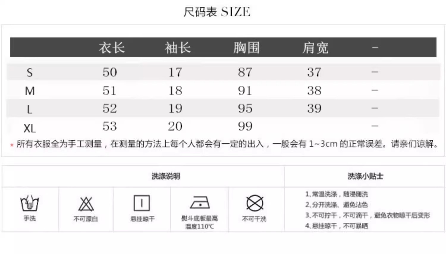 因裁剪工艺和丈量手法不同,可能存在1~3CM 左右误差,尺码仅供参考,以实物为准